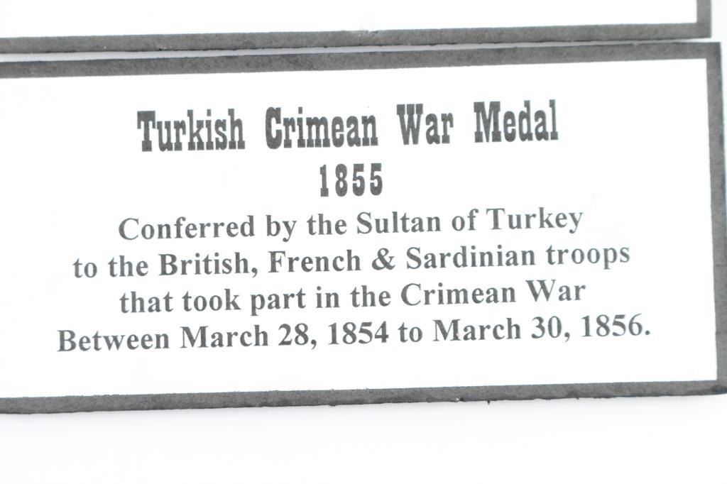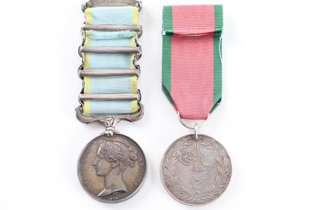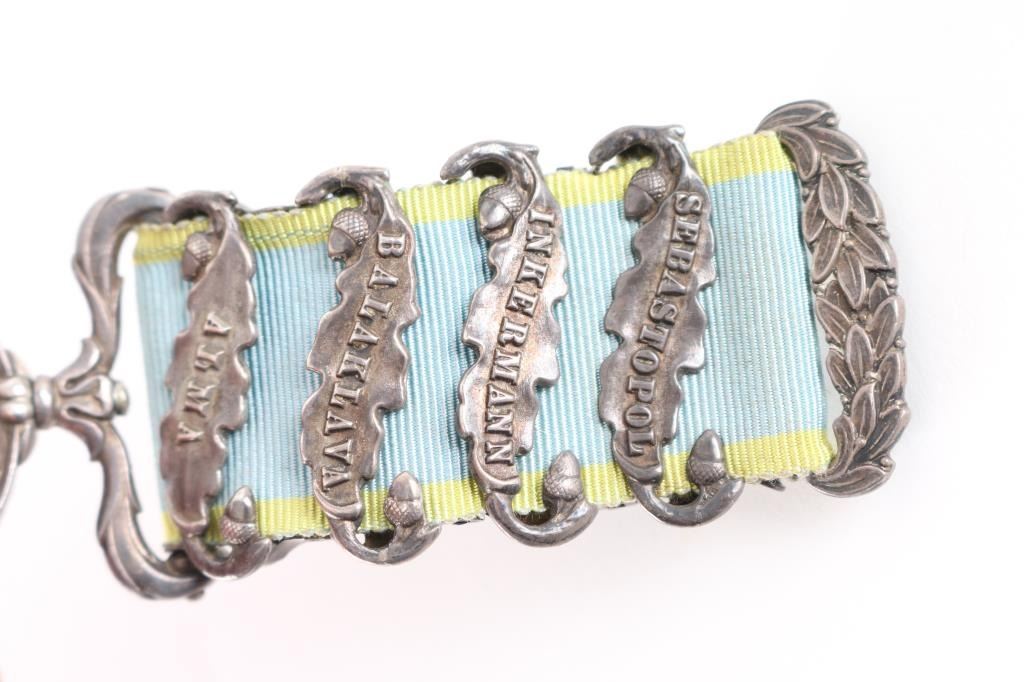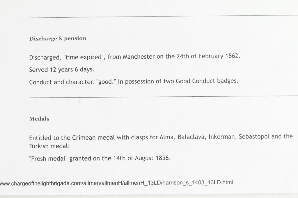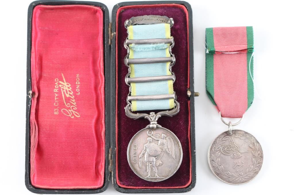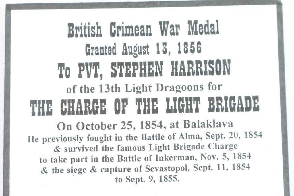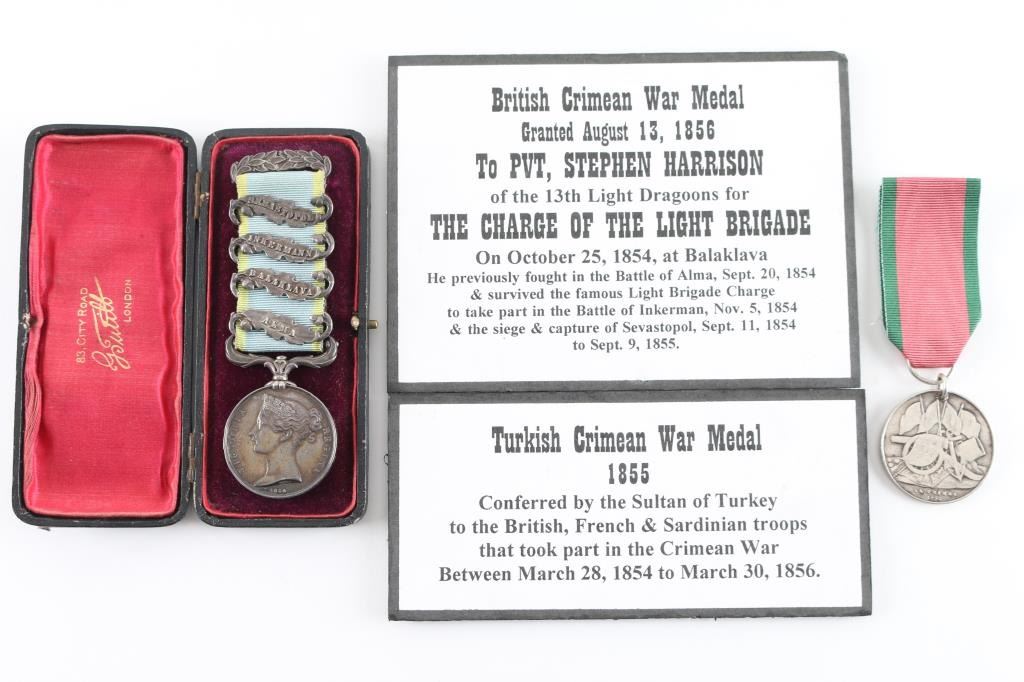 Offered is an exceptional piece of military history, a British Crimea 4 bar medal awarded to Private Stephen Harrison, 13th Light Dragoons. who is a Light Brigade charger at the famous cavalry charge at Balaklava (alternately spelled "Balaclava"). The 13th Light Dragoons took over 50% casualties, 130 went into action, 61 returned with a loss of 69 men.. 1854-56 Crimean War medal, with 4 campaign clasps ‘SEBASTOPOL’, ‘INKERMANN’, ‘BALAKLAVA’ & ‘ALMA’. The medal is named in is officially impressed to Pvt. S. Harrison 13th Lt Drags. Private Harrison is a confirmed for the 13th light Dragoons at the time of the charge. Pvt. Harrison was born at Kent , near Sandwich and enlisted into the 7th Dragoons Guards at Maidstone on the 18th of February 1850. He transferred to the 13th Light dragoons on the first of July 1850 and served with the regiment in the Crimea at Alma, Balaclava, Inkermann and Sebastopol. He was discharged from Manchester, "time expired" on the 24th of February 1862 and subsequently received two Good Conduct Medals, The Turkish Crimean War Medal, "Fresh" Medal was granted on the 14th of August, 1856. Having served for 12 years and 6 days. The Charge of the Light Brigade was the 25th October 1854. The metal is in excellent condition, with a very nice patina, comes in it's original black leather case with red silk lining, with London maker's mark inside lid. Also comes with his Turkish Crimean 1855 War medal, has wear to the front, smoothing detail to the cannons, and flags. Comes with paperwork confirming the above listed information. Rare opportunity to own one of these Medals.