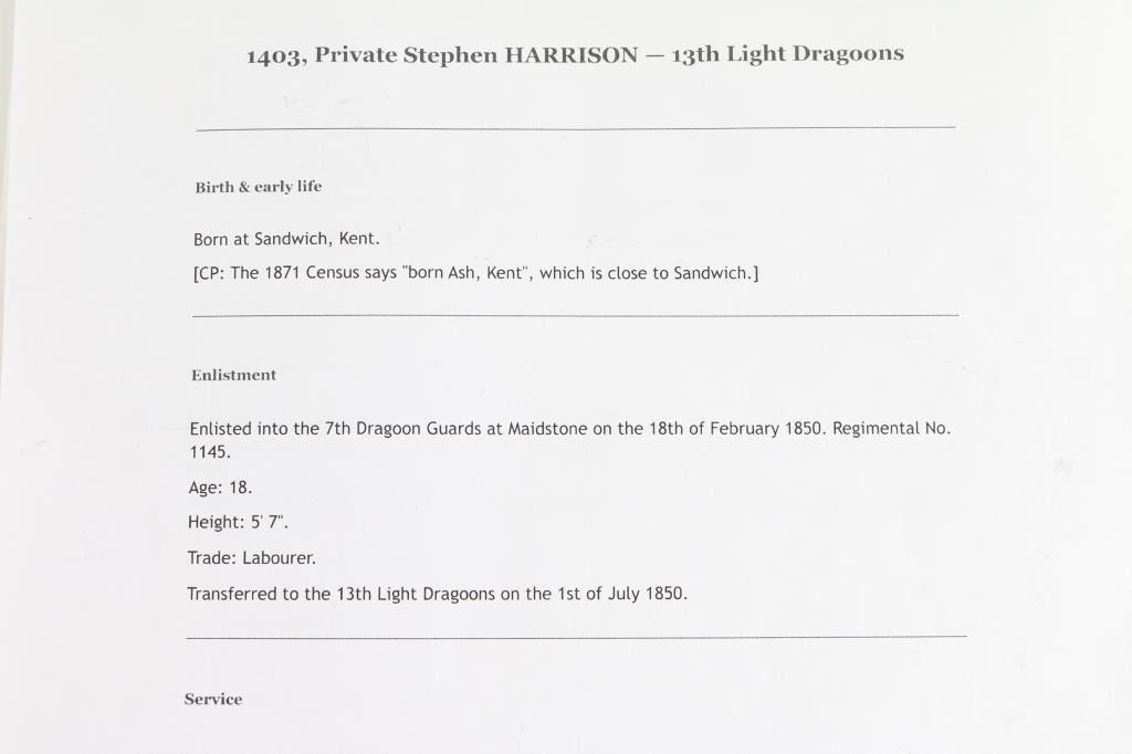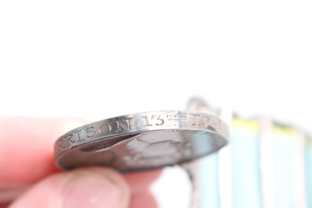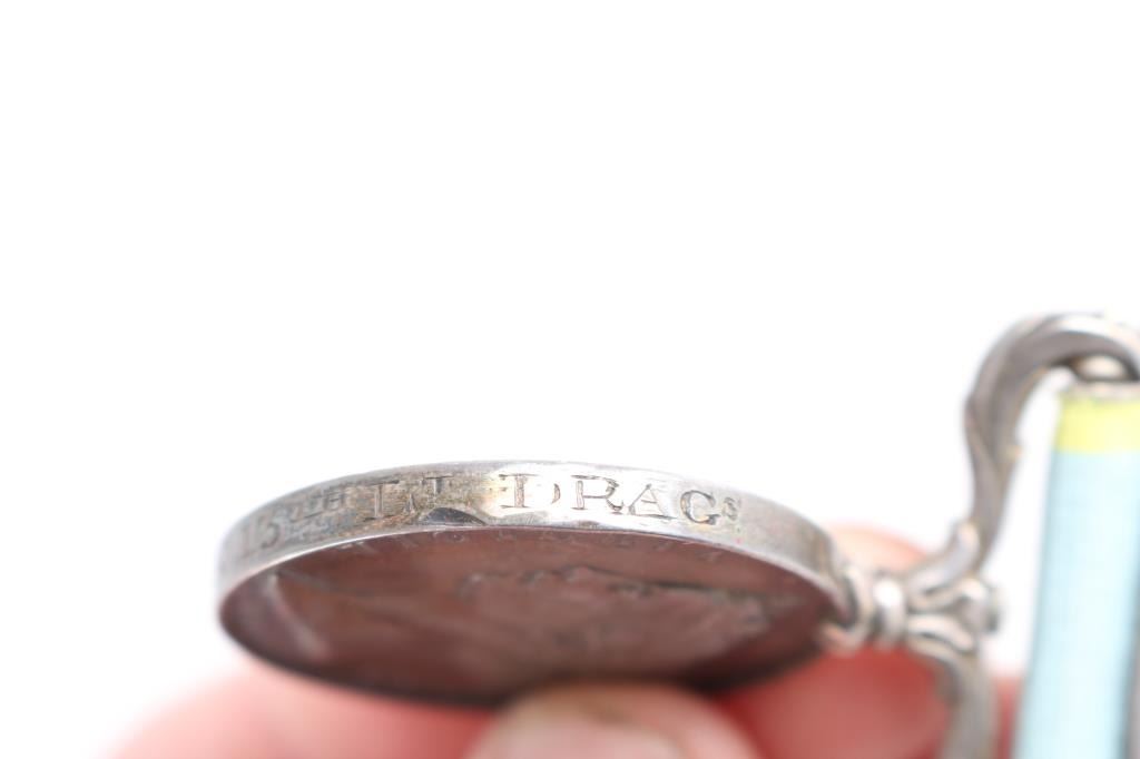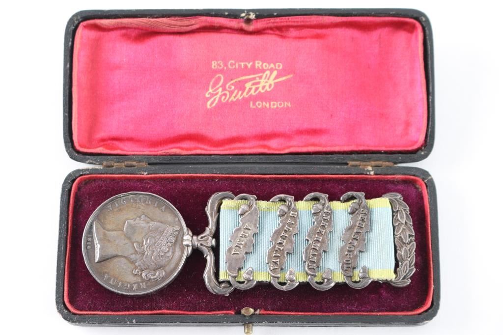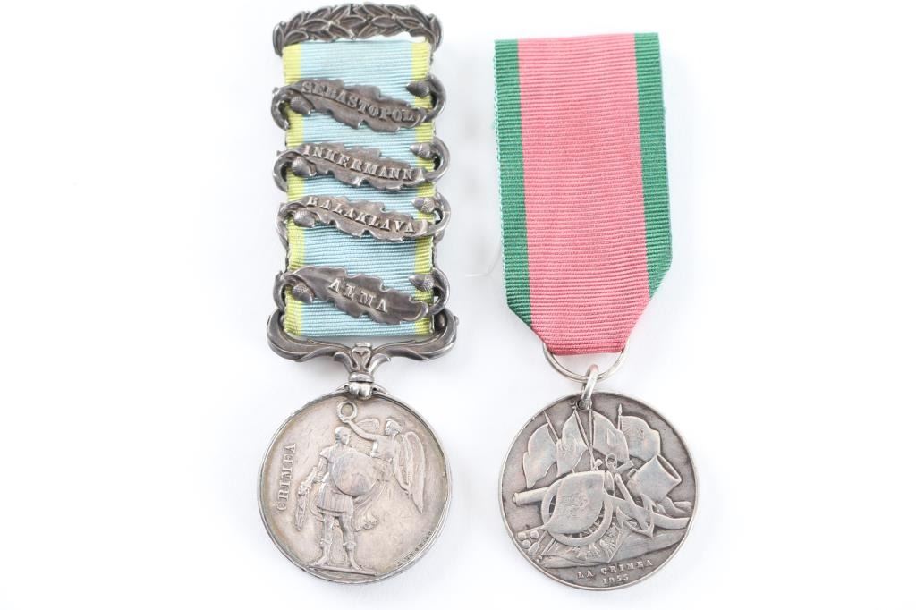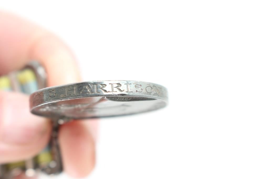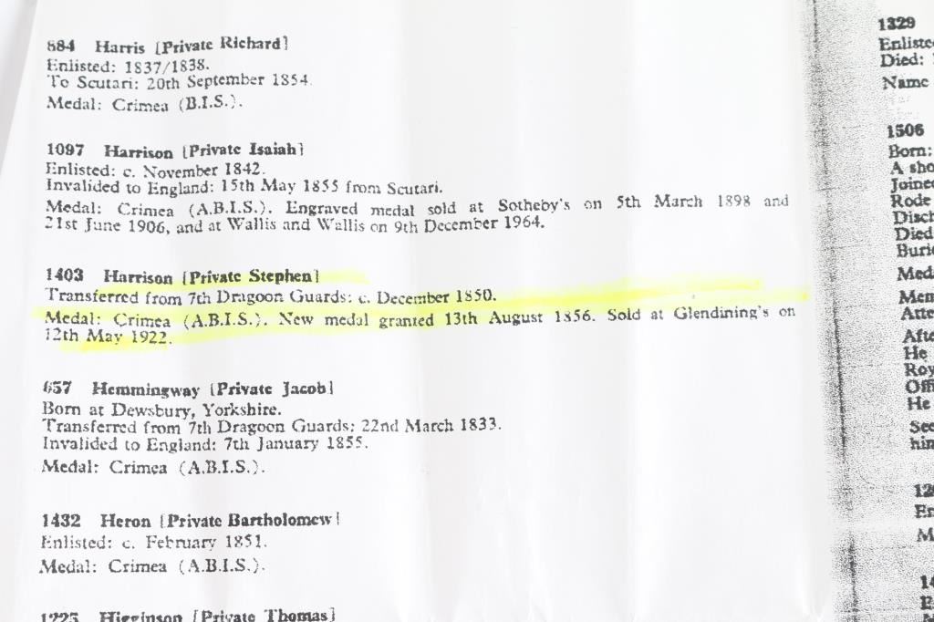 Offered is an exceptional piece of military history, a British Crimea 4 bar medal awarded to Private Stephen Harrison, 13th Light Dragoons. who is a Light Brigade charger at the famous cavalry charge at Balaklava (alternately spelled "Balaclava"). The 13th Light Dragoons took over 50% casualties, 130 went into action, 61 returned with a loss of 69 men.. 1854-56 Crimean War medal, with 4 campaign clasps ‘SEBASTOPOL’, ‘INKERMANN’, ‘BALAKLAVA’ & ‘ALMA’. The medal is named in is officially impressed to Pvt. S. Harrison 13th Lt Drags. Private Harrison is a confirmed for the 13th light Dragoons at the time of the charge. Pvt. Harrison was born at Kent , near Sandwich and enlisted into the 7th Dragoons Guards at Maidstone on the 18th of February 1850. He transferred to the 13th Light dragoons on the first of July 1850 and served with the regiment in the Crimea at Alma, Balaclava, Inkermann and Sebastopol. He was discharged from Manchester, "time expired" on the 24th of February 1862 and subsequently received two Good Conduct Medals, The Turkish Crimean War Medal, "Fresh" Medal was granted on the 14th of August, 1856. Having served for 12 years and 6 days. The Charge of the Light Brigade was the 25th October 1854. The metal is in excellent condition, with a very nice patina, comes in it's original black leather case with red silk lining, with London maker's mark inside lid. Also comes with his Turkish Crimean 1855 War medal, has wear to the front, smoothing detail to the cannons, and flags. Comes with paperwork confirming the above listed information. Rare opportunity to own one of these Medals.