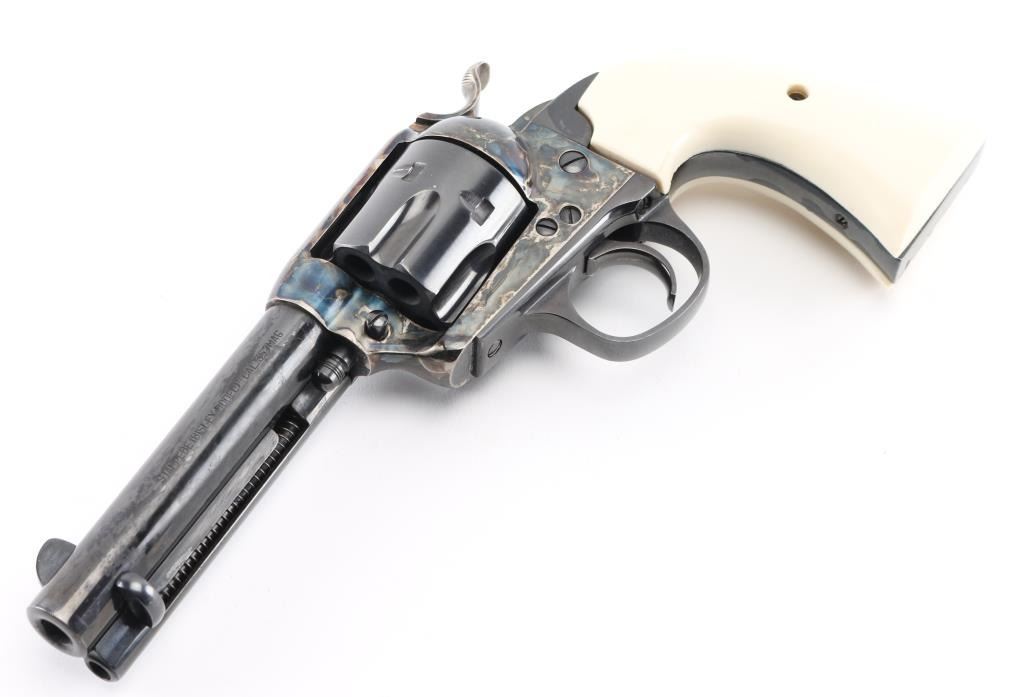 SN: B20236. Single-action revolver, manufactured by Uberti in Italy, imported by Beretta USA, Accokeek MD. blue steel finish, case colored receiver. 4 3/4" barrel, ejector rod, blade front sight, square notched rear sight, fluted six-shot cylinder, smooth wide trigger. knurled hammer spur and one piece faux ivory polymer grips. Metal finish is near very good with some minor tracking and a small rust spot on the cylinder, some small patina spots beginning in several areas, a couple of minor rubs. Some of what appears dried epoxy in several places. Grips are excellent, left panel is a bit loose on frame. Bore/cylinders are excellent/bright. Action is smooth/tight. Serial number matched on frame, cylinder, and loading gate. Condition is NRA Very Good *** Modern Firearm ***