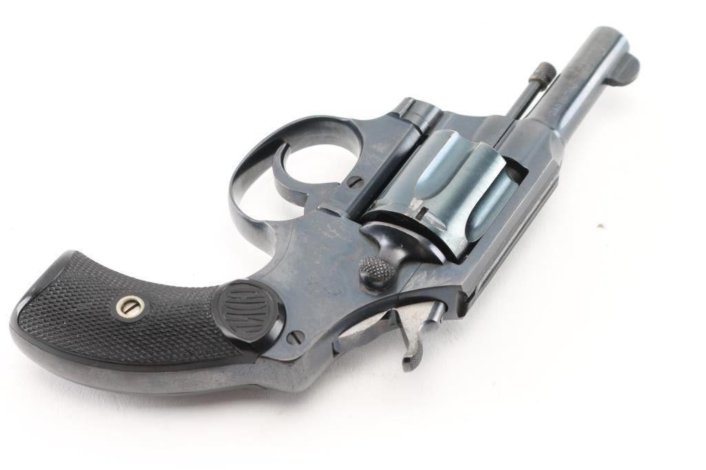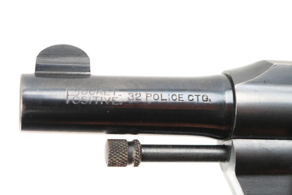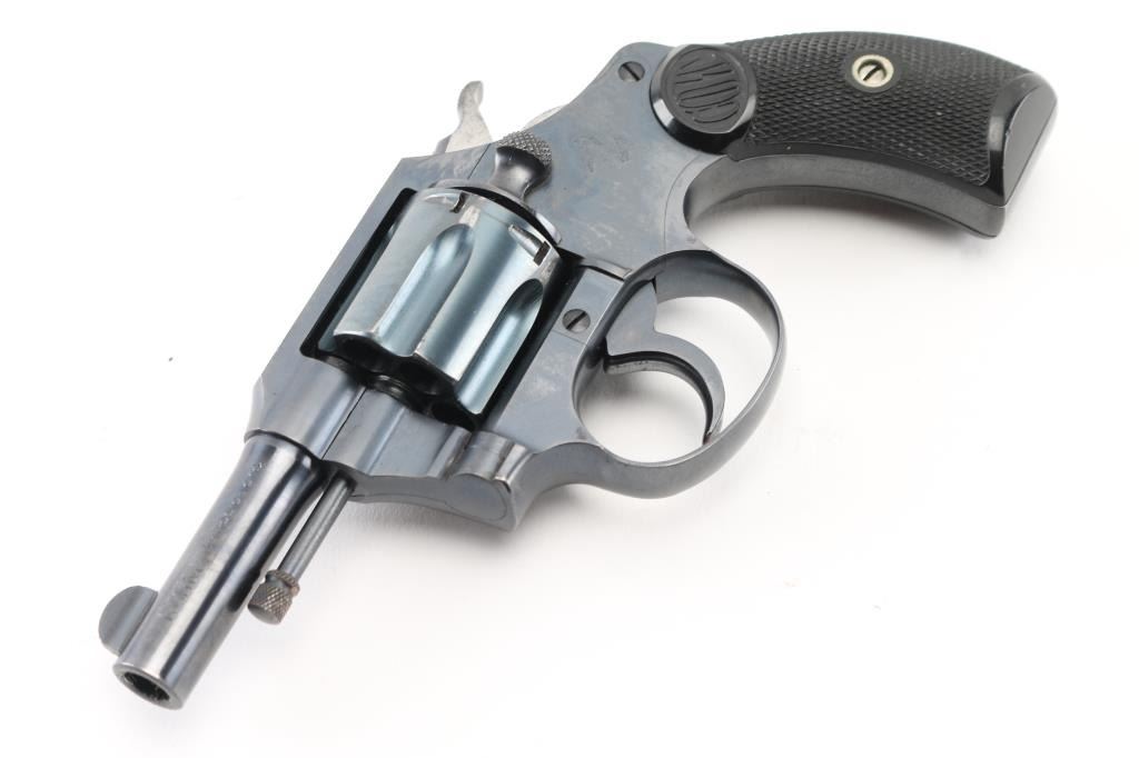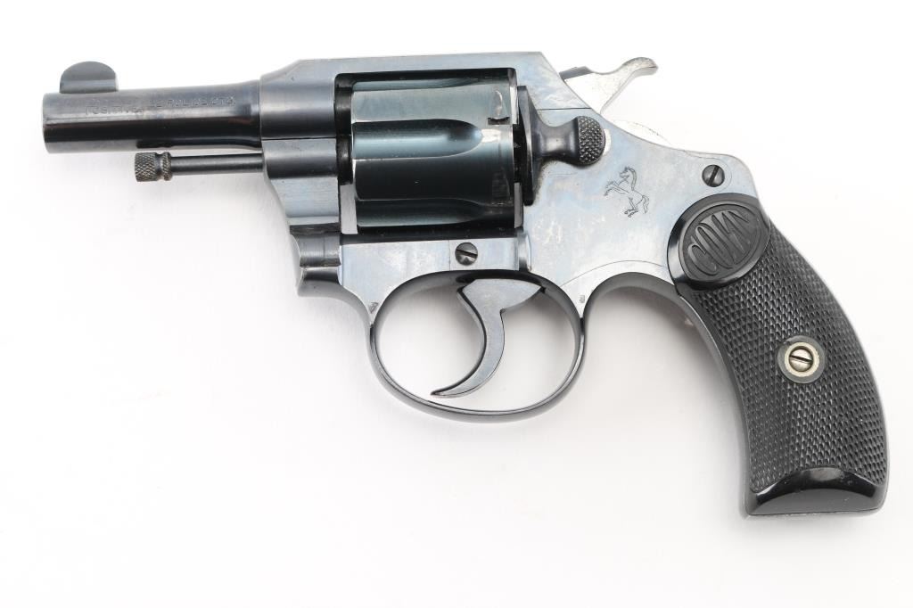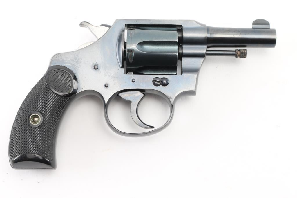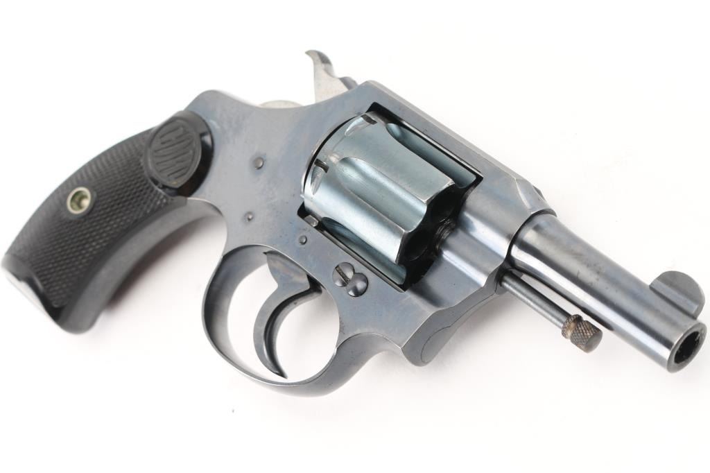 Double-action revolver. 6-rd capacity. This revolver manufactured 1899. Small framed "Pocket" model chambered in .32 New Police. 2 1/2" barrel, with round front blade sight, and cut notch rear sight. Exposed ejector rod. blued metal finish. Black, checkered "Colt" hard rubber grips. Rampant colt on left frame. Colt VP triangle proof on the upper left front of triggerguard. 2-line Colt address, and Patent dates on top of barrel. "Pocket Positive .32 Police CTG." on left side of barrel. Blued hammer with polished sides. Action is crisp/tight. Bore,and cylinder chambers are excellent/bright. Grips are excellent. Original blued metal finish is about 97%, with very minor scratches, tracking on the cylinder. All markings are crisp/clear. NRA Condition-Excellent. C&R Firearm.