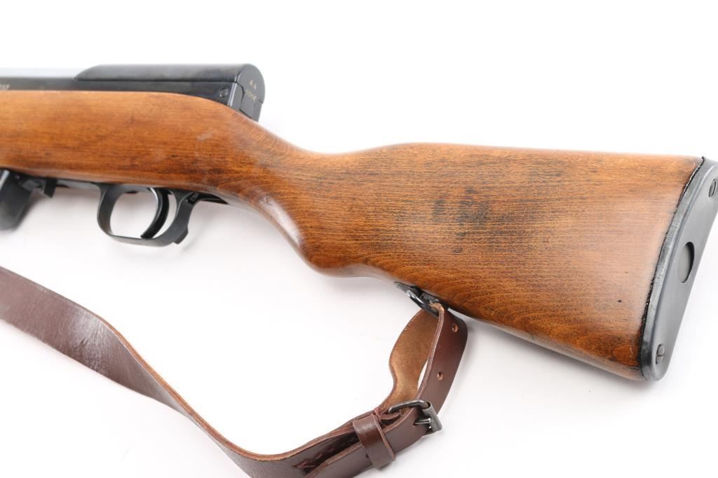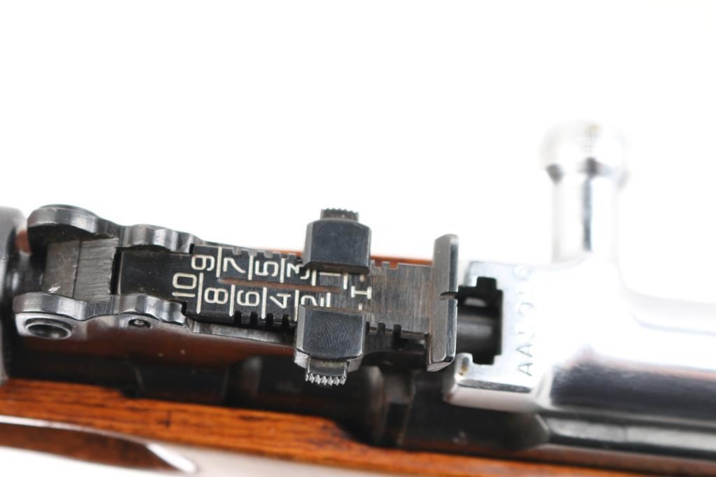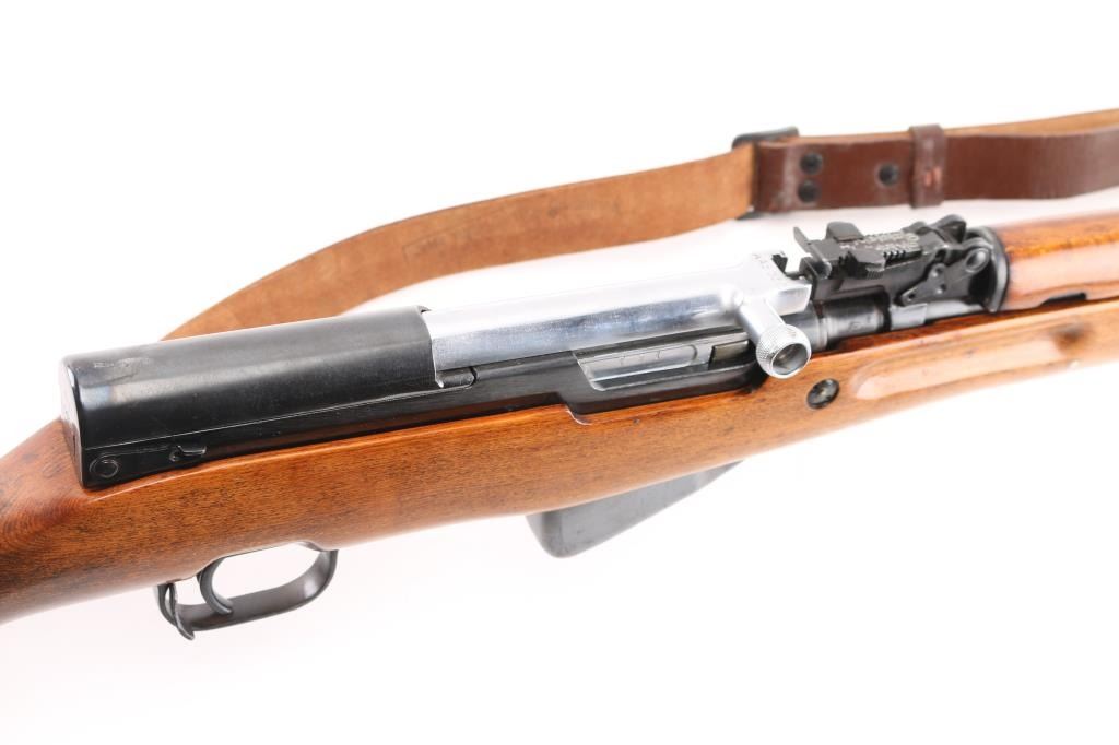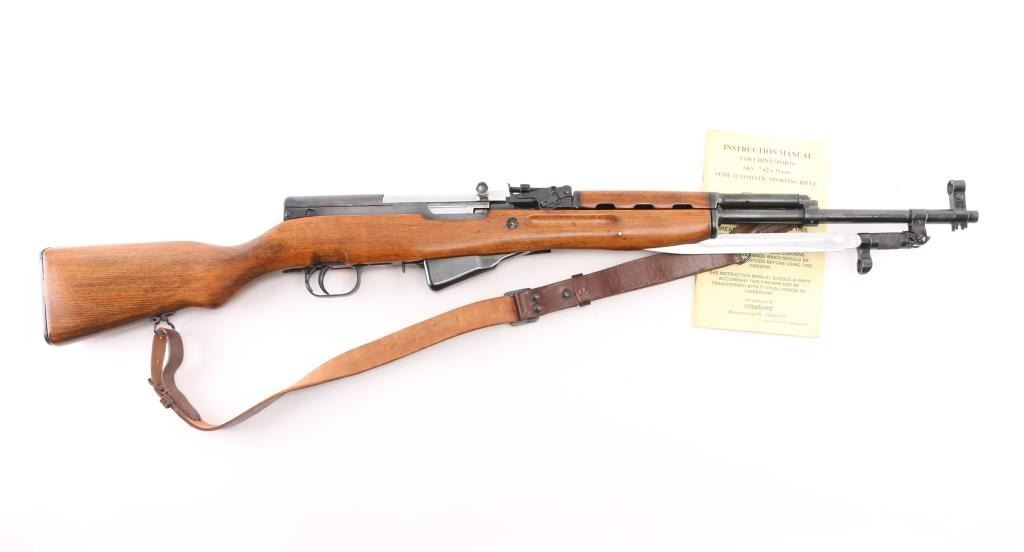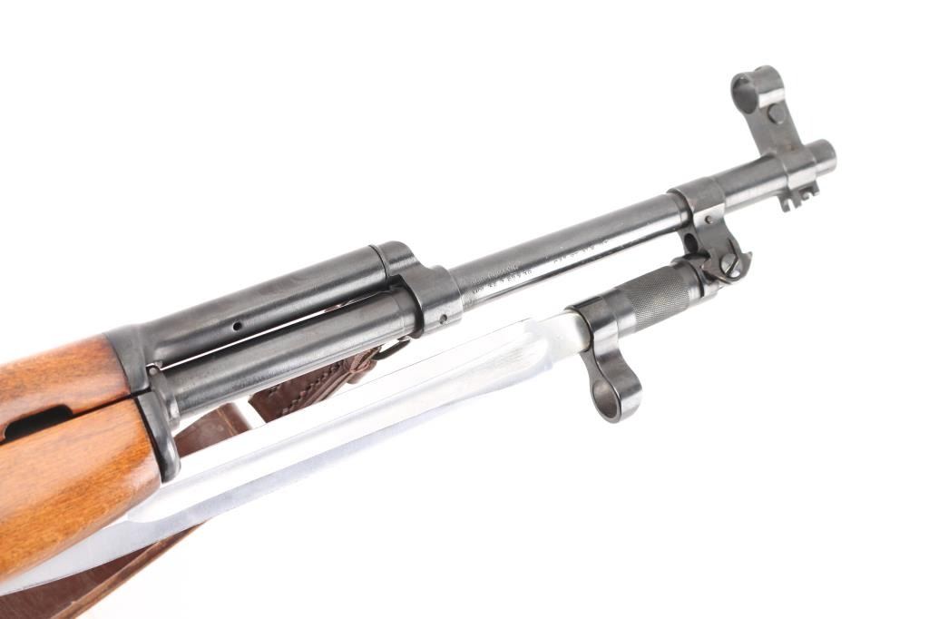 M56' Romanian made gas-operated semi automatic rifle chambered in 7.62x39mm. Manufactured at the Cugir factory. (Arrow in triangle) Dated 1957. Imported by CAI. (Right Barrel) Features a blued finish, 20.4" barrel, hooded front post sight, adjustable tangent rear sight, cleaning rod, folding blade bayonet, safety selector, issue leather sling, fixed 10 round magazine, smooth wood handguard and pistol grip shoulder stock with trapdoor metal buttplate. Matching serial numbers on receiver, cover, bolt carrier, triggerguard, magazine and partial matching number electro-penciled on left side of barrel. Import marks on barrel. Rifle retains approximately 99% of it's bright blued finish showing very minor edge wear, scratches. Action is smooth, bore is excellent/bright, and wood stocks are excellent. Comes with manual. NRA Condition-Excellent. C&R Firearm.