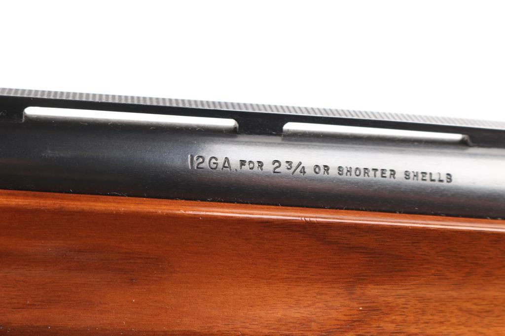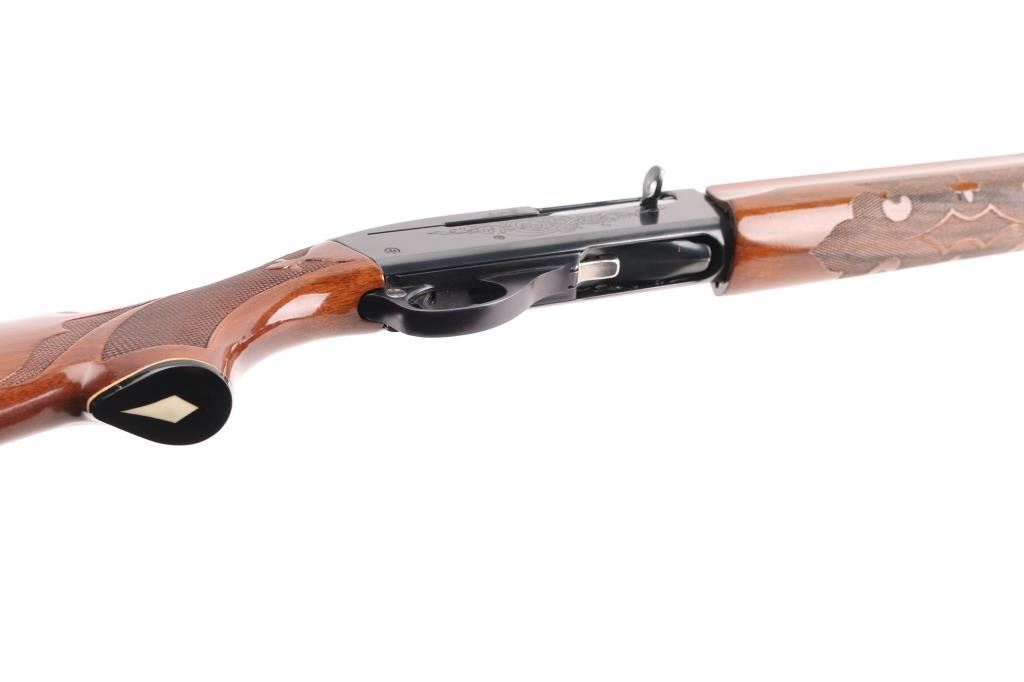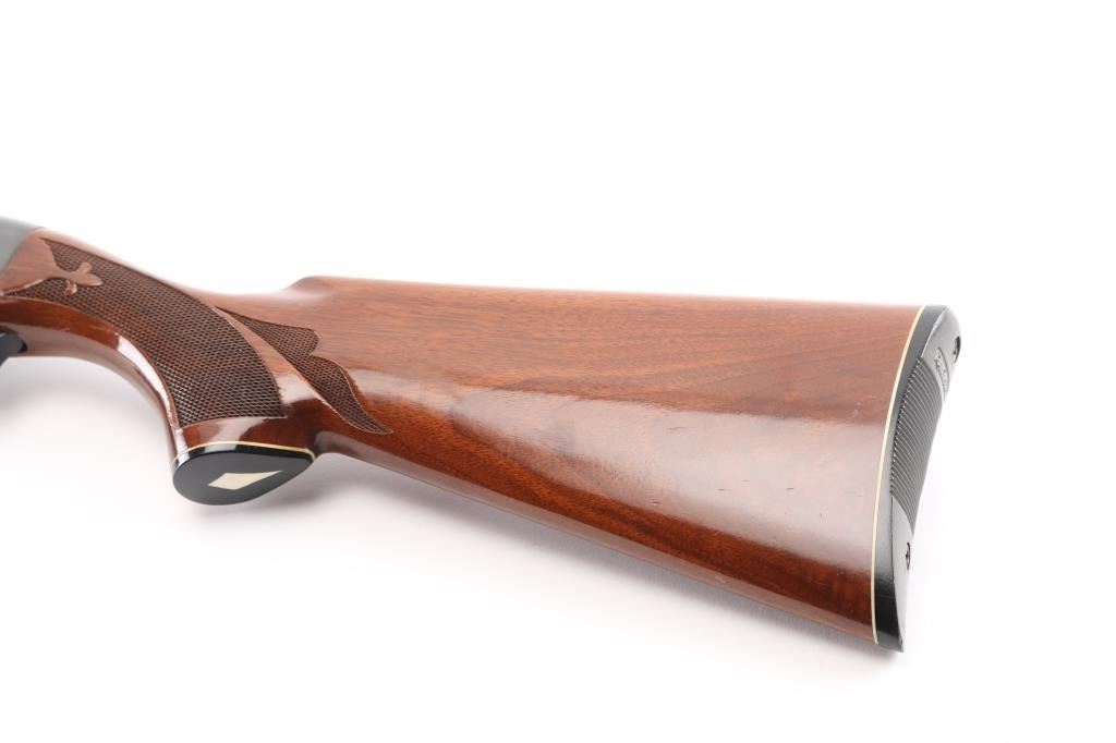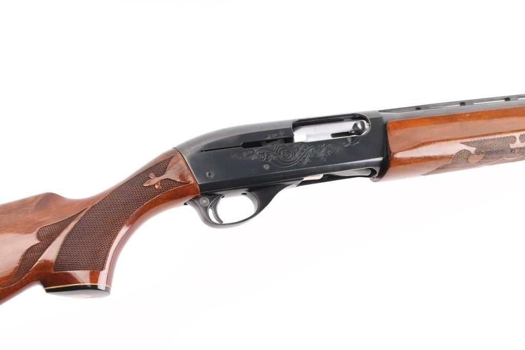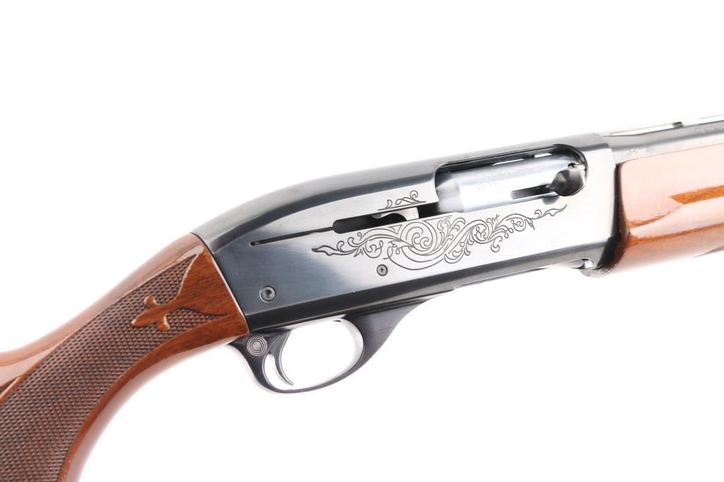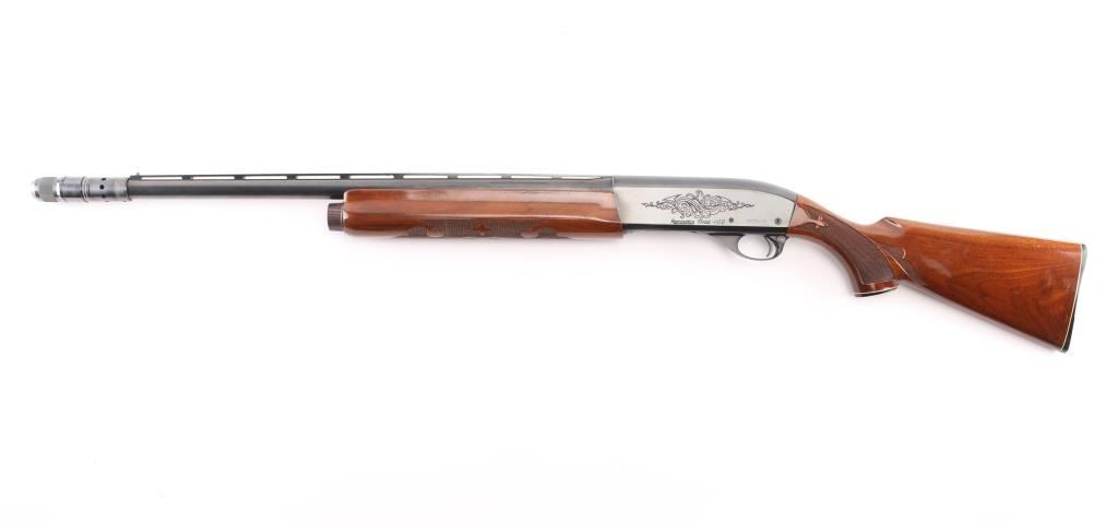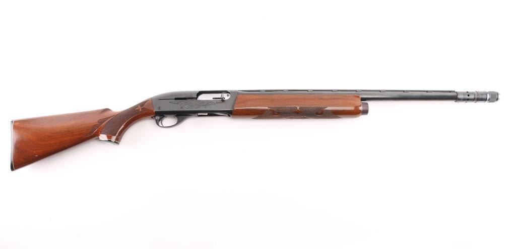 12 Ga. Shotgun. Semi-Automatic. Gas-Operated. Produced 1963-Present. 25" barrel with choke, vented rib. white sighting bead. 2 3/4" chamber. barrel marked "Full", Lyman adjustable choke attached, 4-rd tube magazine. Push button safety. Bottom loading, side ejecting. Floral scroll designs on receiver & bolt. Bore is excellent. Action is crisp/tight. Blued finish is excellent. Checkered walnut stock and forearm are very good with very minor scratches. Black plastic Remington buttplate. NRA Condition-Excellent. Modern Firearm.