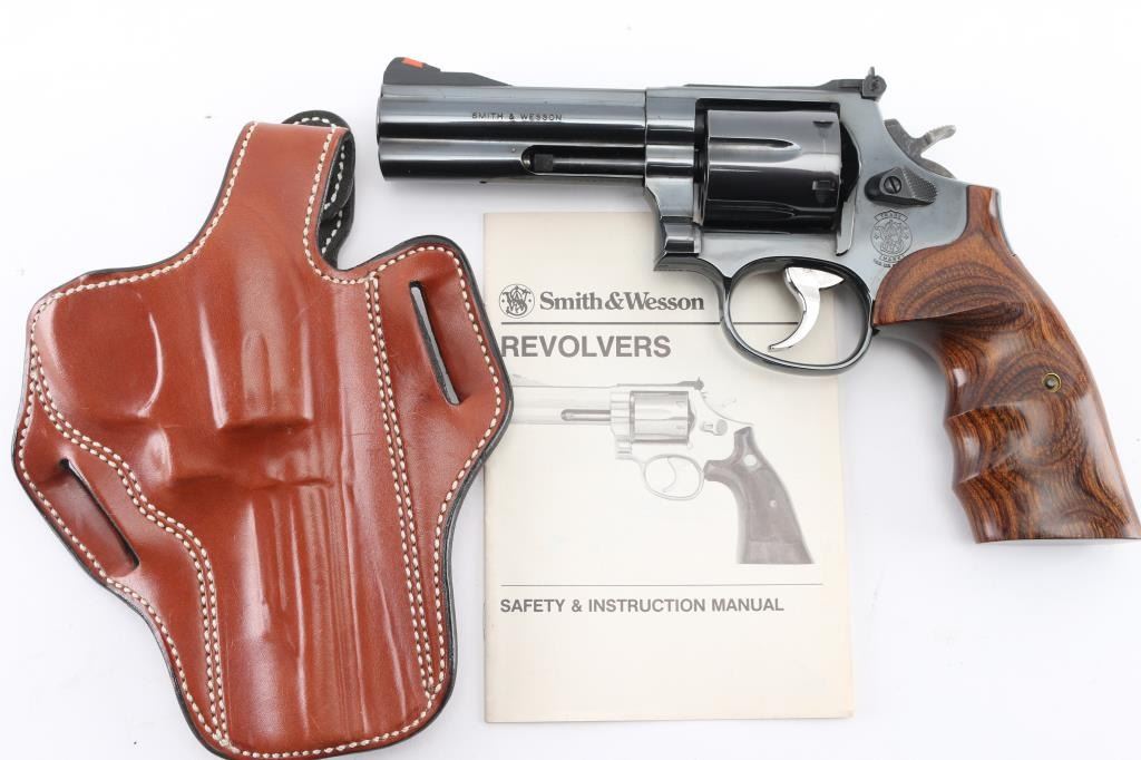 The "357 Distinguished Combat Magnum" Built on a square butt I target frame. Double action 6 shot target revolver. Blued finish, smooth, finger-grooved wood target stocks, case colored semi-target hammer with knurled spur and smooth trigger. It sports a 4" full lug barrel,raised, serrated front sight with red insert, and square notch adjustable rear sights. Metal finish looks great with minimal signs of use or handling and just a faint drag line on the cylinder. Wood grips are fine. Comes in a very nice brown leather DeSantis holster, and manual. Condition is NRA Excellent. Modern Firearm.