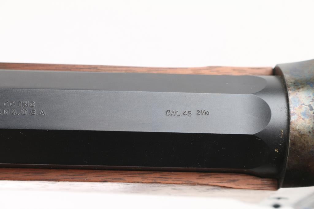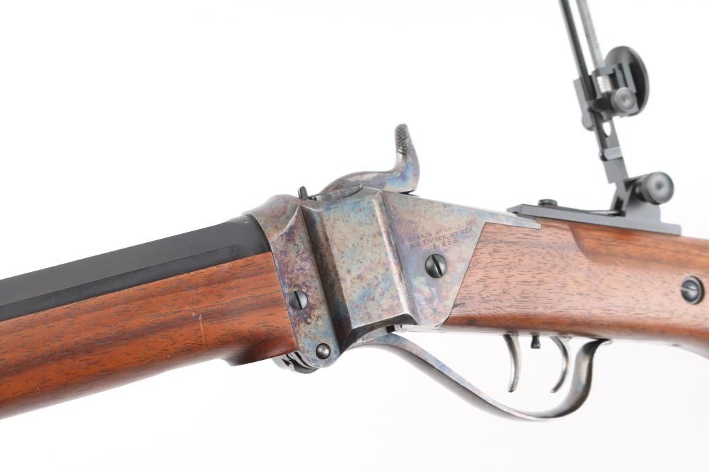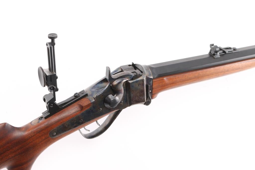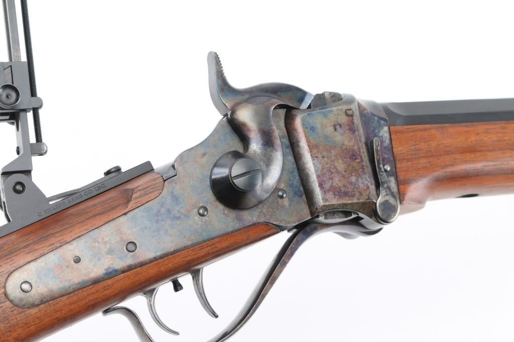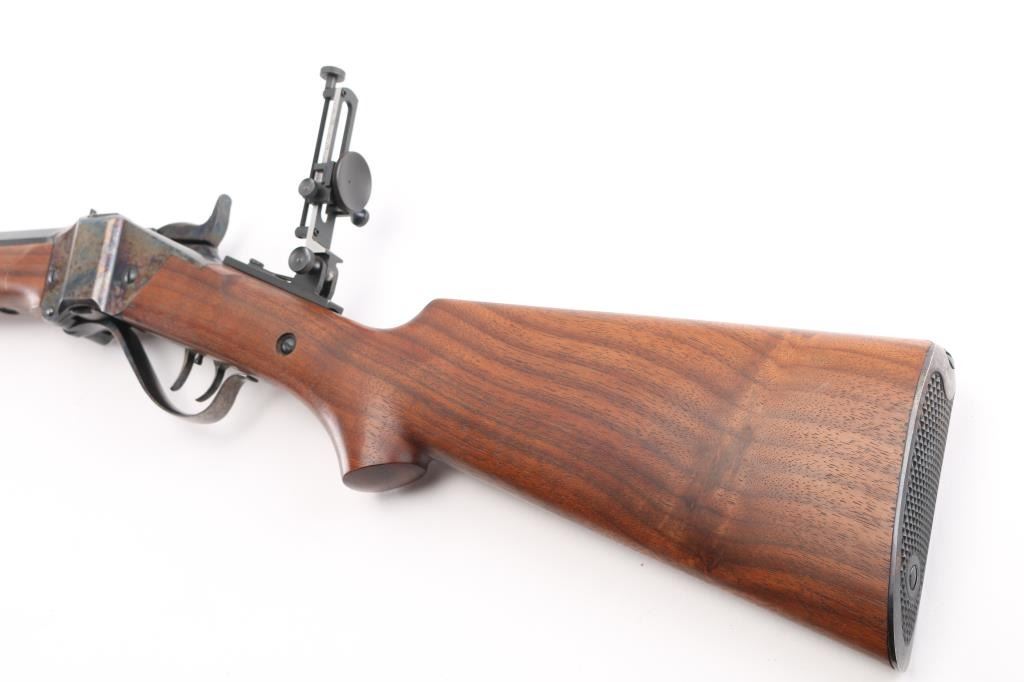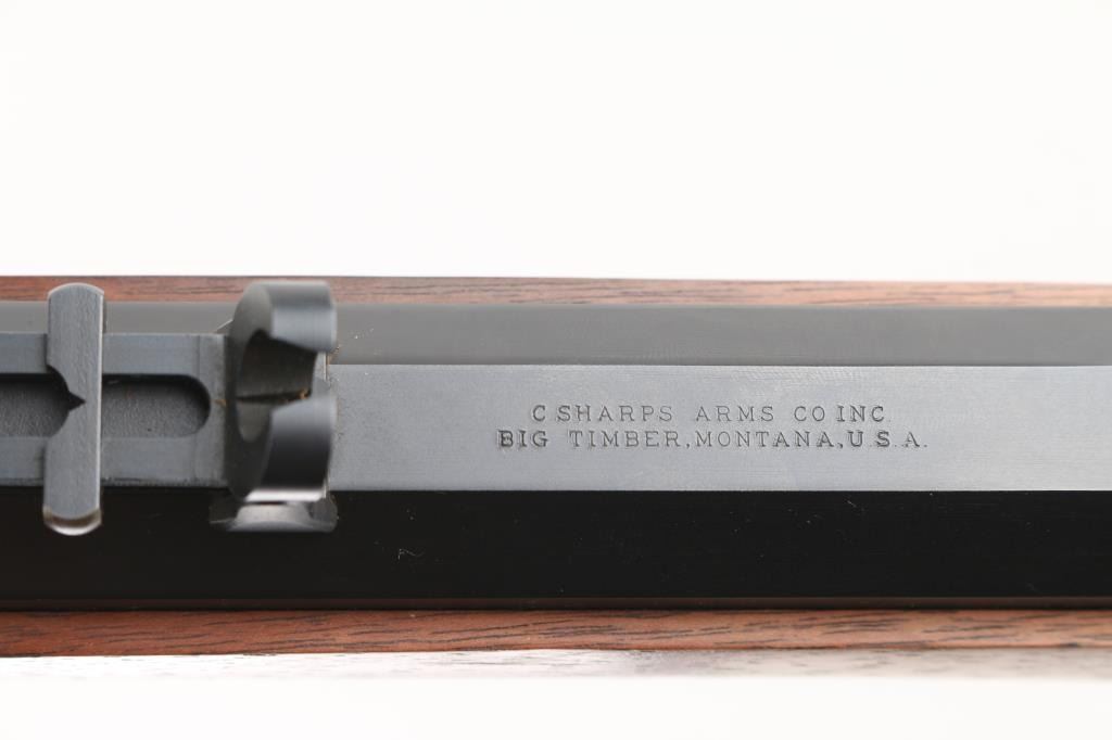'Old Reliable' Straight breech falling block single shot "Buffalo Rifle" chambered in .45-70 Government, marked "Cal 45 2 1/10", manufactured in Big Timber, MT. Features 30" heavy octagonal barrel with adjustable vernier tang peep sight, Lawrence style flip-up rear sight, front ring in hood. Blued barrel. Case-hardened receiver, triggerguard/lever, and Sharps factory buttplate. smooth forearm Schnabel forend, semi-pistol grip butt stock, double-set triggers. Bore appears excellent/bright. Falling-block action is smooth. Hammer locks-up tight. Wood is near excellent with some very minor blemishes. Metal finish is about 98% with some very minor edge wear/scratches. Case colors are fiery & bright with a dense tight color pattern. Condition is NRA Excellent *** Modern Firearm ***