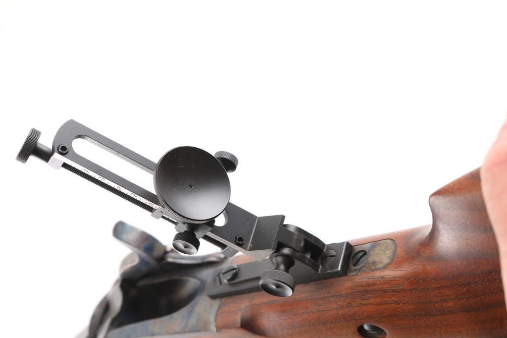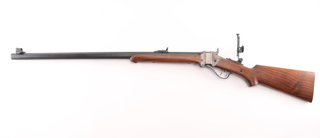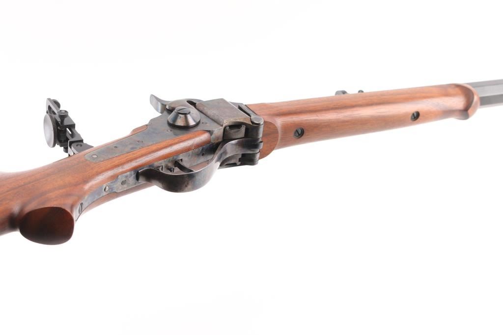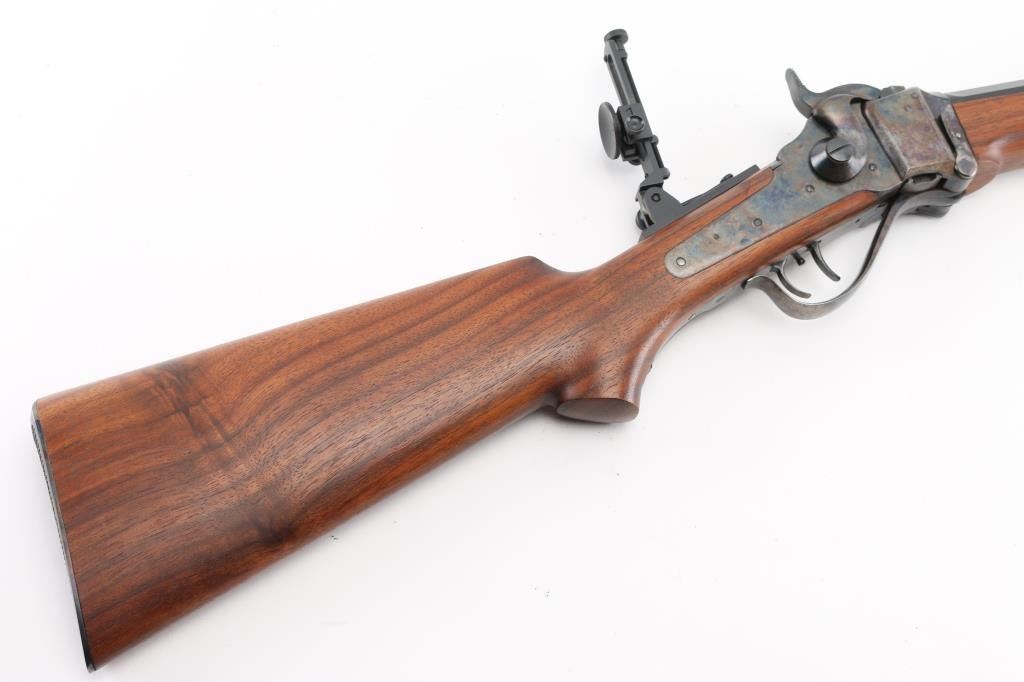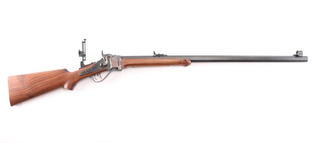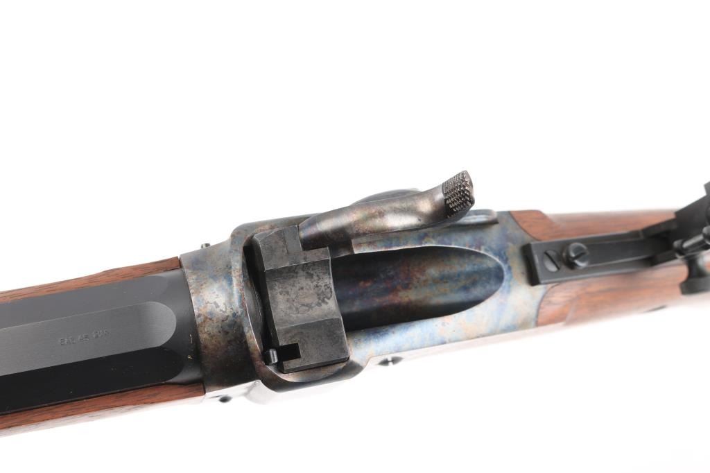 'Old Reliable' Straight breech falling block single shot "Buffalo Rifle" chambered in .45-70 Government, marked "Cal 45 2 1/10", manufactured in Big Timber, MT. Features 30" heavy octagonal barrel with adjustable vernier tang peep sight, Lawrence style flip-up rear sight, front ring in hood. Blued barrel. Case-hardened receiver, triggerguard/lever, and Sharps factory buttplate. smooth forearm Schnabel forend, semi-pistol grip butt stock, double-set triggers. Bore appears excellent/bright. Falling-block action is smooth. Hammer locks-up tight. Wood is near excellent with some very minor blemishes. Metal finish is about 98% with some very minor edge wear/scratches. Case colors are fiery & bright with a dense tight color pattern. Condition is NRA Excellent *** Modern Firearm ***