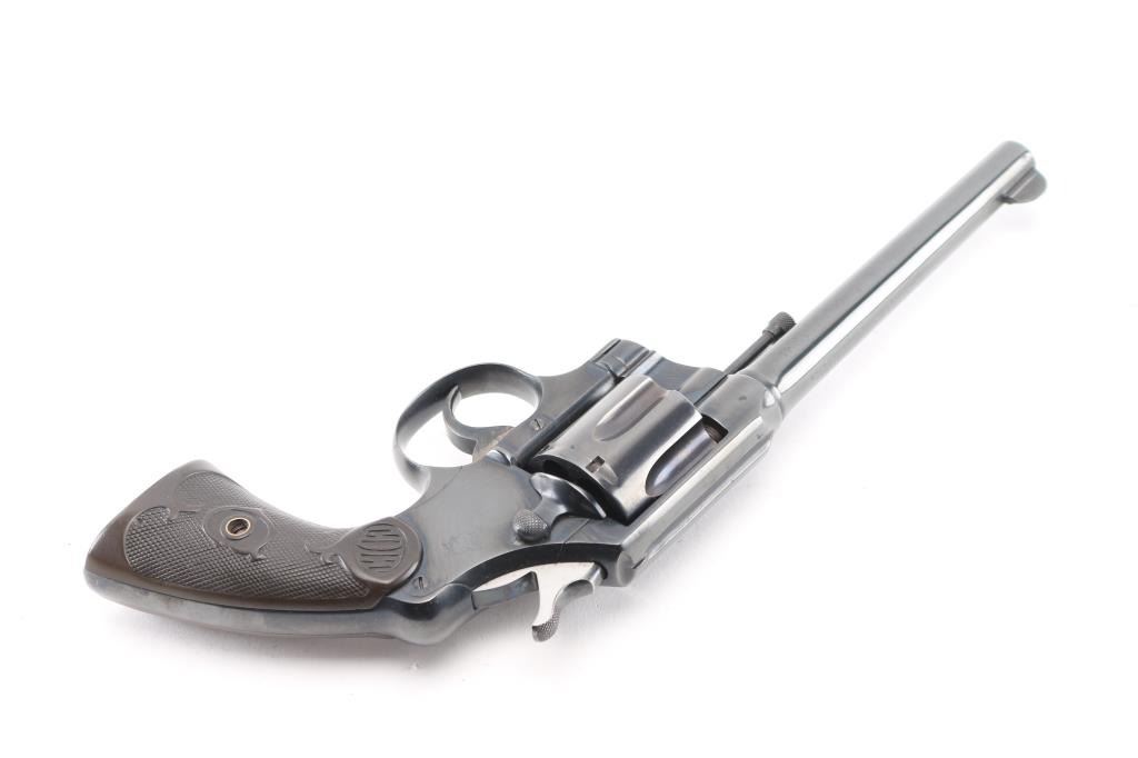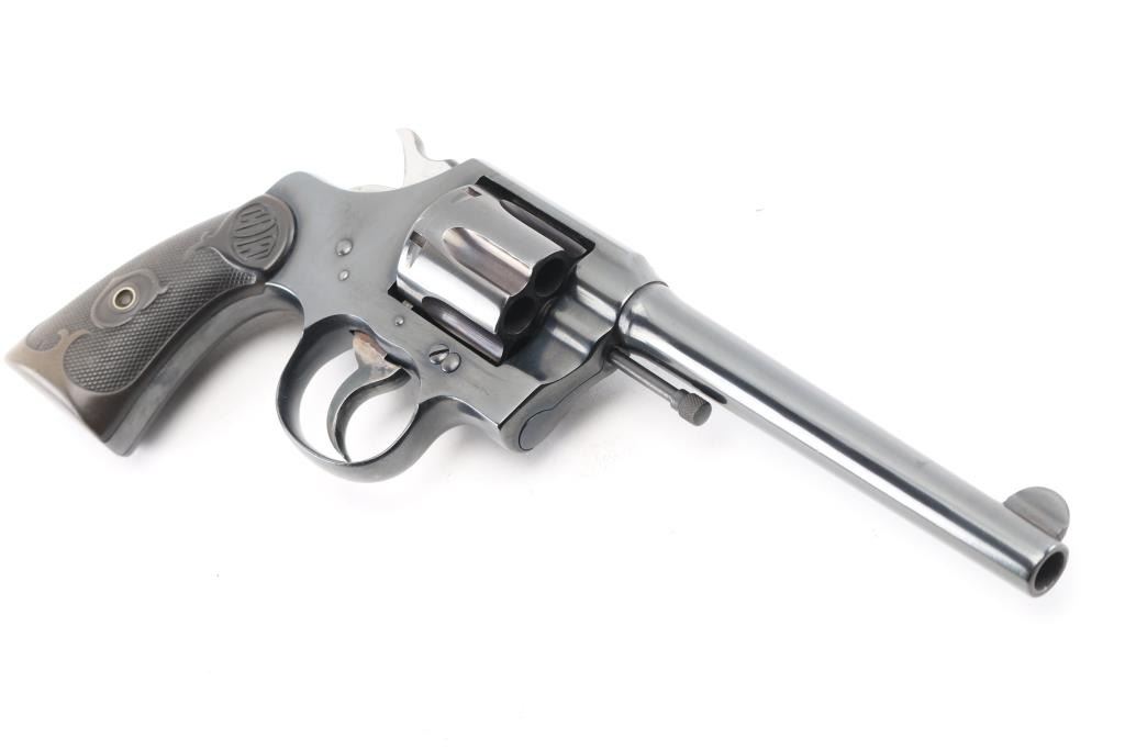Manufactured 1913. Double/single action revolver features blued refinish, checkered hard rubber grips, with "Colt" in ovals, 6" barrel, fixed sights, exposed cylinder rod. 6 shot cylinder. Bore is fair, strong rifling/bright with scattered areas of light pitting. Retains 98% reblue. Action is smooth with tight lock-up. Barrel markings are crisp; Rampant Colt marking on frame. Grips are excellent. Hammer has polished side, case colored trigger. NRA Condition-Very Good as Refinished. C&R Firearm.