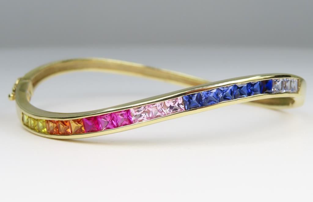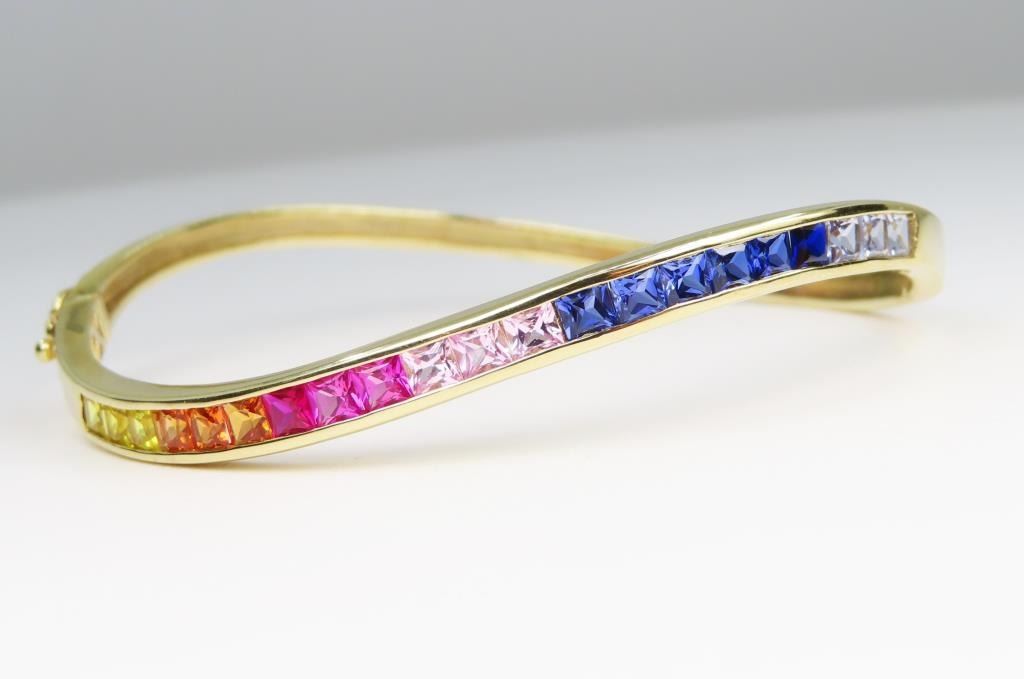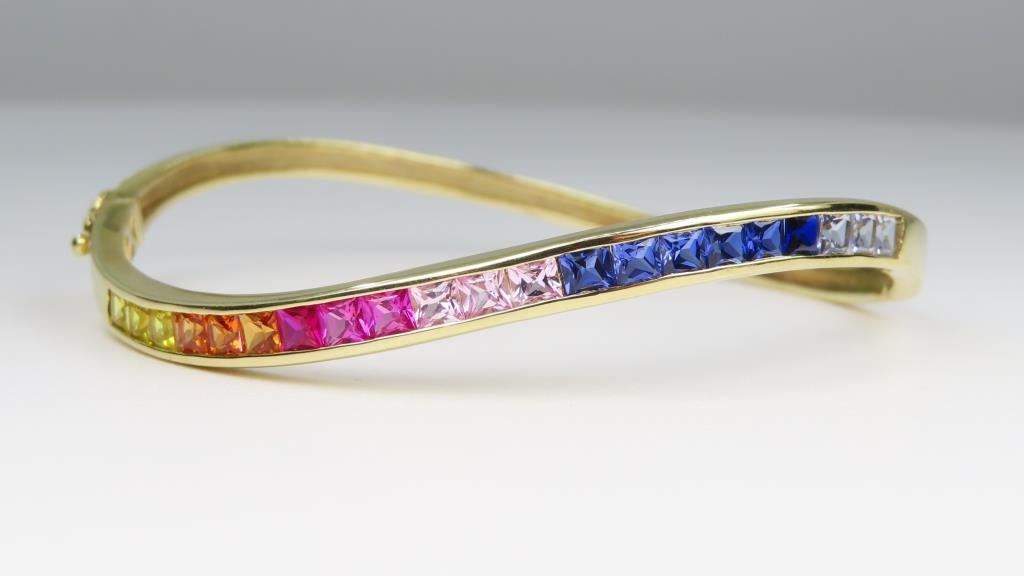 featuring 21 princess cut created Sapphires in Yellow, Orange, Pink, Red, Blue and Purple weighing approx. 8.00 carats channel set in a contemporary style 14 karat yellow gold bangle setting. Retail $3,000-$4,000