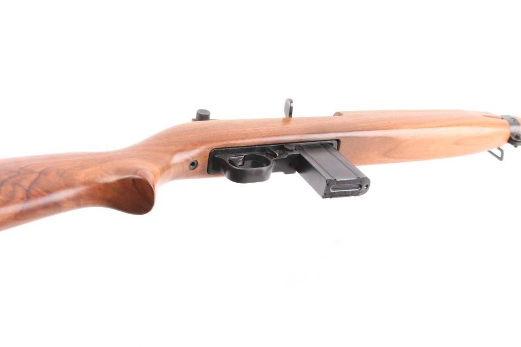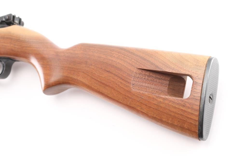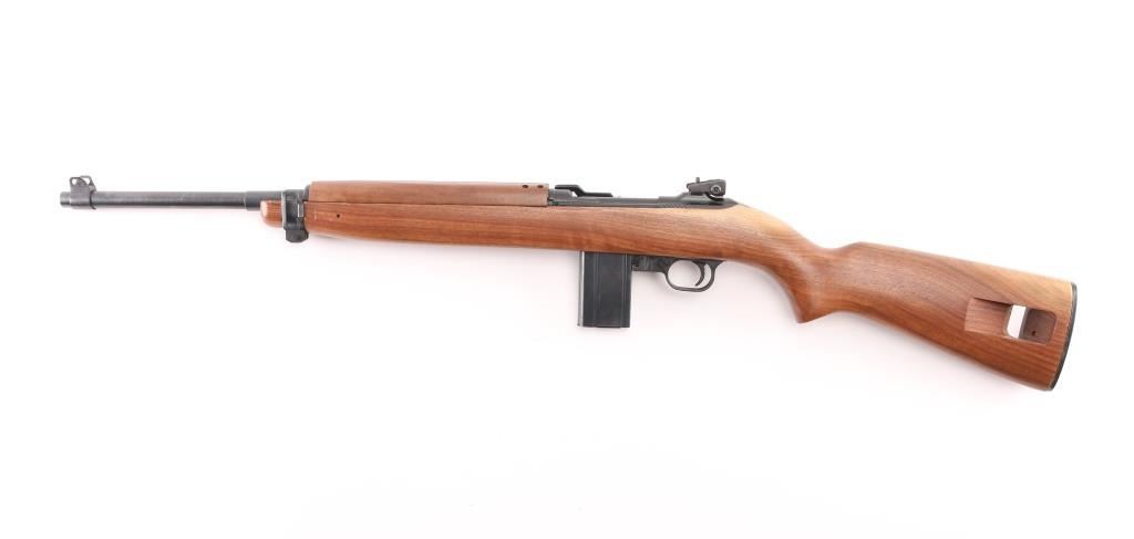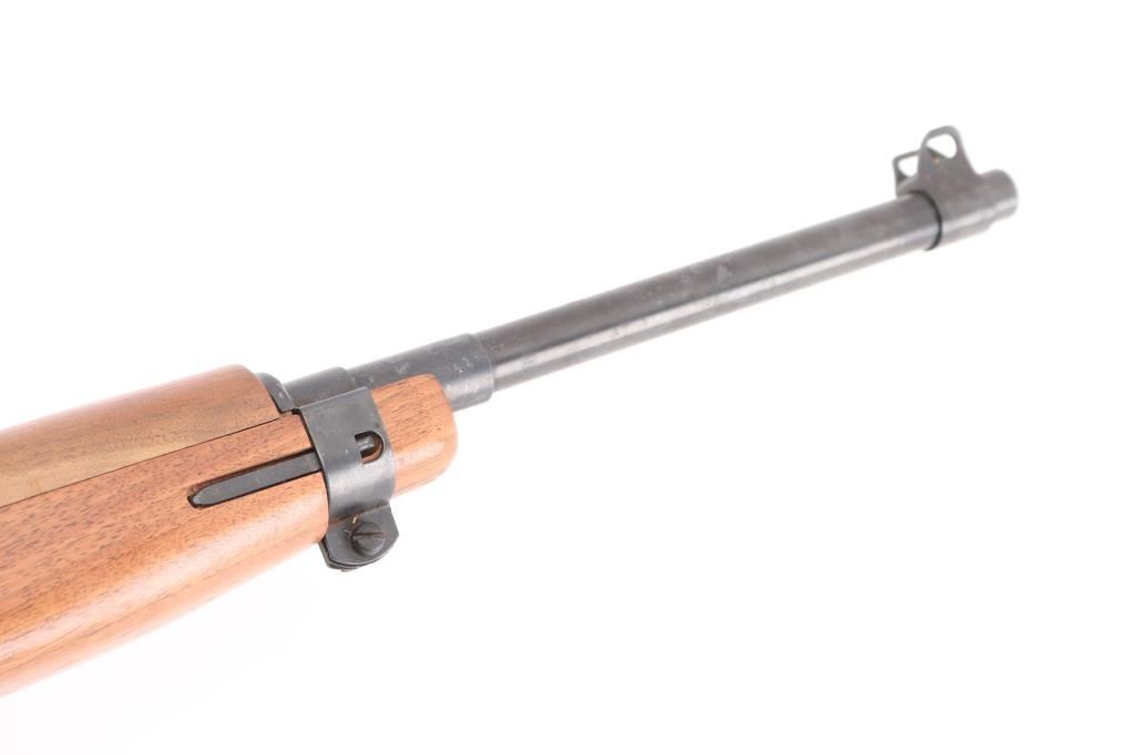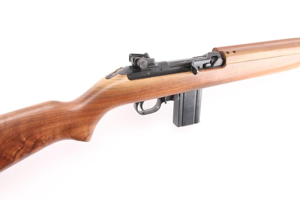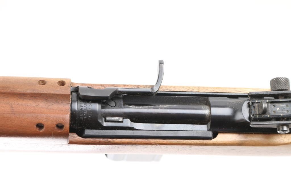 American made commercial copy of the M1 carbine. 18." barrel with protected front sight blade, and adjustable rear peep sight, walnut upper handguard with sighting groove. Wood stock is in very good condition with a couple of minor scratches, steel butt plate. The Bore and action are excellent. Blue is excellent. Comes with (1) 10 round Universal marked metal magazine. Comes in its original factory box. Condition is NRA Excellent.