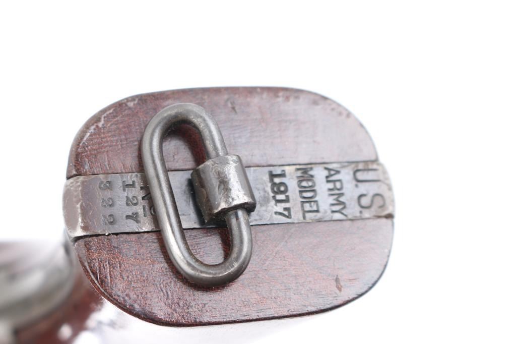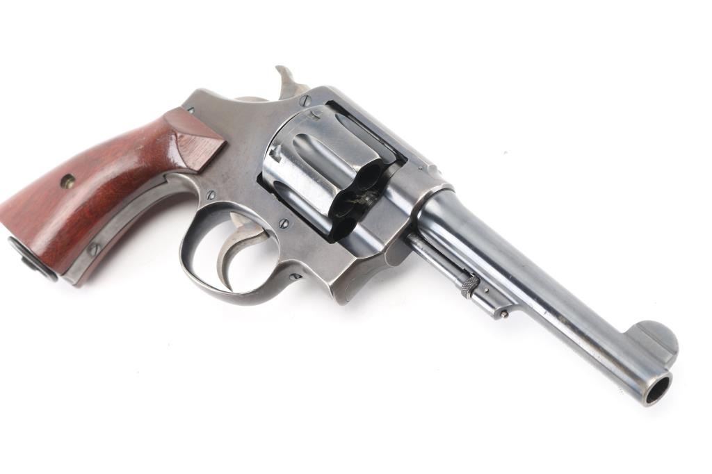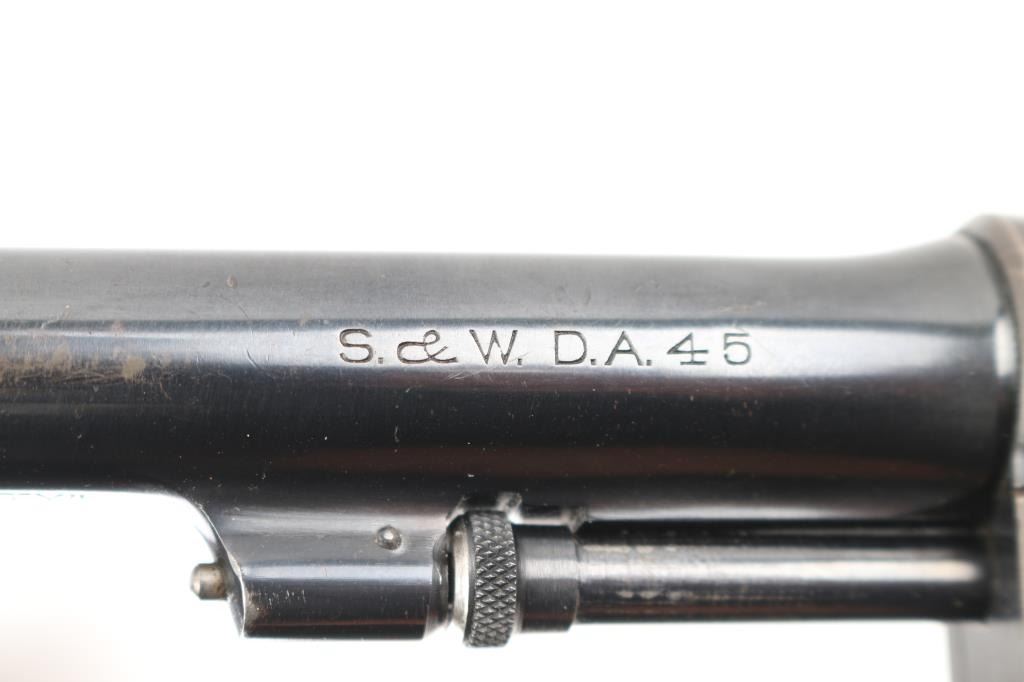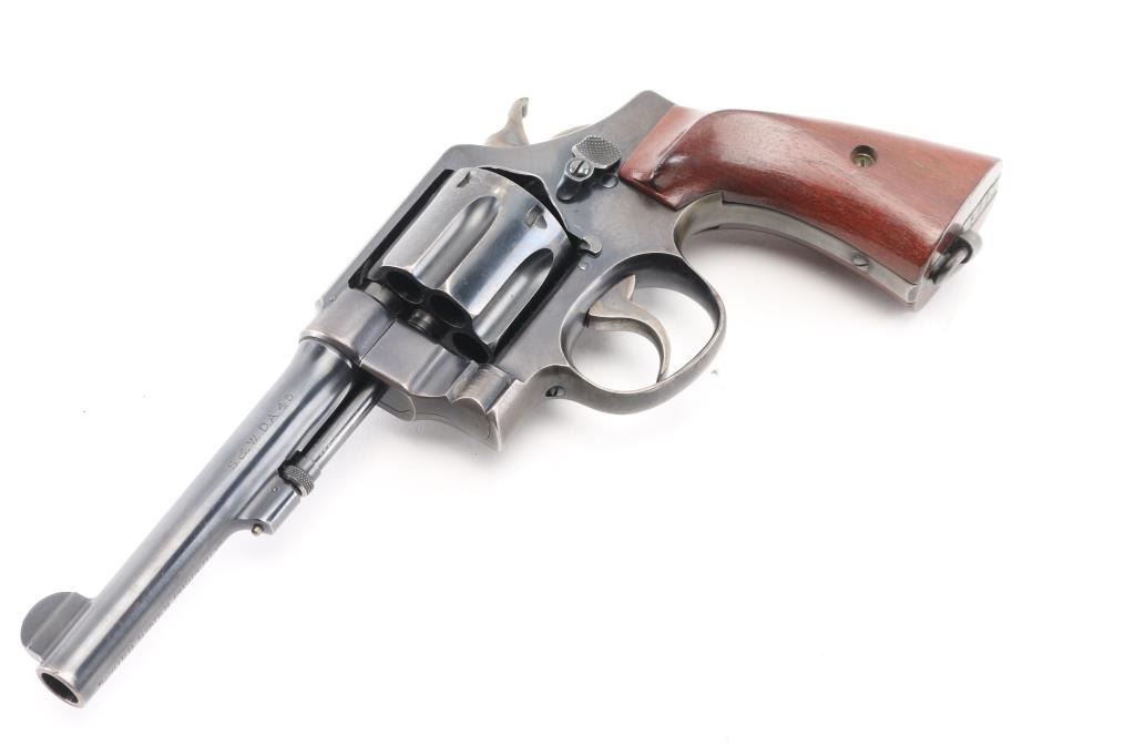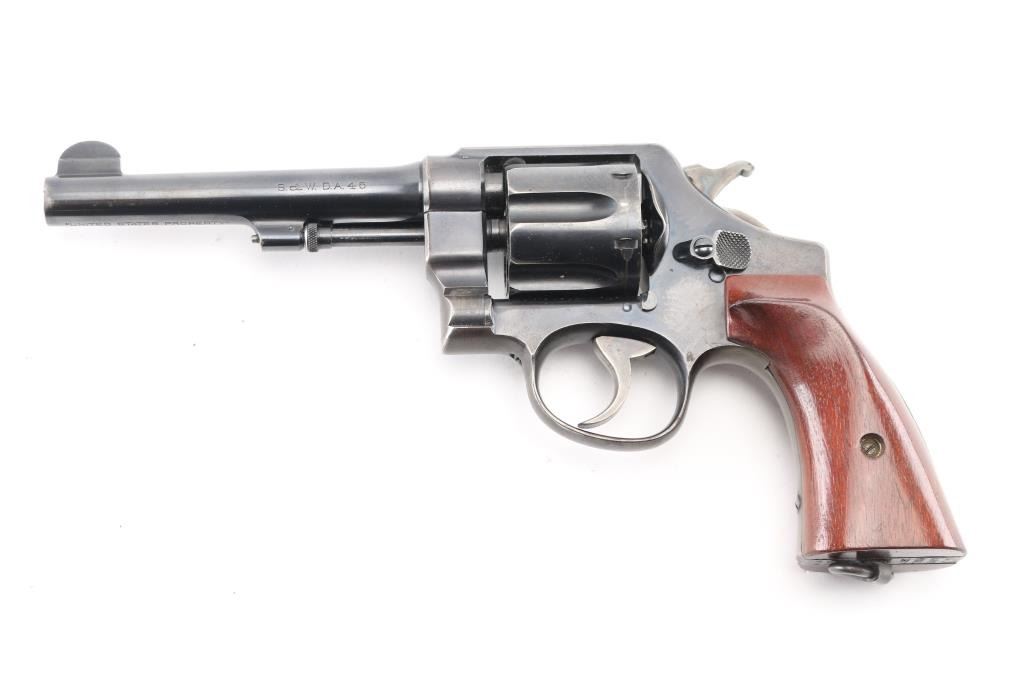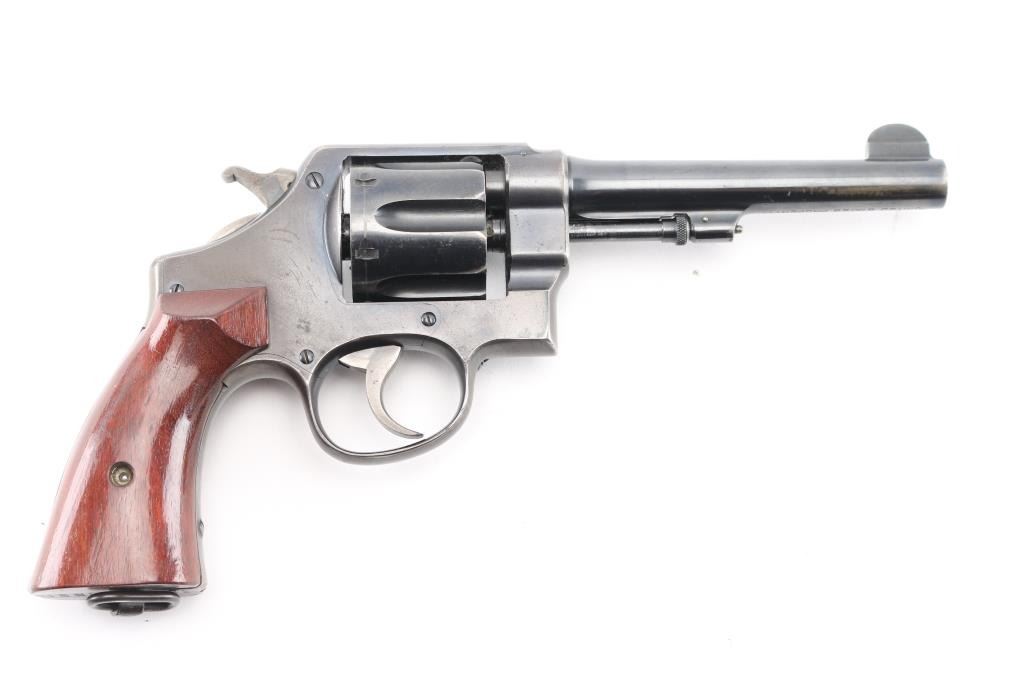SN: 127322. WWI era U.S. Army contract large frame double-action service revolver chambered in .45 Auto, manufactured in Springfield, MA . Features a blued finish, pinned 5.5" tapered barrel, forged round blade front sight, "u" notched rear sight, fluted six-shot swing-out cylinder, non-shrouded ejector rod, case hardened .265" smooth trigger, case hardened .265" hammer with knurled spur, five screw square butt N service frame with lanyard ring on the butt, and smooth walnut grips. Matching serial numbers are found on the frame, barrel, cylinder. Other Markings: Frame -"U.S/ARMY/MODEL/1917" & "No/127322”. Barrel- "SMITH & WESSON SPRINGFIELD MASS. U.S.A./PATENTED DEC.17.1901. FEB.6.1906. SEP.14.1909", "S.&W. D.A. 45", "140462". There are 2 eagle head proofs, one with "S2" inspectors proof, indicating late war manufacture. Flaming bomb on left frame. No U.S. Property stamp on barrel. Revolver retains approximately 75% of its original blued finish showing handling wear, scattered scratches, and thinning on the gripstraps. Action is crisp with excellent lock-up, the bore is excellent/bright, the markings are sharp and the matching wood grips are very good. not original to the revolver as both have thumb rests. Condition is NRA Near Very Good. C&R Firearm.