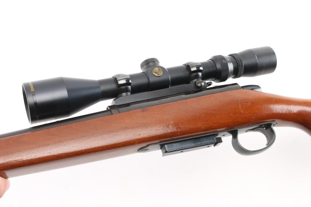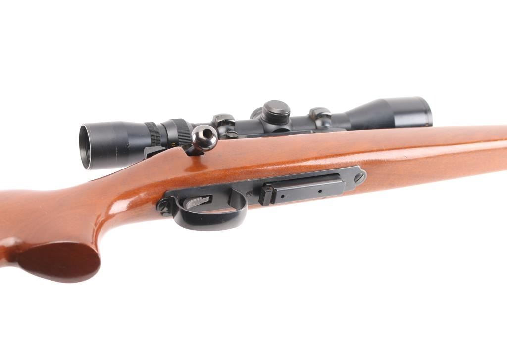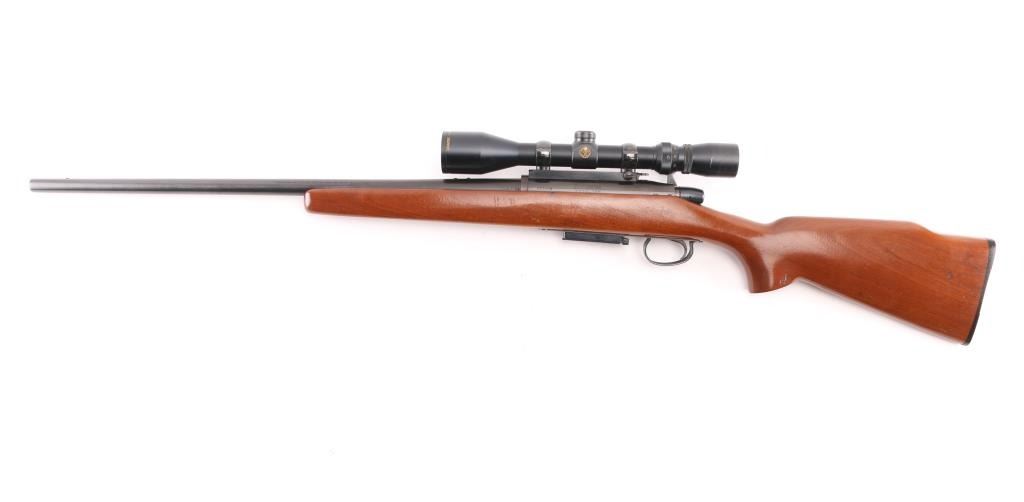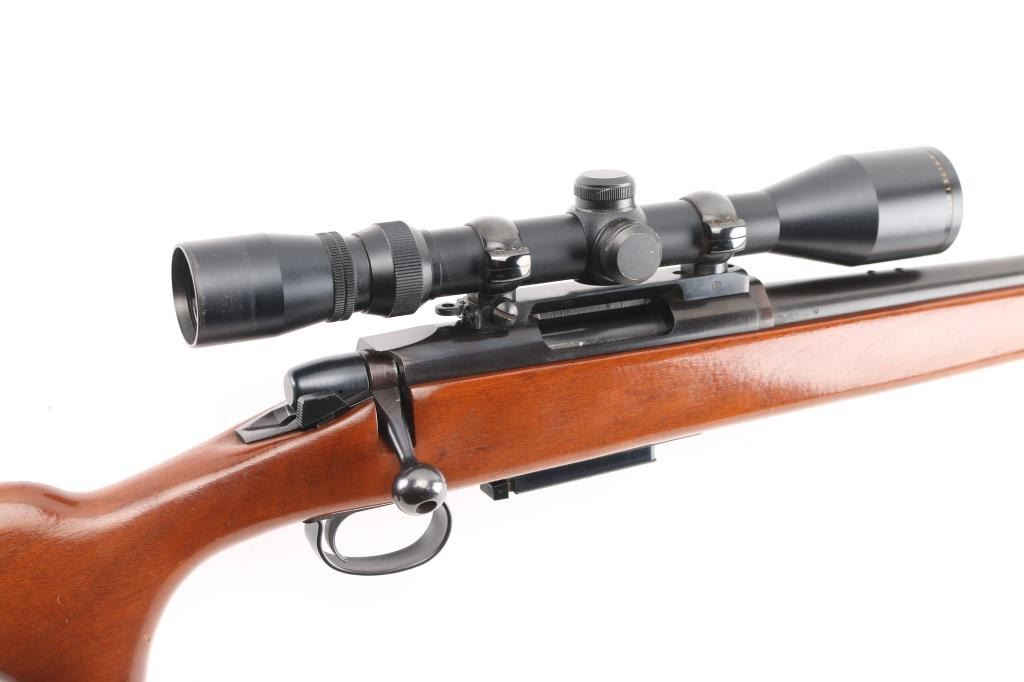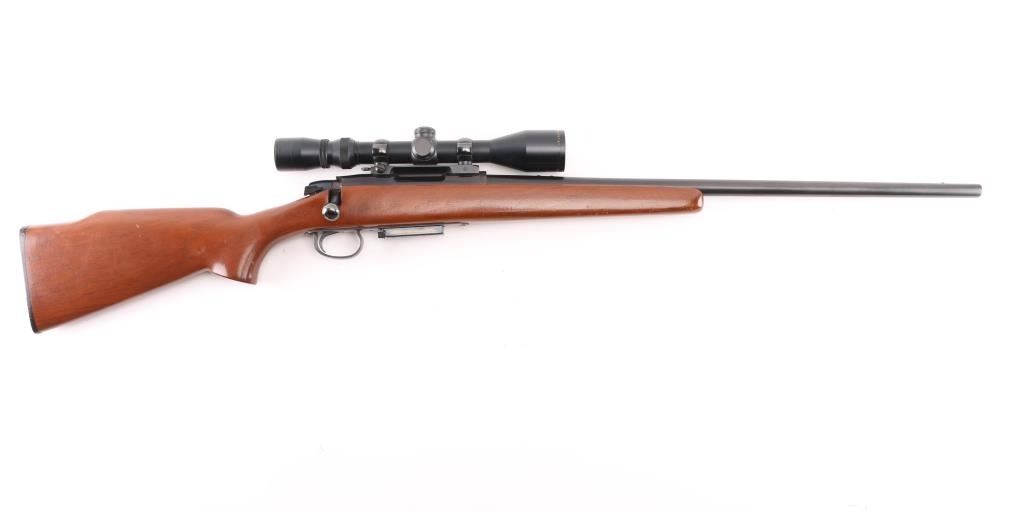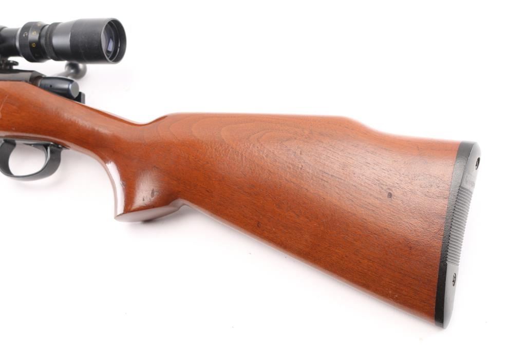 Bolt action rifle, dated coded 1968, second year of production. Features blued finish, 24" barrel with no sights (drilled & tapped, plug screws installed), detachable magazine, manual safety, Redfield one piece scope mount & rings, base incorporates small flip up peep sight. Smooth hardwood stock features factory black plastic buttplate. Mounts a Simmons Whitetail 3-9x scope with wide "TV" view, duplex reticle. Bore is pristine. Retains 95% finish with handling marks. Stock is very good with few small dings. Scope is very good with clear view. Condition is near NRA Excellent *** C&R Firearm ***