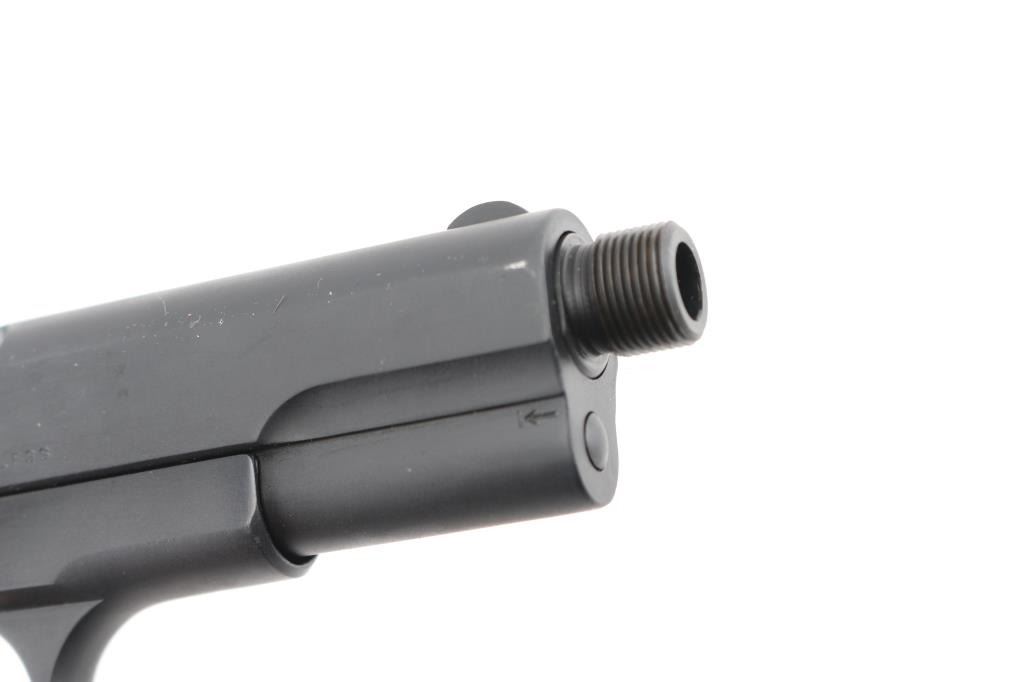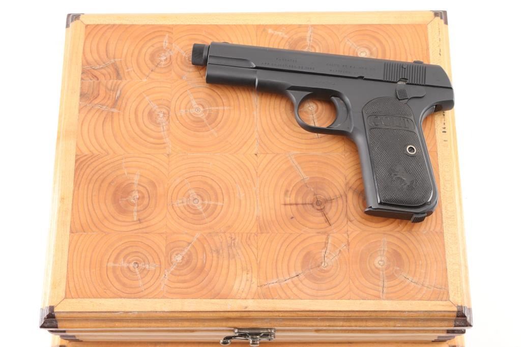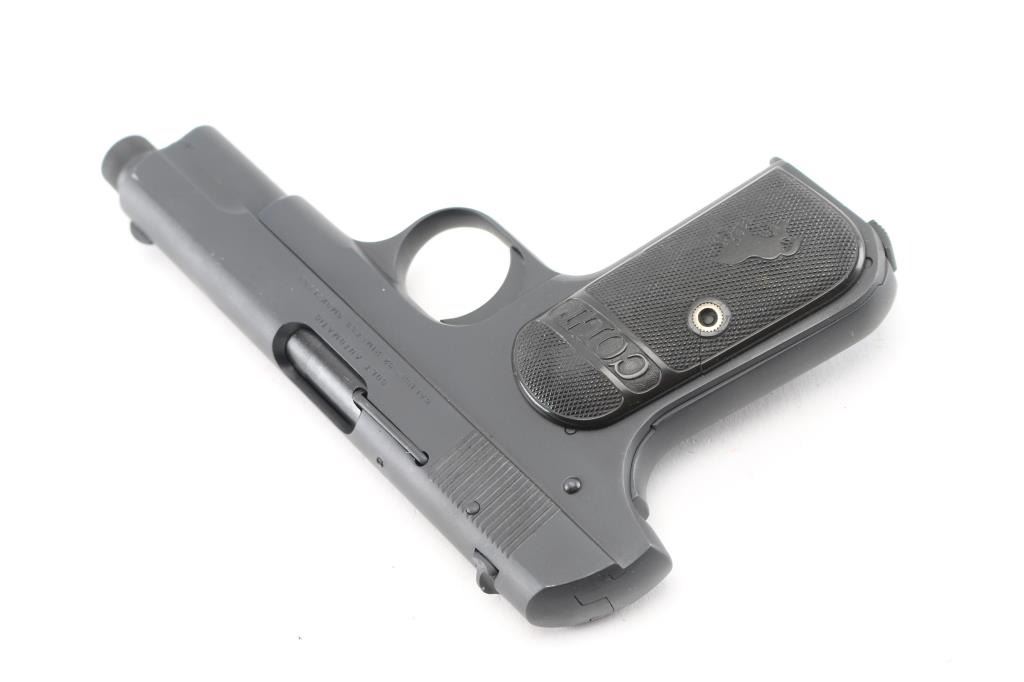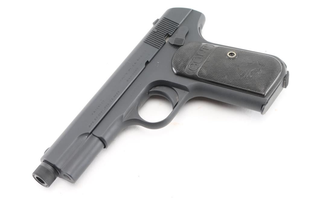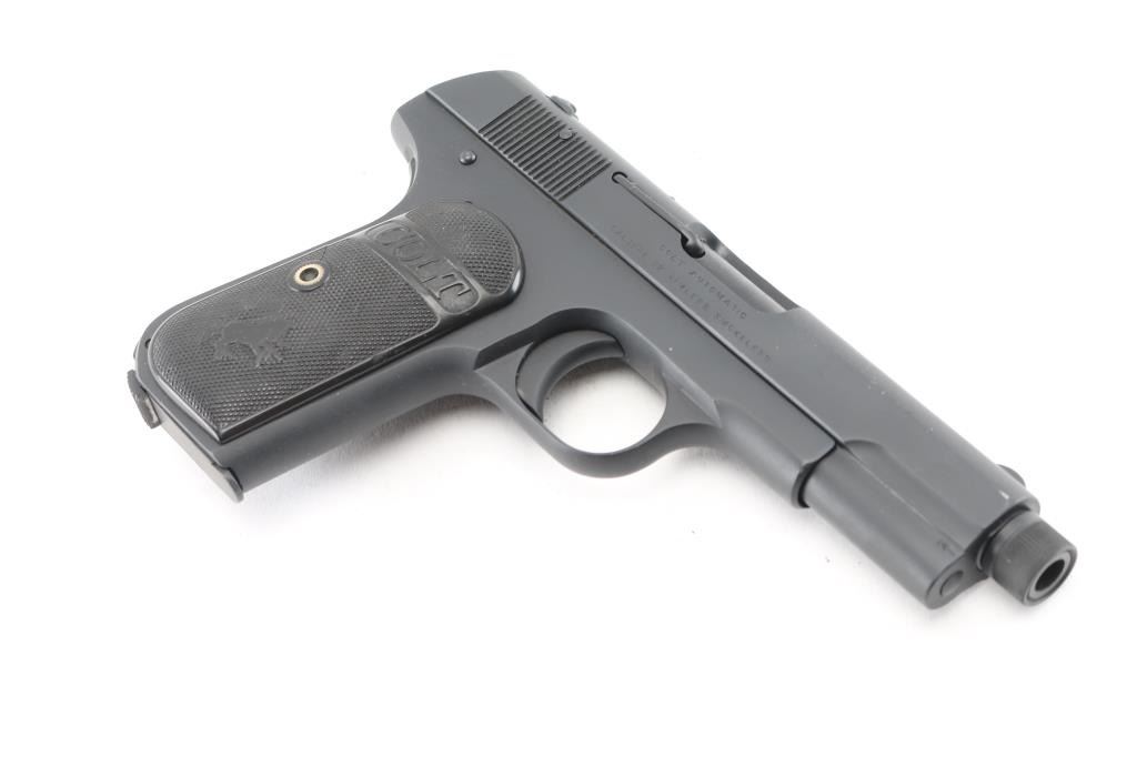 'Type 3' Re-finished, re-barreled vintage semiautomatic pistol manufactured circa 1915. Features, checkered black gutta percha grips with embossed Colt banners and Rampant Colt logos, re-barreled with a 4" In Lead We Trust threaded barrel, fixed sights, manual safety, grip safety, heel magazine release. Bore is excellent/bright. Parkerized re-finish is excellent. Standard Colt markings are overall crisp/clear. Grips are good condition with smoothing of embossed features and crack in the right panel. Includes the original Colt factory barrel, (1) good condition unmarked parkerized magazine. Comes in a nice blonde wood form fitted green lined display case with printed label. Also comes with Colt factory letter, sold to C. Kowesch, Chicago, Illinois, December 17th, 1915, one gun shipment. Condition is near NRA Excellent as Restored. C&R Firearm.