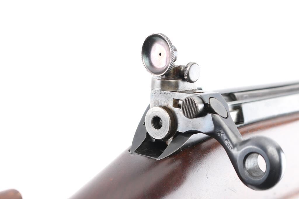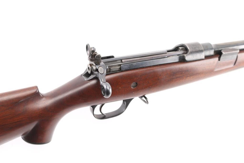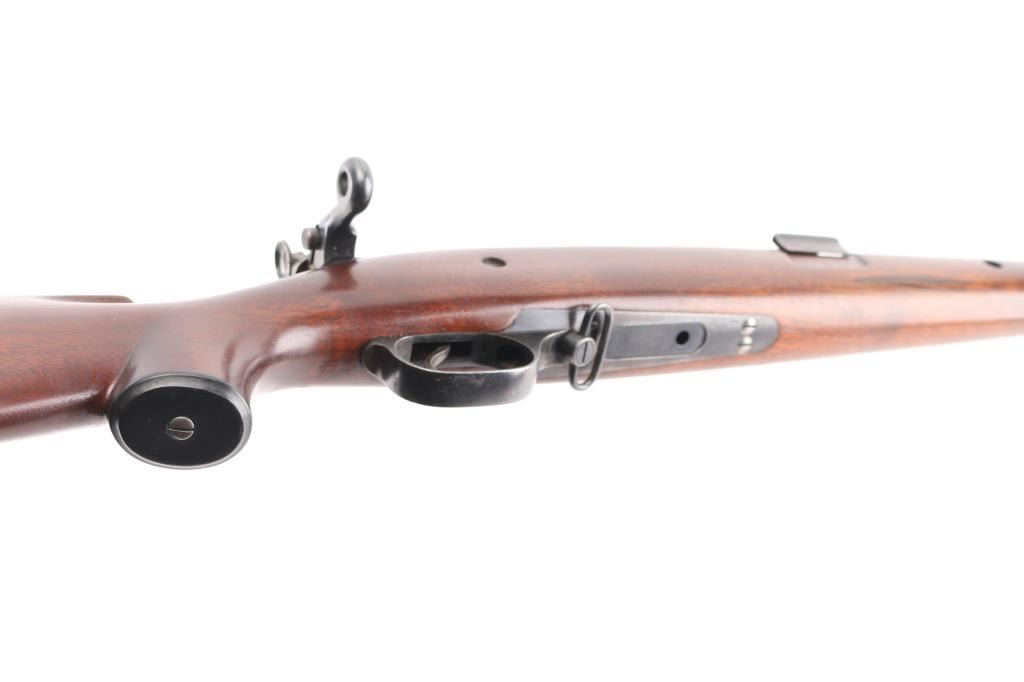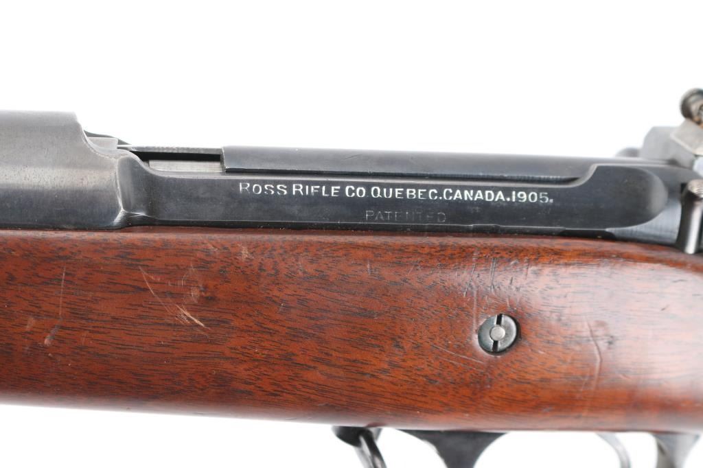 Sporterized WW 1 era Canadian military rifle chambered for the 303 British cartridge. Straight pull. Features a right side mounted lever for depressing the magazine follower, bolt catch lever on rear left side of receiver, and a lever in the triggerguard that retracts the cartridge stop to allow rapid unloading has been removed. Barrel length is 22 inches, with raised blade front, and adjustable peep rear sight mounted on the bolt. Hard wood sporter pistol grip stock stock with schnabel forend. Bore is rough, dark with scattered pitting. Retains 70% coverage of dark blue turning brown in some places with handling losses on barrel. Stock is very good. Left receiver rail marked "Ross Rifle Co. Quebec, Canada, 1905". Action is smooth/tight. No import marks observed. Condition is NRA Good. C&R Firearm