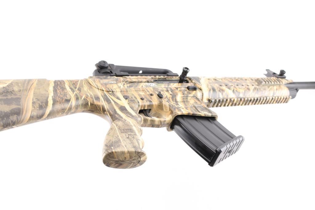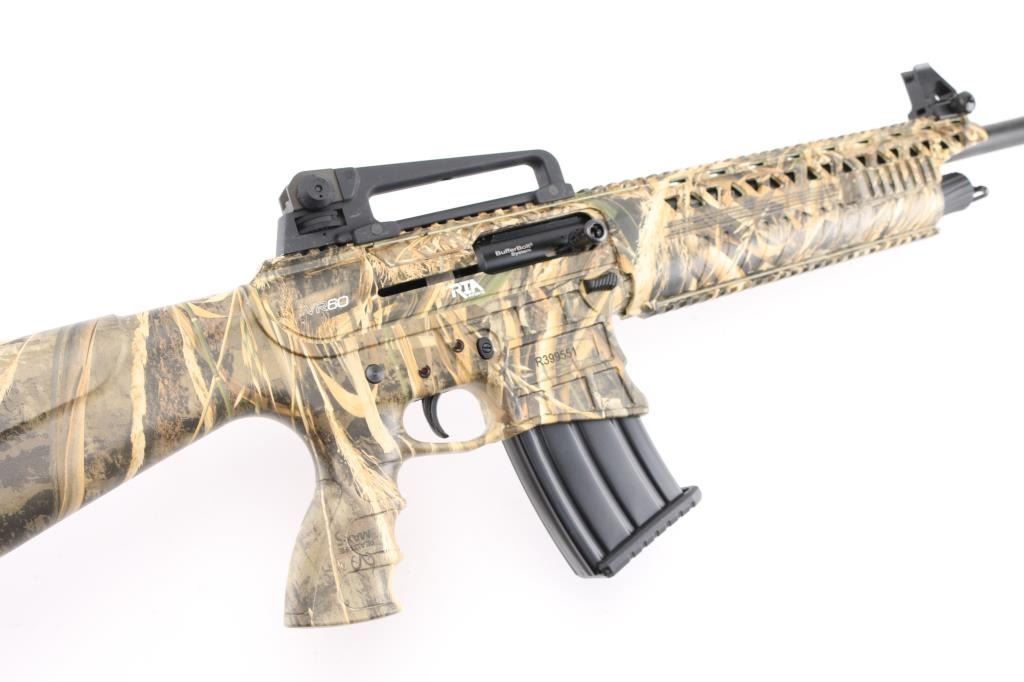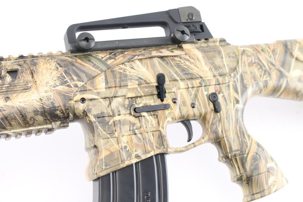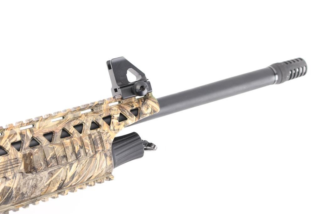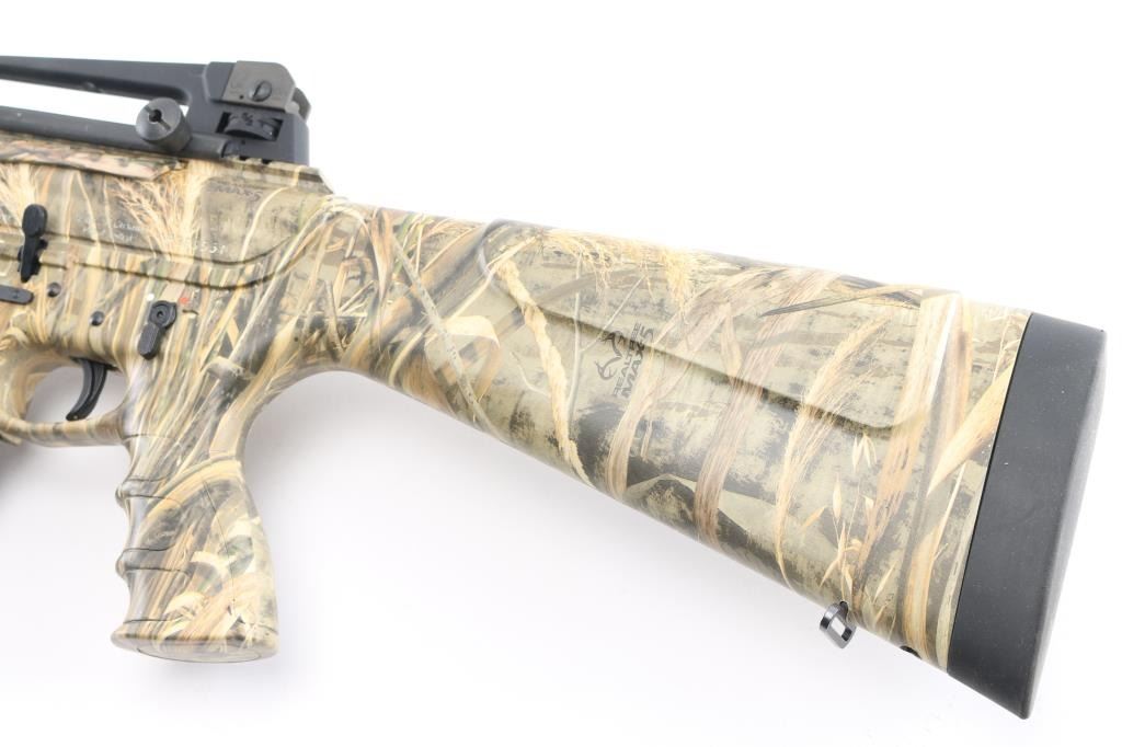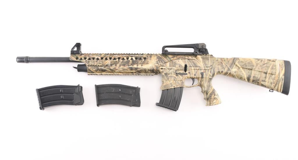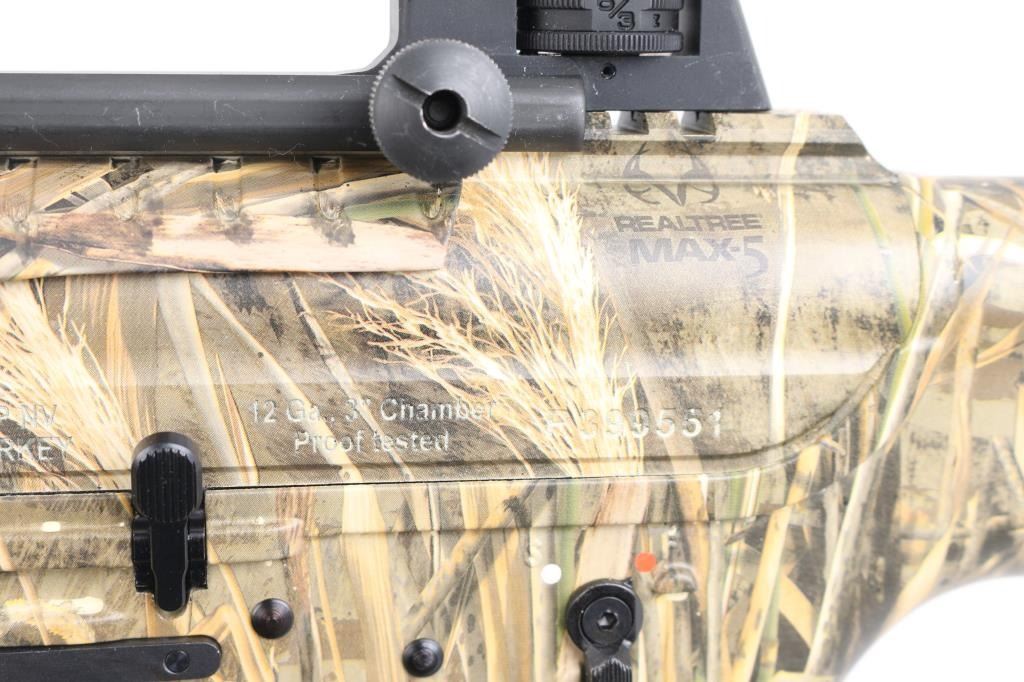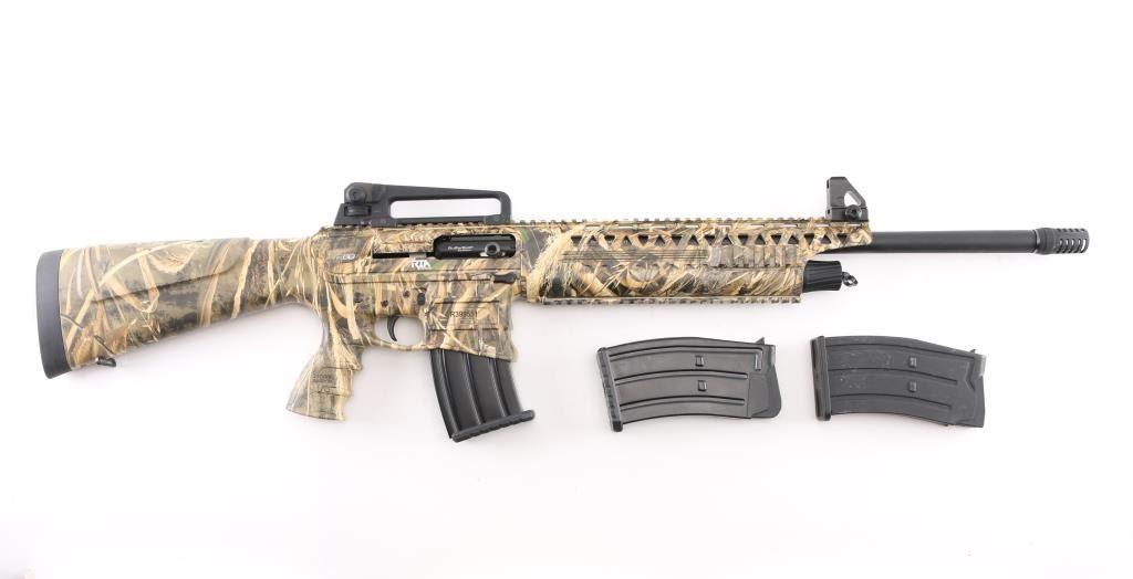 Manufactured in Turkey, imported by Apintl/Rock Island Arms.. Semi-automatic, gas operated, tactical shotgun chambered for 3" 12 Ga. shells. MOD choke/muzzle brake installed. Patterned after the AR15 platform. Matte black, 19.7" barrel, 14.1/4" LOP, polymer furniture, handguard has accessory rails at the 12, 3,6,9 o'clock positions, rubber recoil pad, large charging handle, Realtree Max 5 camo finish, carrying handle with A2 style sights. Manual safety, 5 rd magazine. Shotgun is in like new condition. Bore is pristine. Comes with two extra magazines. NRA Condition-Excellent/like New. Modern Firearm.