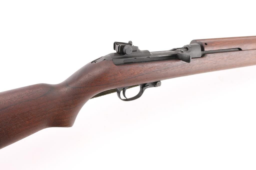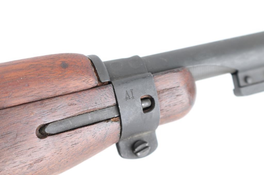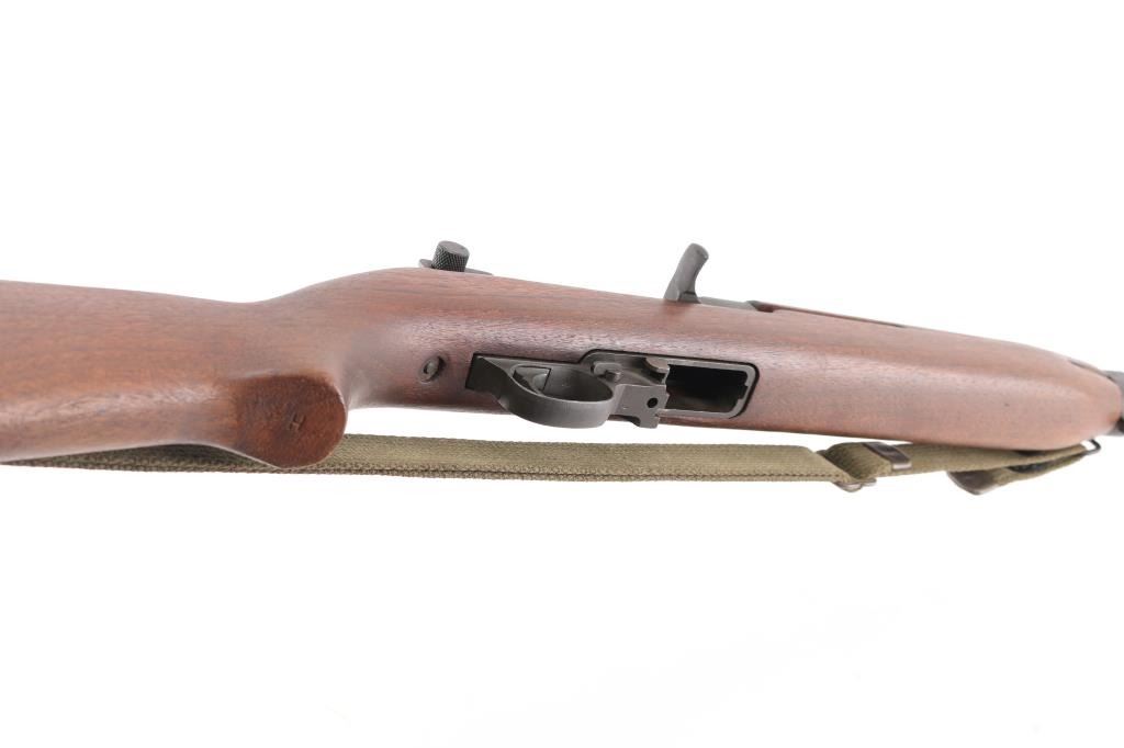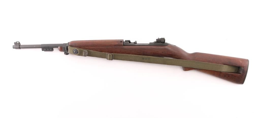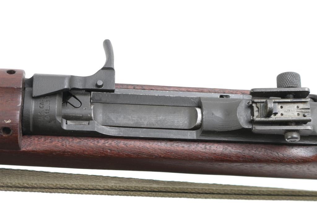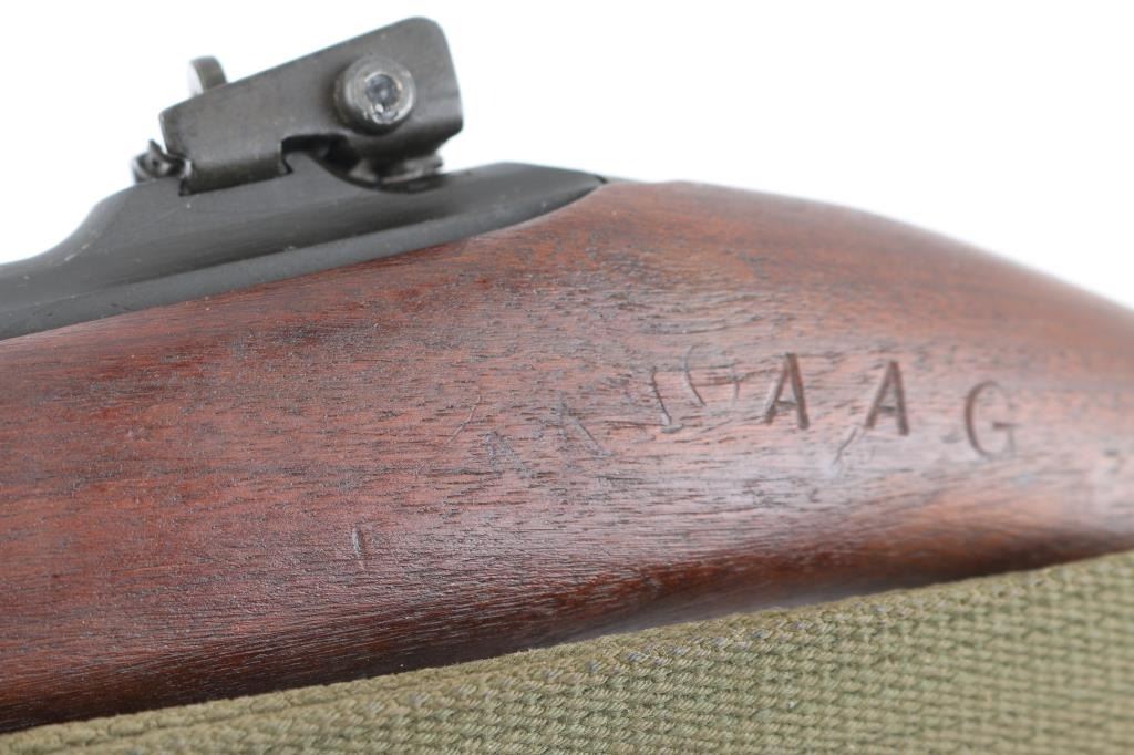 SN: 1918860 US military semiautomatic rifle manufactured circa mid-1944. Features parkerized finish, walnut stock & handguard, protected blade front sight marked "EU", peep rear sight with sliding elevator, 18" barrel, rotating "flipper" manual safety, front sling swivel, sling slot in butt, accepts detachable magazine, later type barrel band with bayonet lug. Flat top bolt, two rivet handguard. Bore appears excellent/bright. Retains 85% re-finish, colors and textures consistent with post WWII rework, dark flat gray, shows loss on edges and where moving parts rub. Wood is very good condition with minor dents & dings. Markings include "UNDERWOOD 7-44 (flaming bomb)" on barrel, large "P" stamped on grip bottom. Deep "AAG" on left wrist, next to faint "AHO". No importer marks observed. No magazine. Web sling & oiler attached. Condition is NRA Very Good+ (arsenal rework) *** C&R Firearm ***