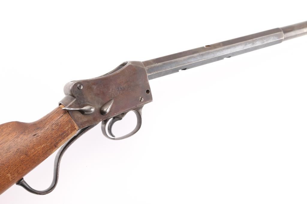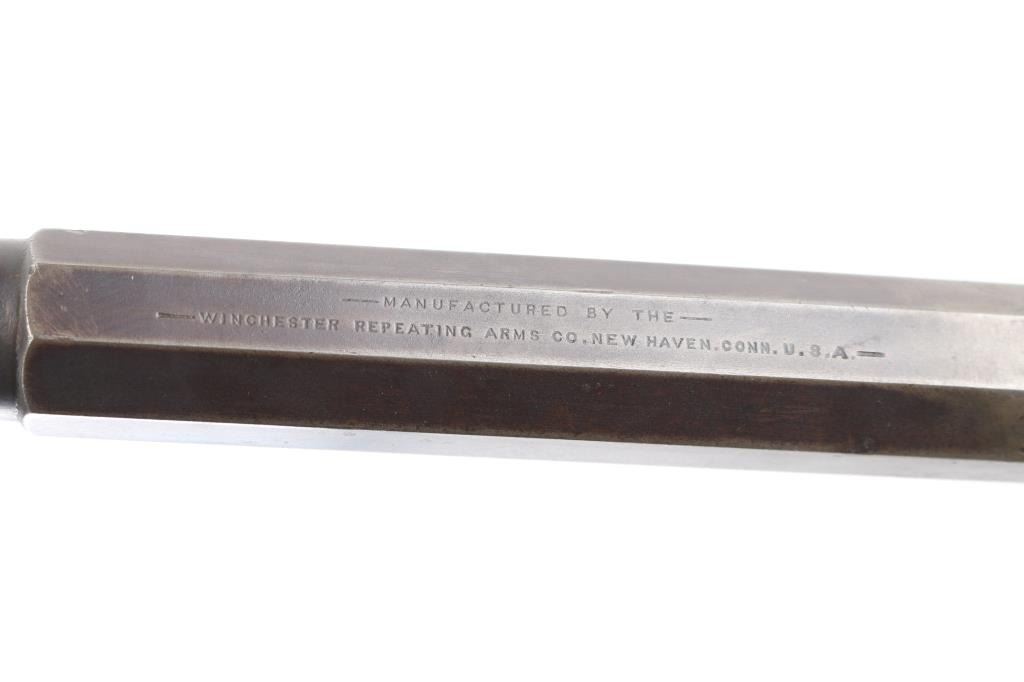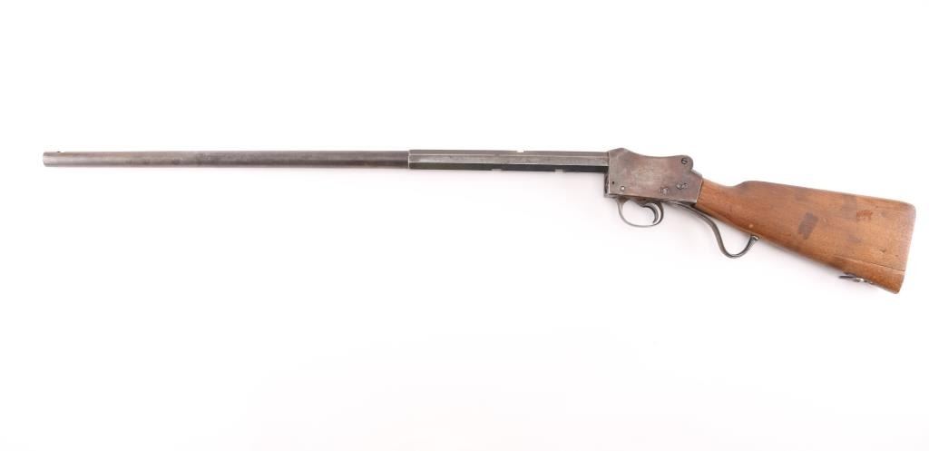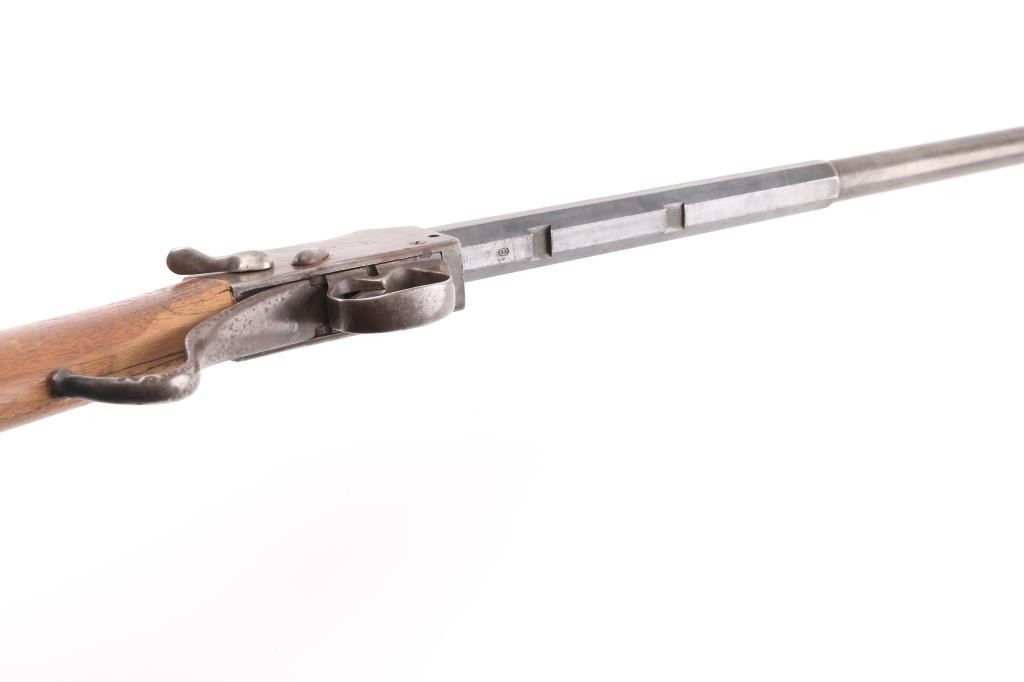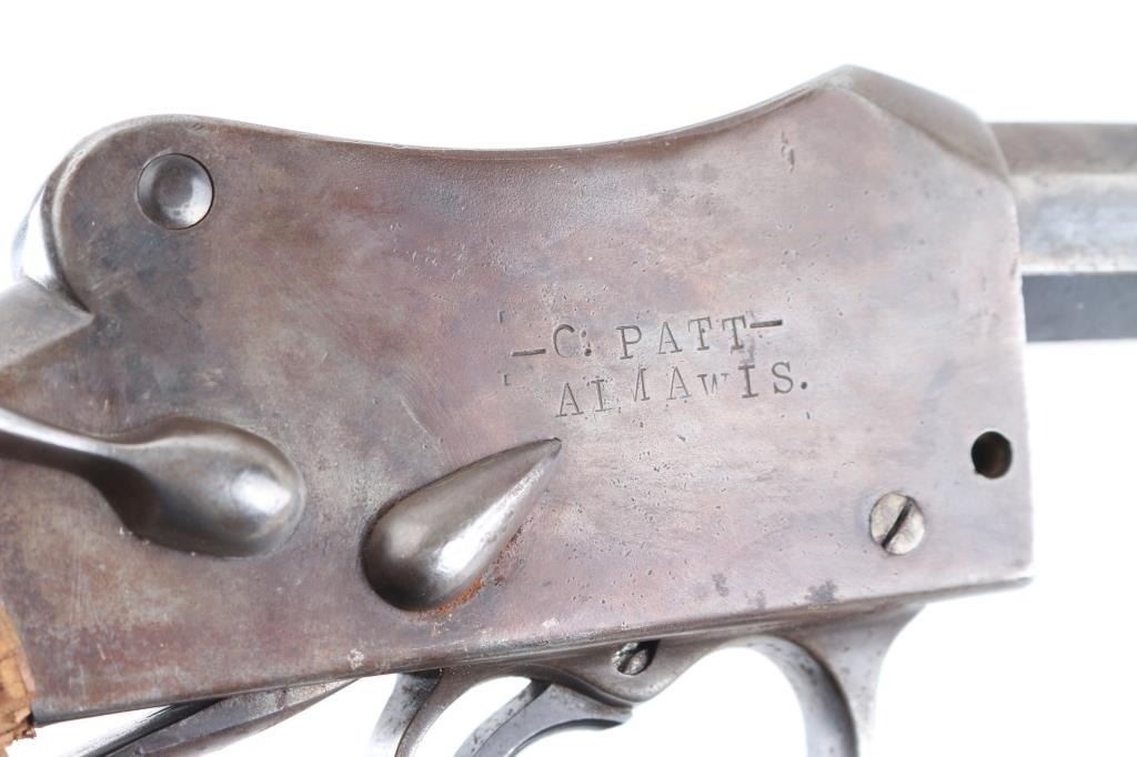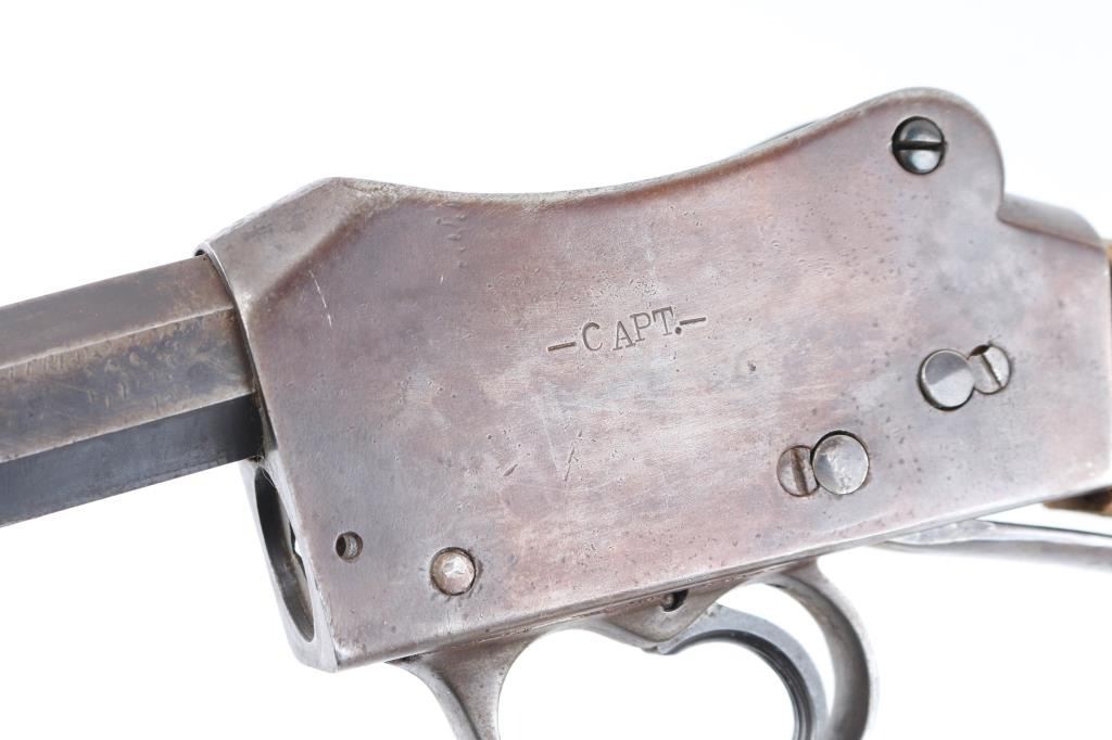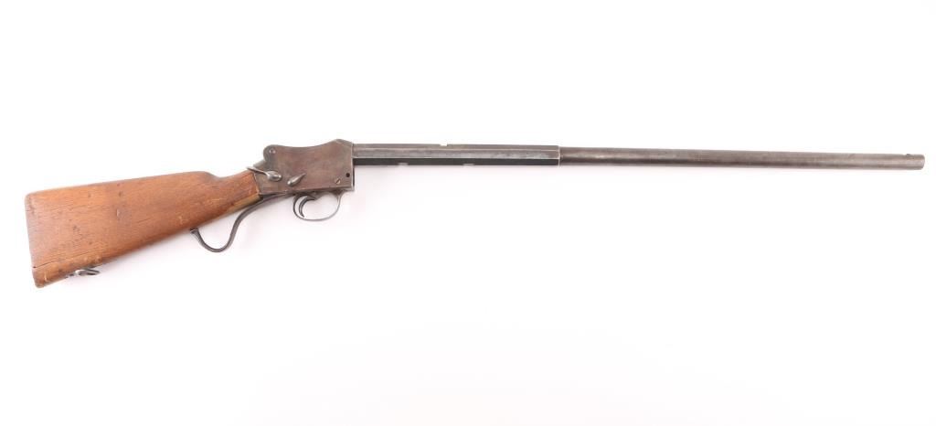 This is a Martini-Henry action rebarreled with a Winchester 32-40, 1/3 octagon, round barrel. 29", two line Winchester markings on top flat, caliber marked on bottom flat. Bore is very good/bright with some minor areas of very light pitting. No sights, empty dovetails. Has turned a gray/brown patina, with blue on the lower underside. No forearm. Action is unmarked, except for "E.G." on the triggerguard. The left side is stamped -CAPT.-, the right side is stamped -C.PATT- over "AIMAWIS-(?). Buttstock is poor, cracked, not original, no buttplate, Falling block action works well. NRA Condition-Fair-Needs restoration. Antique Firearm.