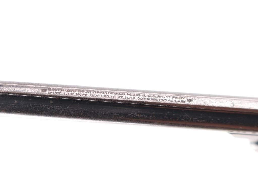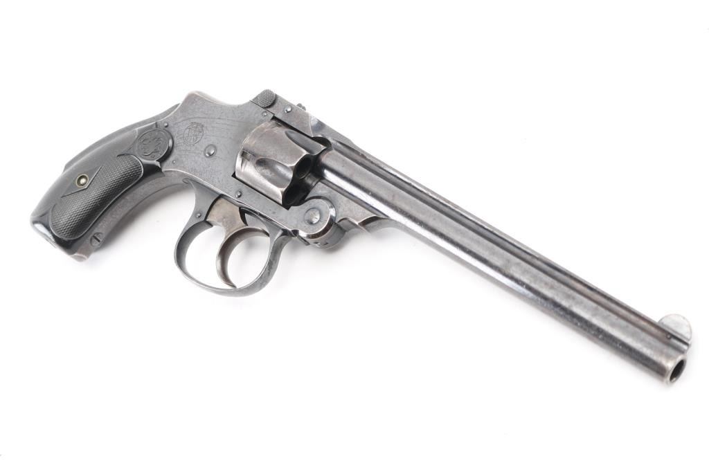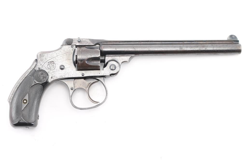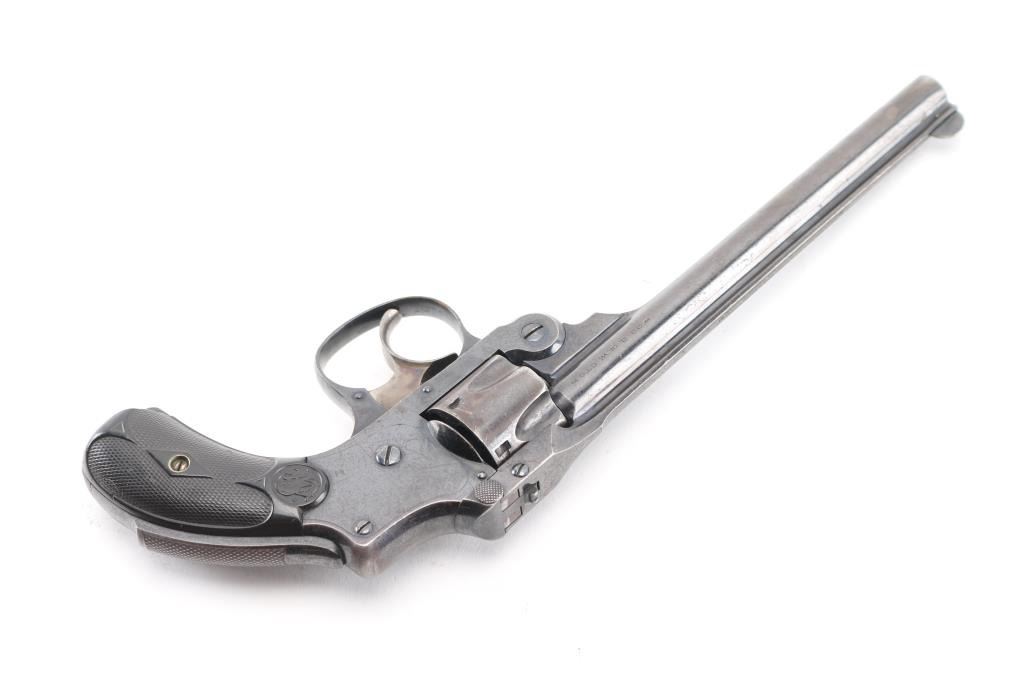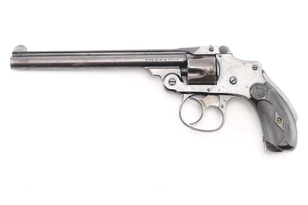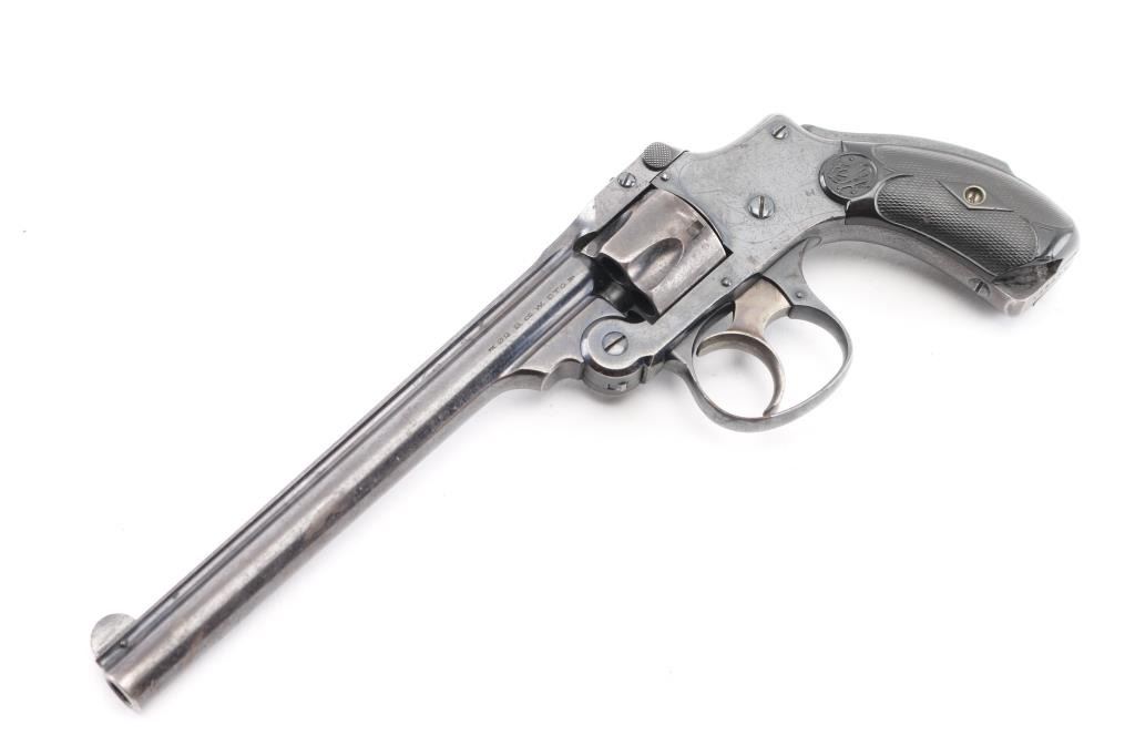 AKA the 'Lemon Squeezer' or 'New Departure'. 4th model, manufactured 1898-1907. Blue finish, blued triggerguard, rare 6" ribbed barrel, pinned front sight, checkered rubber grips with S&W monograms, grip safety, standard markings with S&W trademark on the right frame. Matching serial numbers on the grip frame, cylinder, & barrel latch. Blue finish is very good with scratches, handling wear, bore is excellent/bright, grips are overall very good, but there is a chip out of the bottom left panel., tight lock-up, action is crisp. Traces of case colors on the trigger. NRA Condition-Very Good. C&R Firearm.