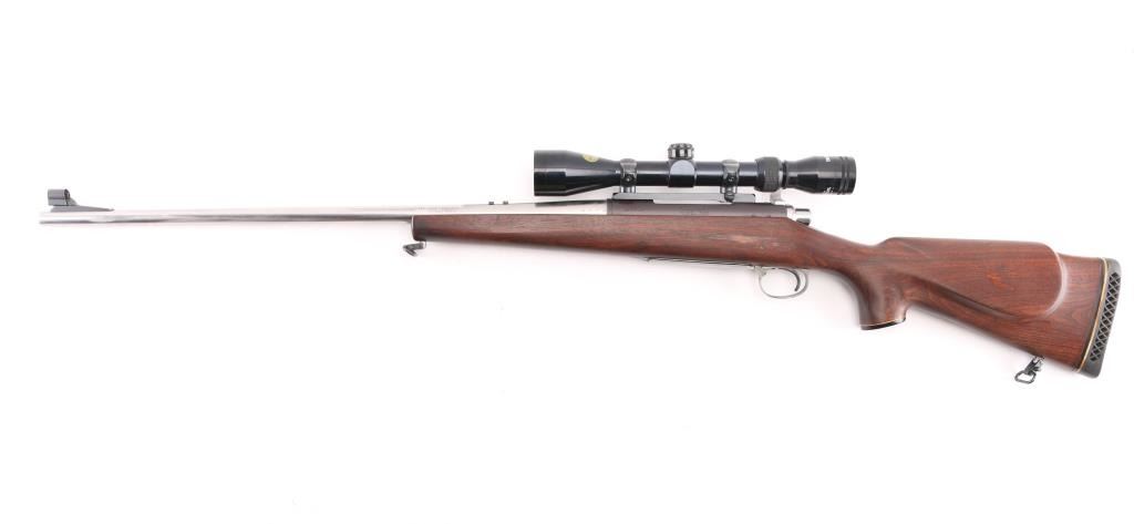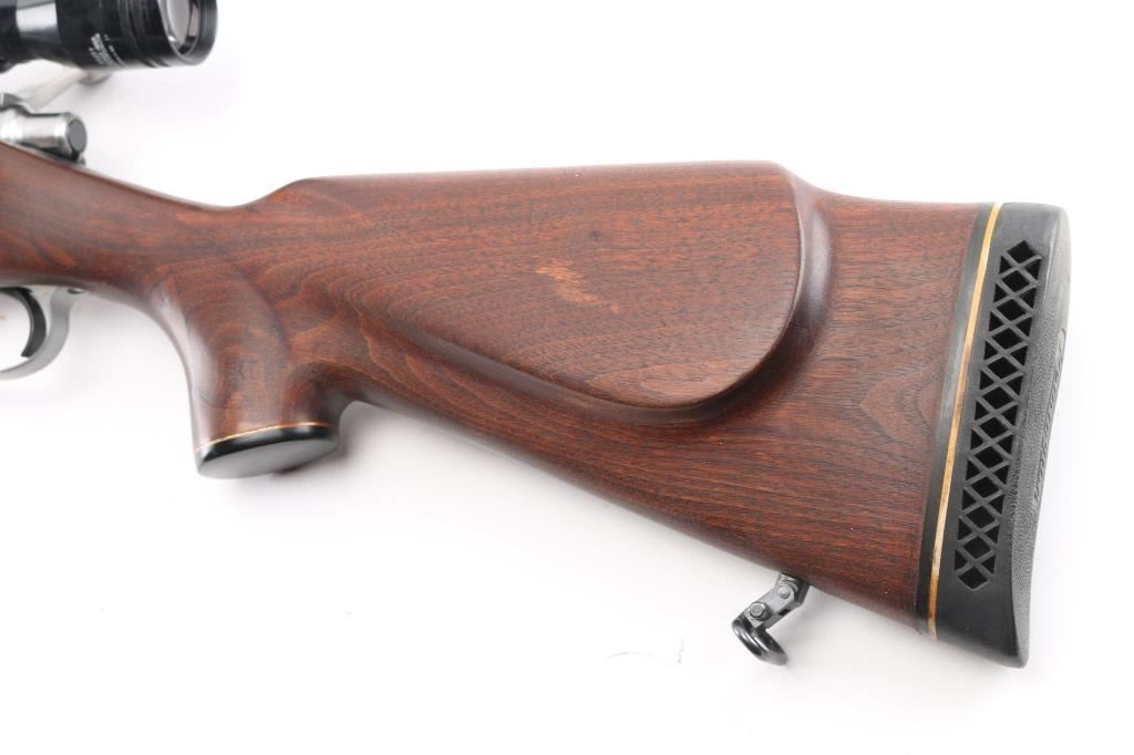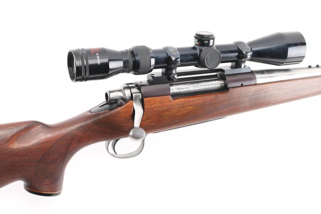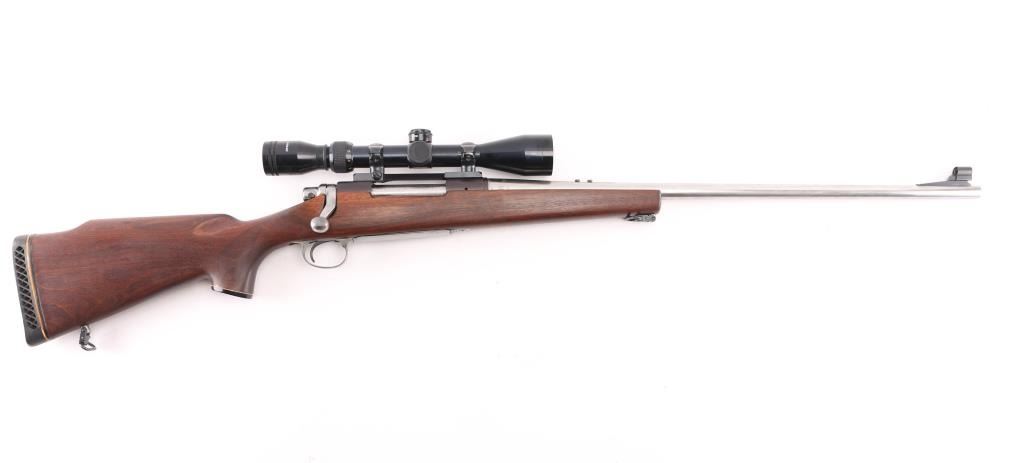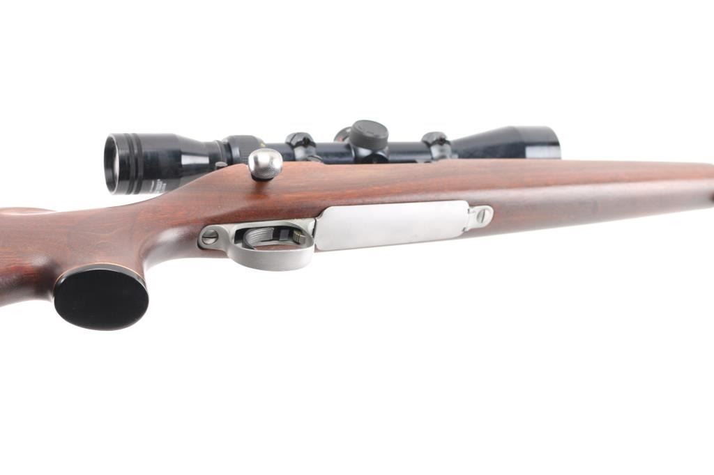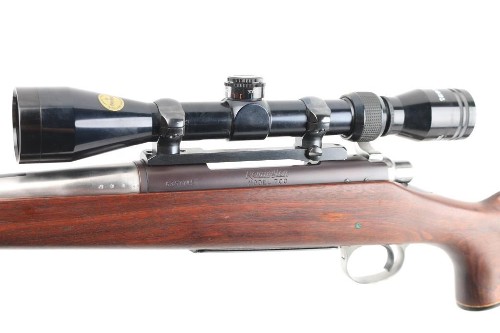 Slightly customized bolt action rifle. Features bare metal finish, blued receiver, 24" barrel with hooded ramped blade front sight (drilled & tapped for rear sight, not installed, with plug screws), Redfield one piece base with rings mounting a Japanese made Tasco 3-9x40mm scope with duplex reticle, hinged floorplate, manual safety. Oil finished smooth walnut stock features right hand cheekpiece, Remington ventilated rubber recoil pad, sling studs. Bore appears pristine. Retains 95% finish on receiver only, small patch of bluing retained where rear sight used to sit, some buffing marks showing on bare metal barrel. Stock is very good condition. some scuffs and other signs of use, appears modified or aftermarket. Scope is very good condition with clear view. Condition is NRA Very Good as modified *** Modern Firearm ***