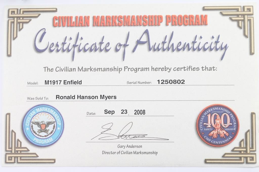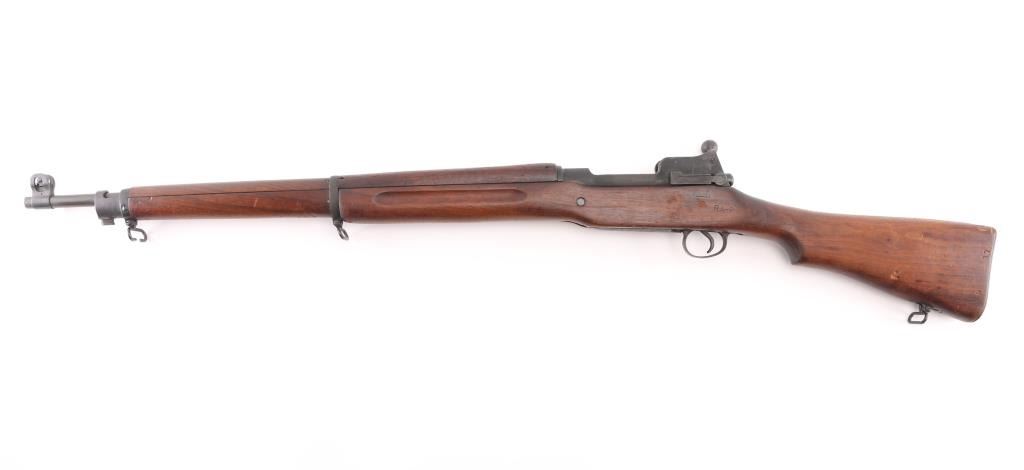 "CMP" US military Mauser pattern bolt action rifle manufactured for use in WWI by the Eddystone division of Remington. Often referred to as "Enfield", due to British Enfield type rifling. Refinished with parkerizing, appears arsenal applied. Features 26" barrel, blade front and peep rear ladder sights both protected by steel guards, manual safety, 6 round magazine, wood handguard & stock with grasping grooves, trap door in butt, sling swivels, stacking swivel. Bore is very good condition. Retains 90% re-finish, black color, with scrapes and scratches. Wood has been lightly sanded, retains proper military finish, shows loss of sharp edges in forend grooves, some oil staining, dents & dings. Metal fit to wood is very good. Retains US Army Ordnance "bomb" marks. Cartouches on stock include "RA-P". "E" marked barrel dated "11-18". Civilian Marksmanship Program (CMP) Certificate of Authenticity is included, certifies this rifle being released from US military stores. Condition is NRA Very Good++ as refinished *** C&R Firearm ***