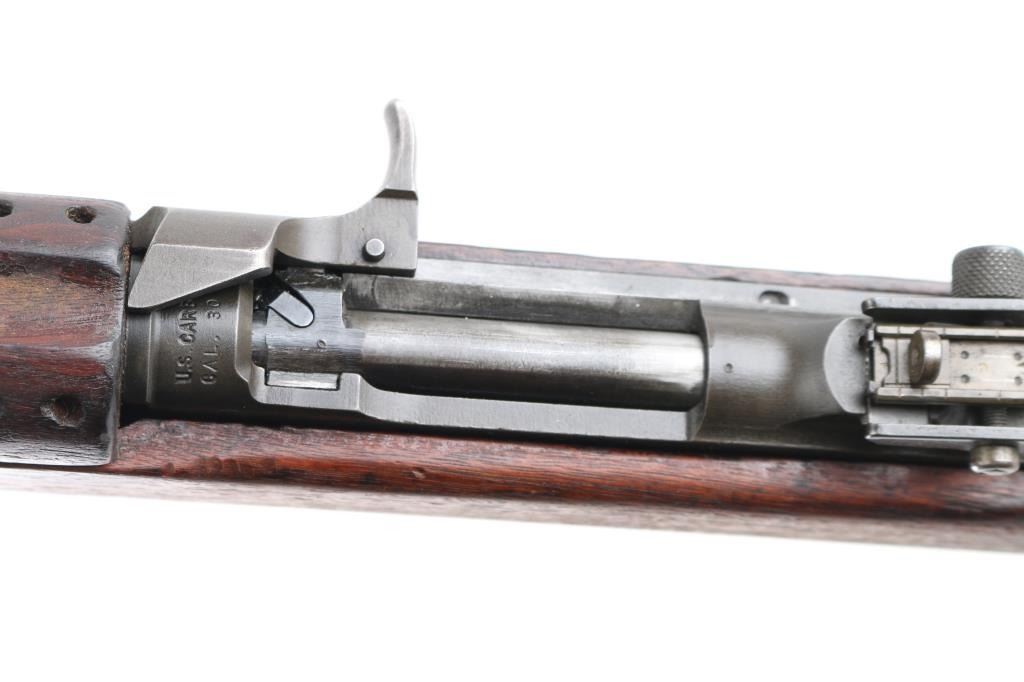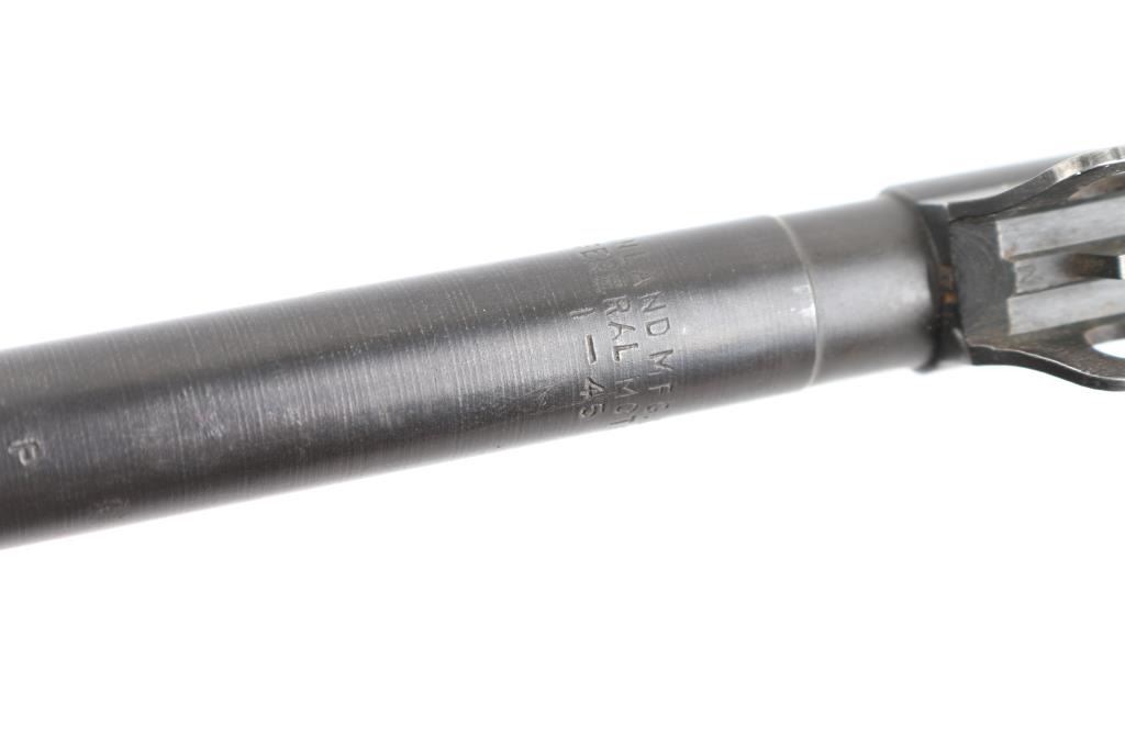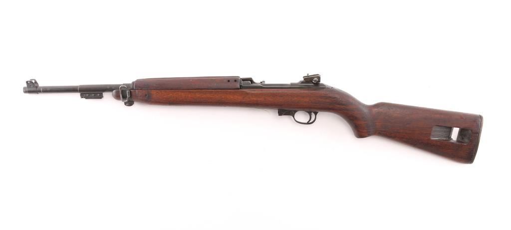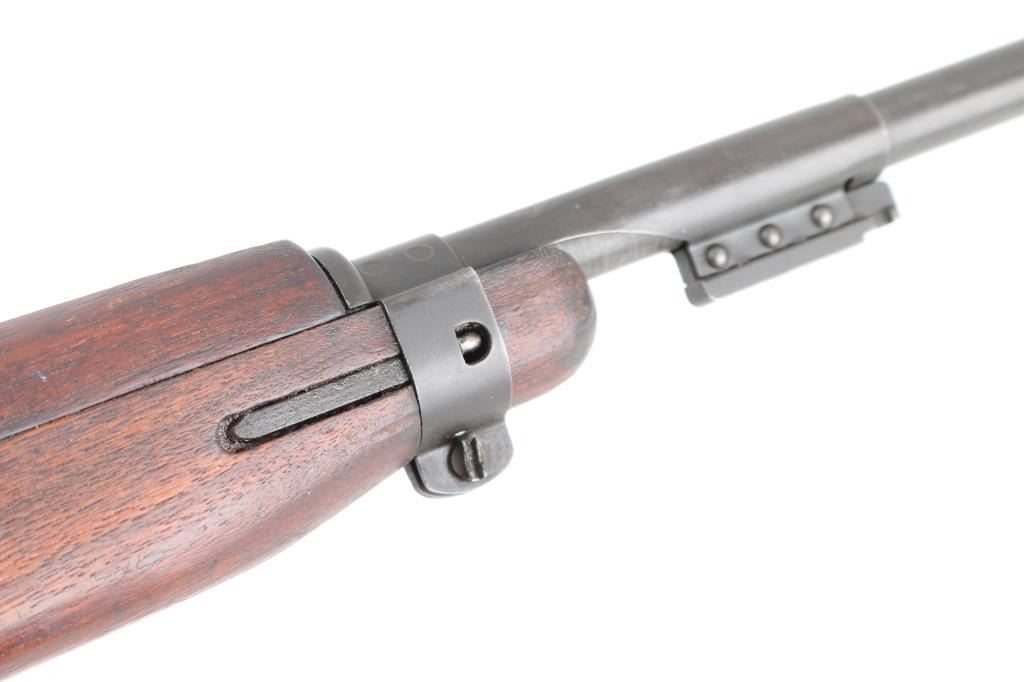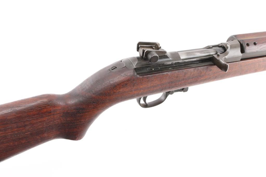 US military semiautomatic rifle manufactured circa early 1945. Features parkerized finish, walnut stock & handguard, protected blade front sight, peep rear sight with sliding elevator, 18" barrel, push button manual safety, front sling swivel, sling slot in butt, accepts detachable magazine. Later type barrel band with bayonet lug. Round top bolt, four rivet handguard. Bore appears excellent/bright. Retains 85% brown tinted finish, colors and textures consistent with US production or US military arsenals, shows loss on edges and where moving parts rub. Wood is good condition with minor dents & dings, some erosion and slightly rough texture, varnish added. Markings include "INLAND MFG. DIV. GENERAL MOTORS 1-45" on barrel. No importer marks observed. No Magazine. Condition is NRA Very Good *** C&R Firearm ***