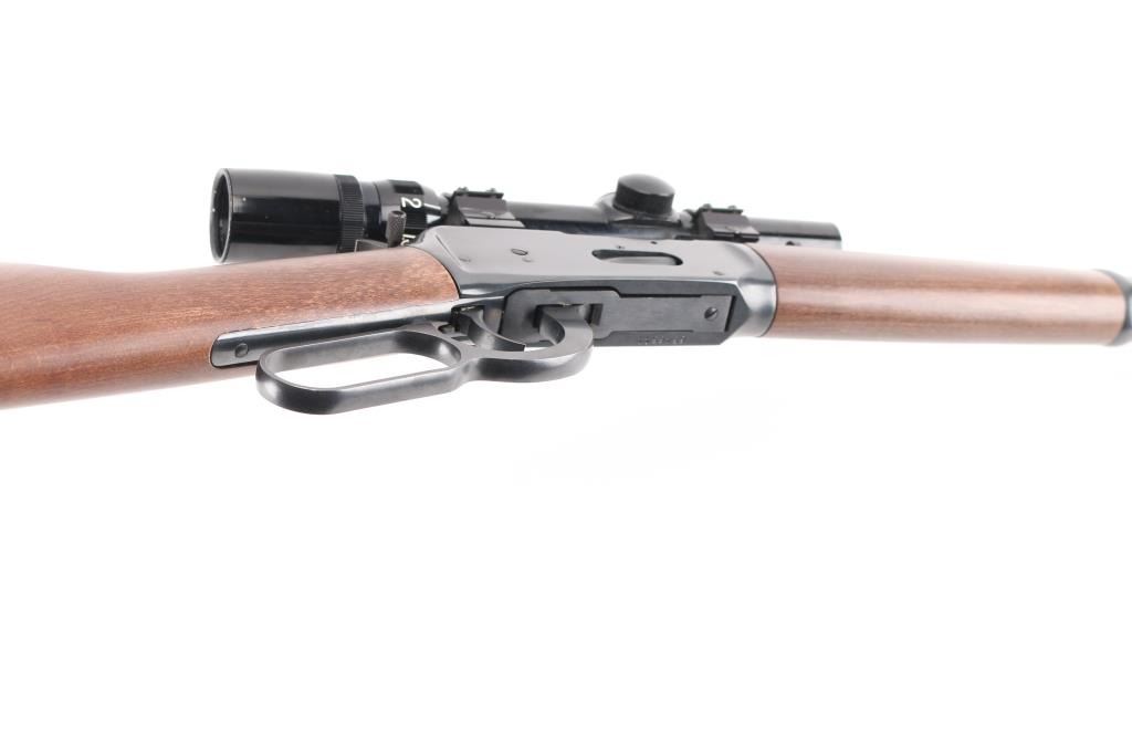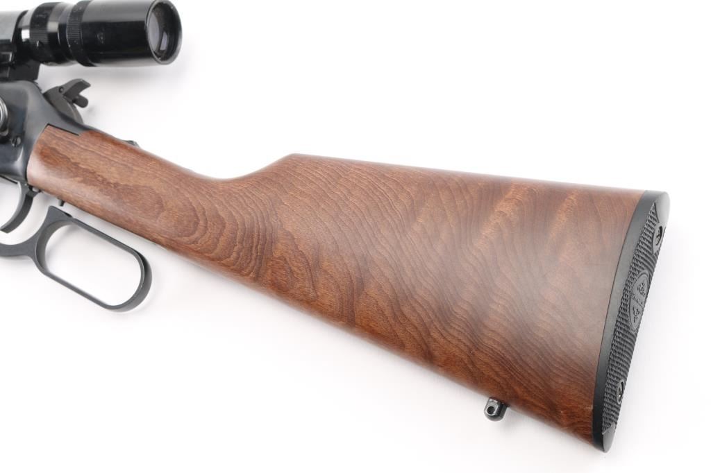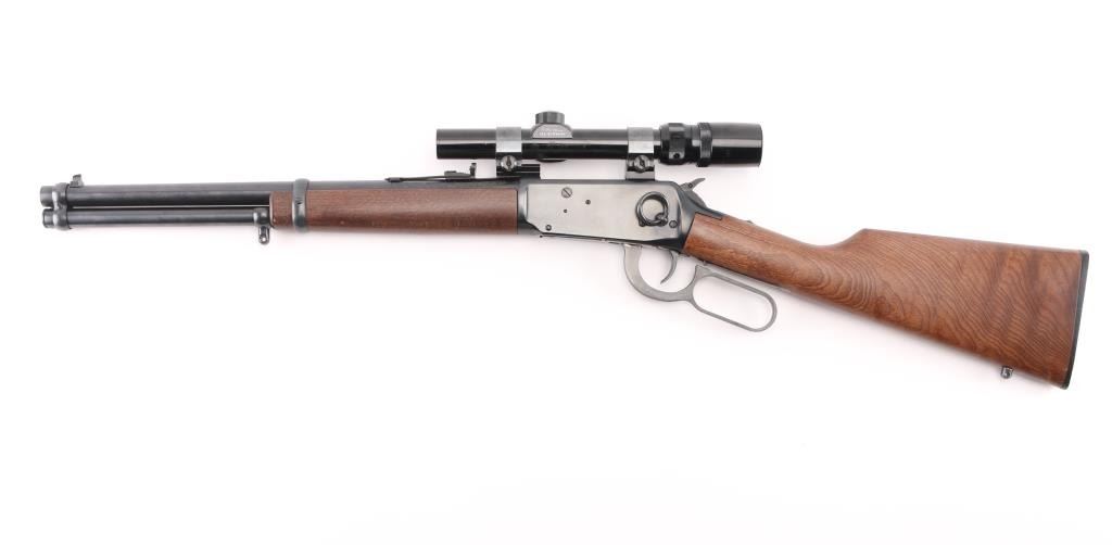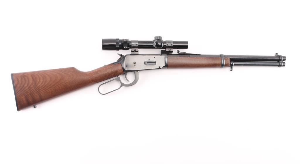 SN: 65465443. Lever action saddle ring carbine features blued finish, wood forend & straight gripped stock, factory plastic buttplate, 16" barrel, blade front sight, adjustable rear sight, full tube magazine under barrel, sliding tang safety. Saddle ring present, finger extension on hammer. Bore is excellent condition. Retains 99% blue. Wood is excellent condition. Condition is NRA Excellent. Modern Firearm.