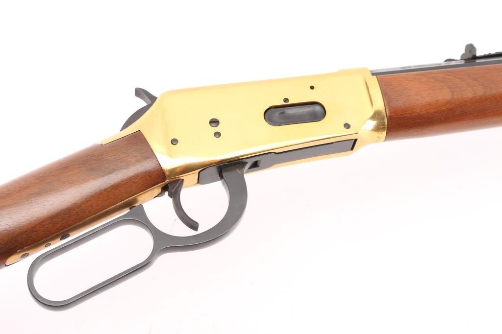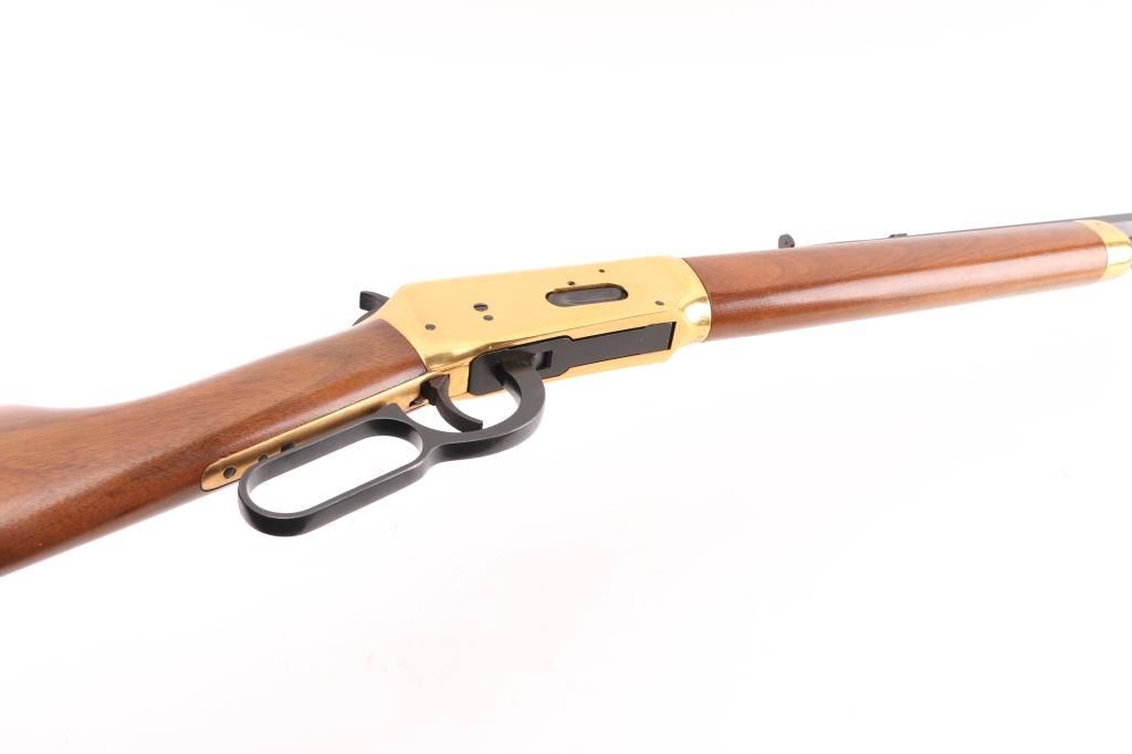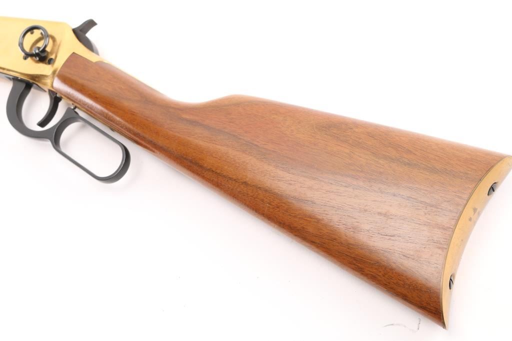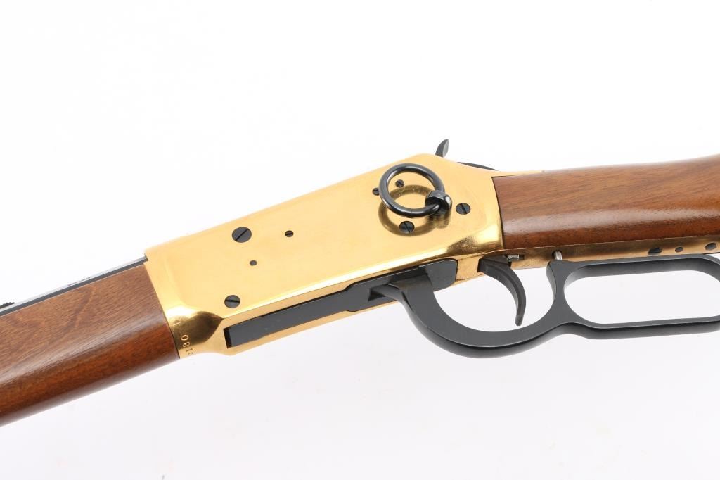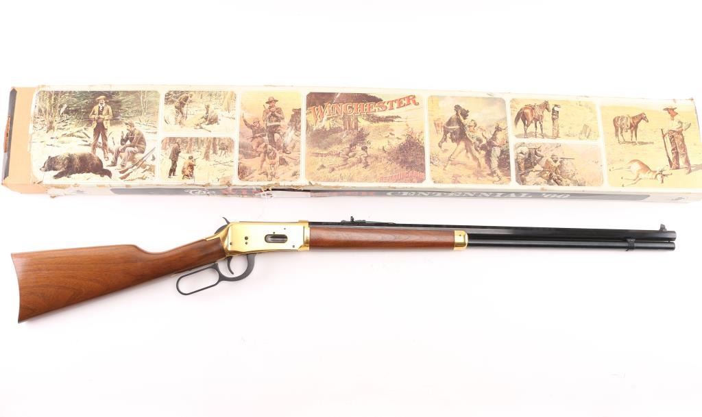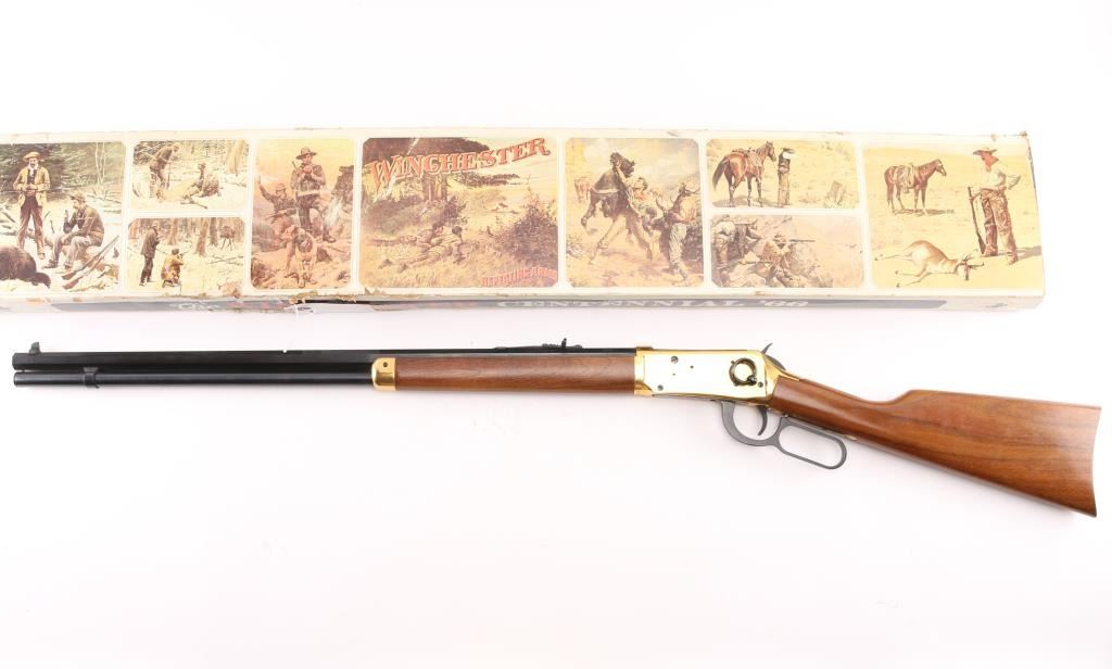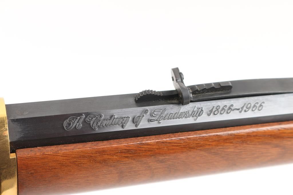 Made in America circa 1966 as one of only 102,309 reported to have been produced. This is a very nice commemorative lever action repeating rifle celebrating 100 years of the Winchester company. “A Century of Leadership 1866-1966” is roll stamped on the right side of the barrel. Features a blued 26" octagonal barrel, full length magazine tube, dovetailed blade front sight, adjustable rear sporting sight, smooth trigger with beveled edges, serrated hammer spur, grip safety, saddle ring, brass colored receiver, smooth walnut forend with glossy finish & brass colored metal cap and select grade straight grip shoulder stock with brass colored smooth metal buttplate. The tang reads "Winchester Centennial '66". The metal finish looks great. The receiver looks good with some surface scratches and handling marks. The wood stocks look excellent with almost no sign of use or handling. The bore is excellent/bright. The action is smooth. LOP is 13 3/4". Comes with the factory box and original colorful sleeve, with manual, documents. Sleeve has some loss, tears. Condition is NRA Excellent. Modern Firearm.