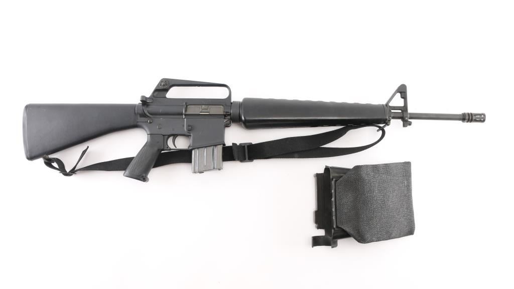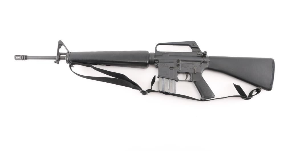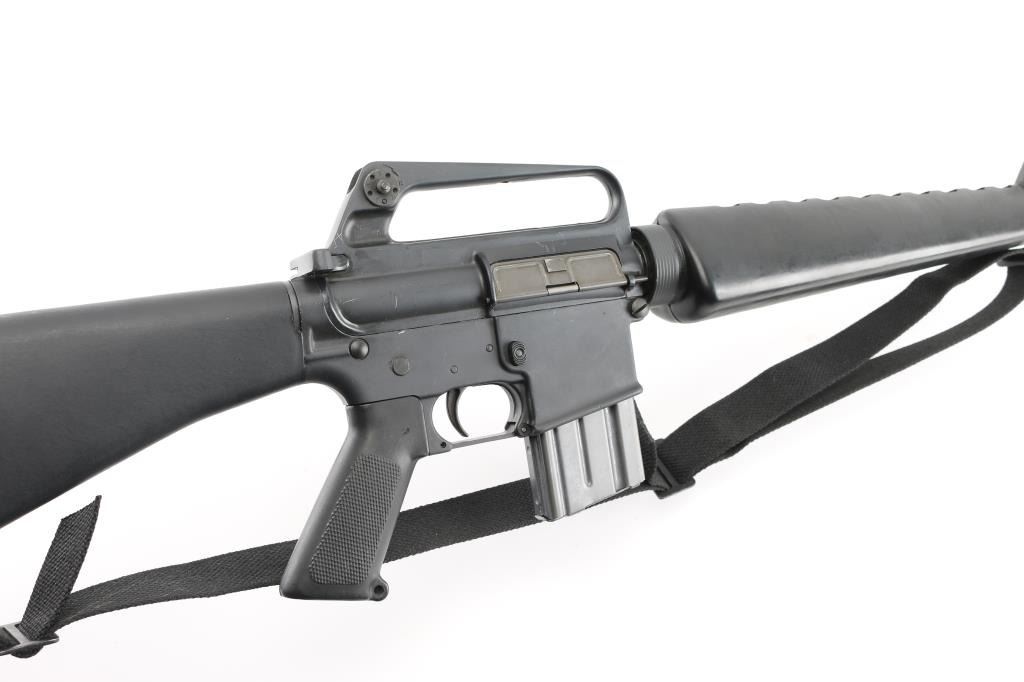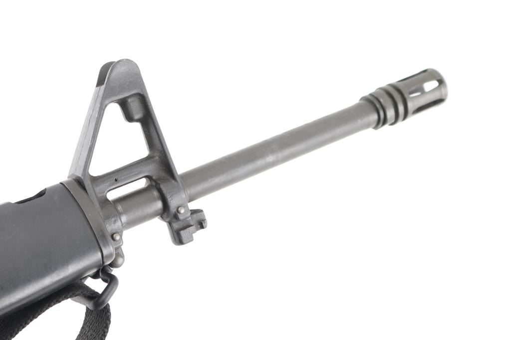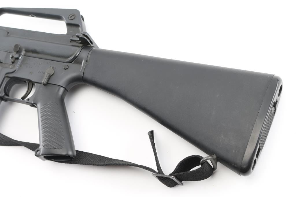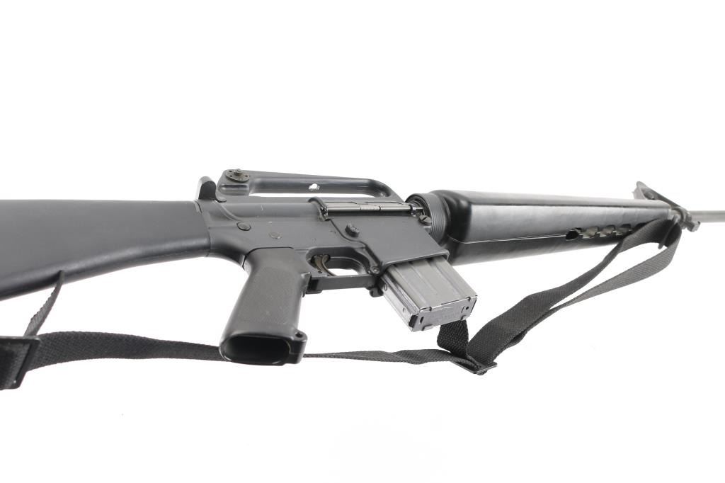 'R6000' Semiautomatic rifle manufactured circa 1979. Features parkerized finish, black plastic furniture, early A1 length fixed stock without butt storage compartment, triangular cross section hand guards, 20" lightweight barrel, 6 flute bird cage flash suppressor, bayonet lug, adjustable sights (front post sight with protector ears, rear L-flip peep), early "slick side" A1 type upper receiver without forward assist, spring loaded ejection port cover, early style lower receiver without fence around magazine release, dual screw style front take down pin, manual safety, sling swivels. Barrel appears earlier 1-12 twist, hard chrome lined, marked "C MP CHROME BORE". Bore is excellent condition. Overall external appearance is near excellent, retaining approx. 95% finish with few light scuffs, some minor edge losses. Polymer is excellent. Close to new appearance with very little rubbing wear on bolt carrier. Includes black nylon web sling, manual, (1) very good condition Colt 20 rd magazine with aluminum follower, clip-on brass catcher. Condition is near NRA Excellent *** Modern Firearm ***