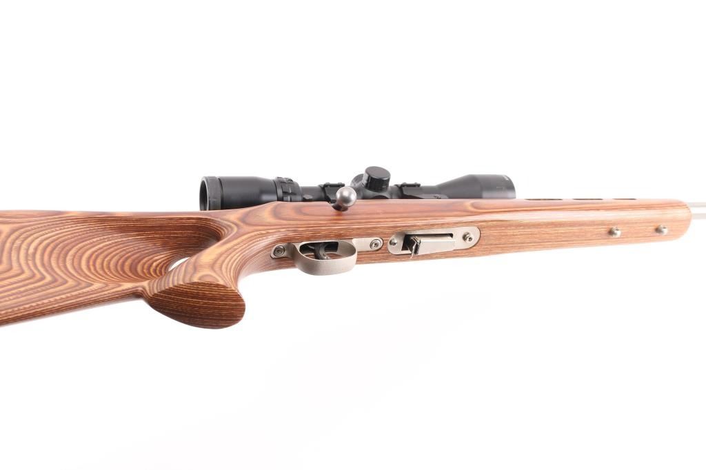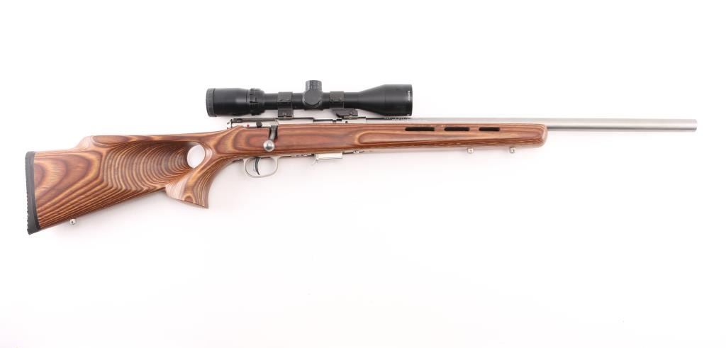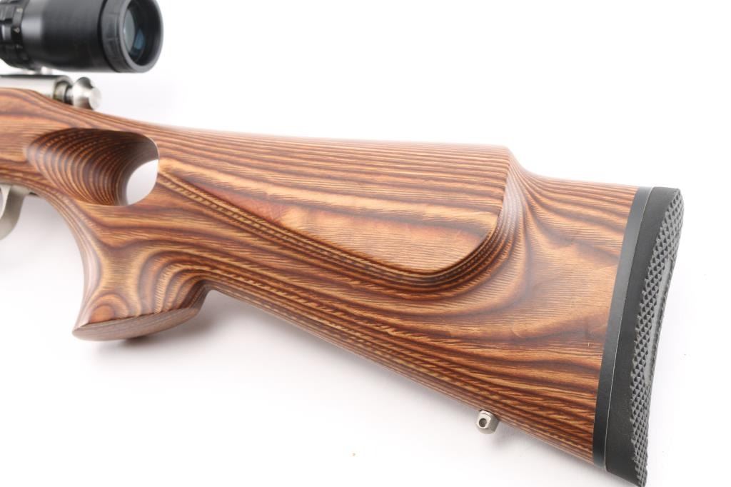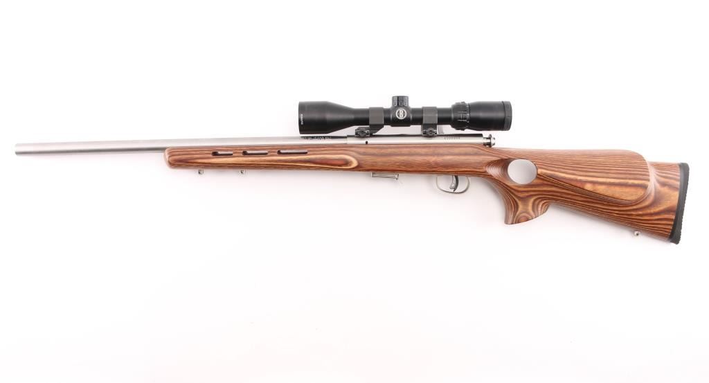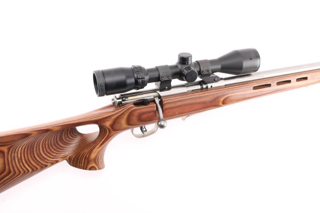 Canadian made rimfire bolt action rifle. Features stainless steel construction, tan & brown laminated wood thumbhole stock with vented forend & right hand cheekpiece, 20.5" barrel, manual safety, trigger safety, no sights, Weaver type two piece scope bases mounting a Bushnell Banner 3-9x scope, sling studs, solid rubber butt pad. Bore is pristine. Overall near new with few handling marks. Scope is excellent, with clear view. Includes one magazine. Condition is NRA Excellent - like new *** Modern Firearm ***