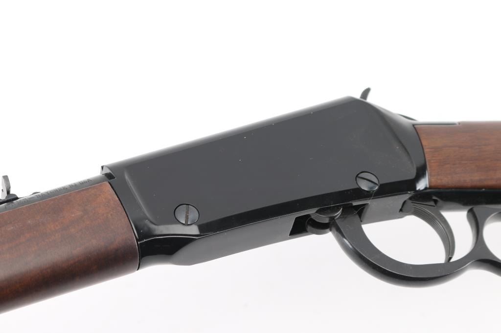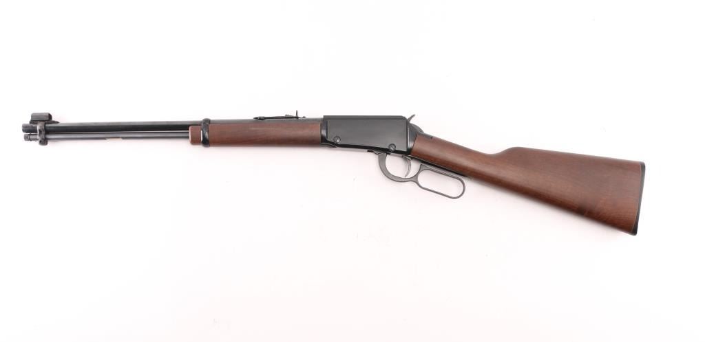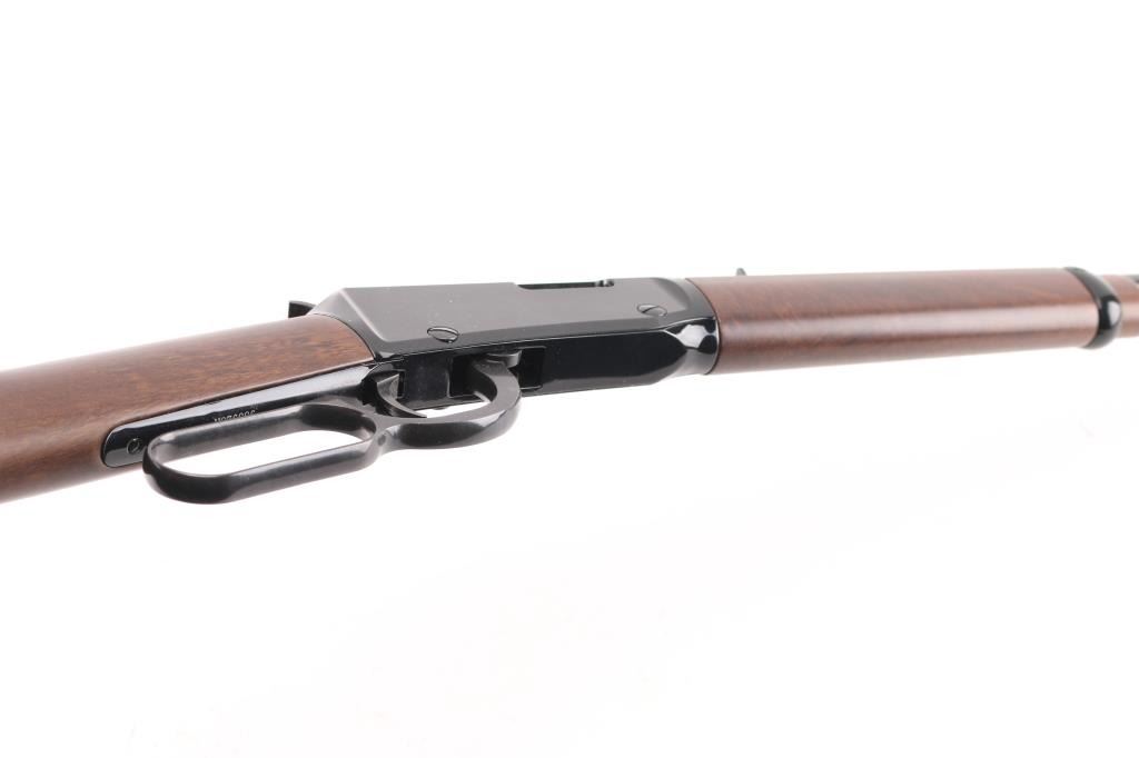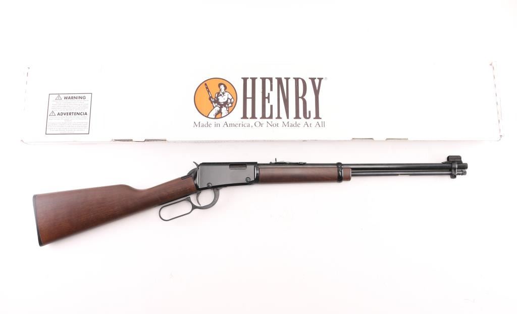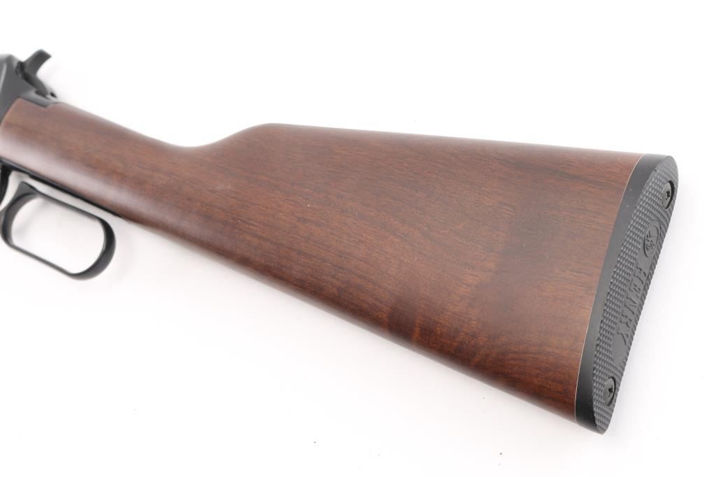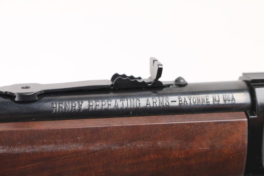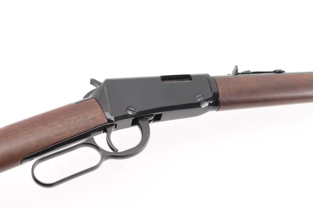 "Made in America or Not Made at All" this Henry lever action rimfire rifle is chambered for .22 S/L/LR. It features a blued 18.5" barrel and receiver, metal barrel band, full length tube magazine, hooded blade front sight, adjustable sporting rear sight, integral scope base machined into the receiver with a serrated trigger and hammer spur. It all fits beautifully in an American Walnut two piece stock with Henry butt plate. Comes with original box. Bore looks great, bright. Metal finish looks great. Wood stocks look great. Very little if any signs of handling or use. Condition is NRA Excellent *** Modern Firearm ***