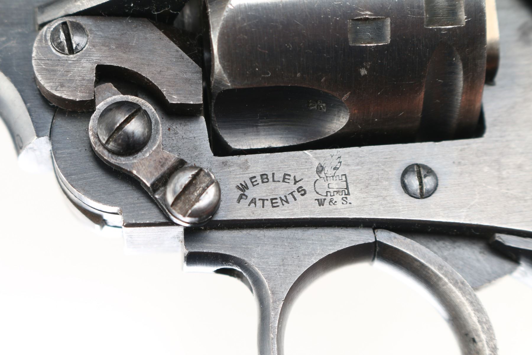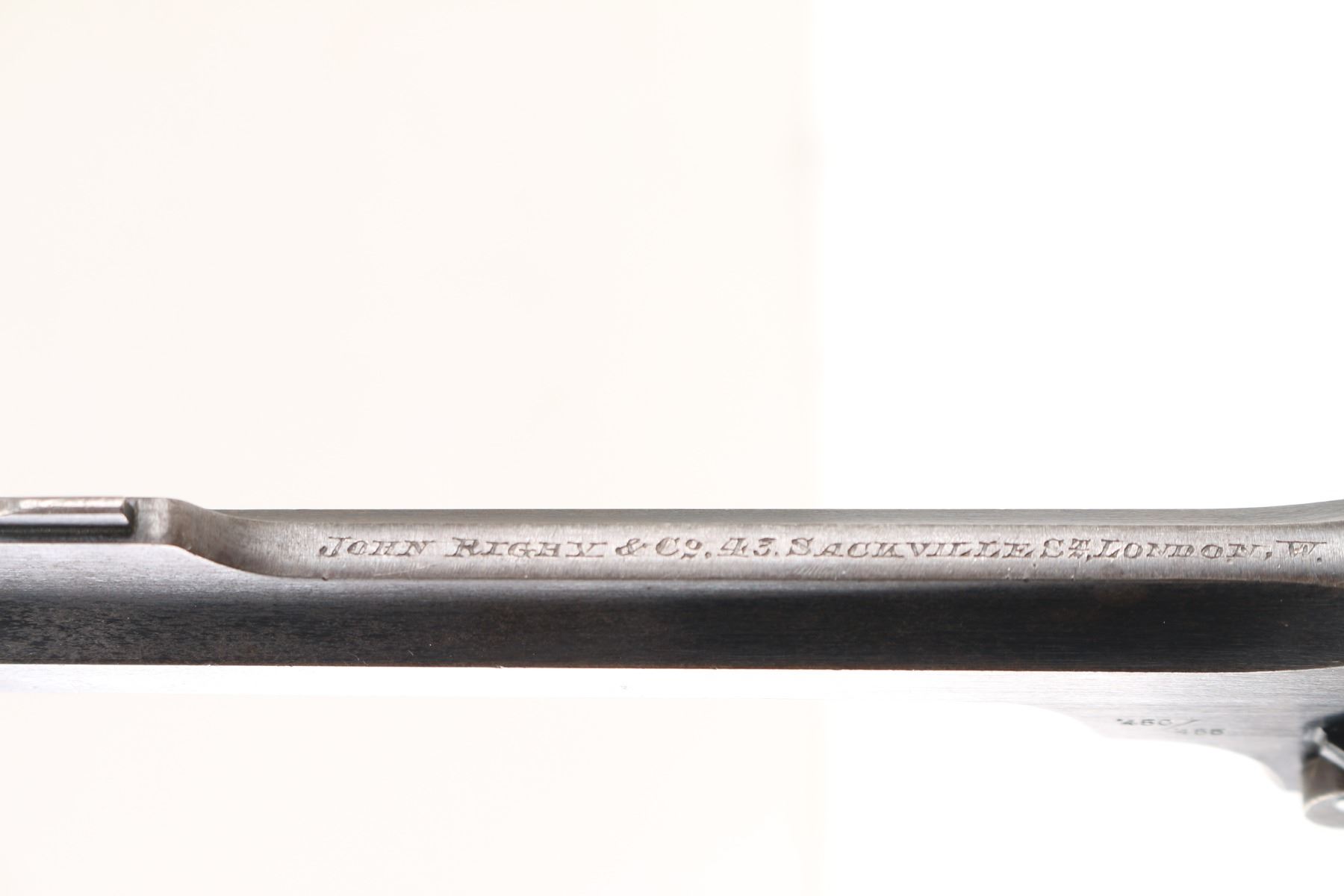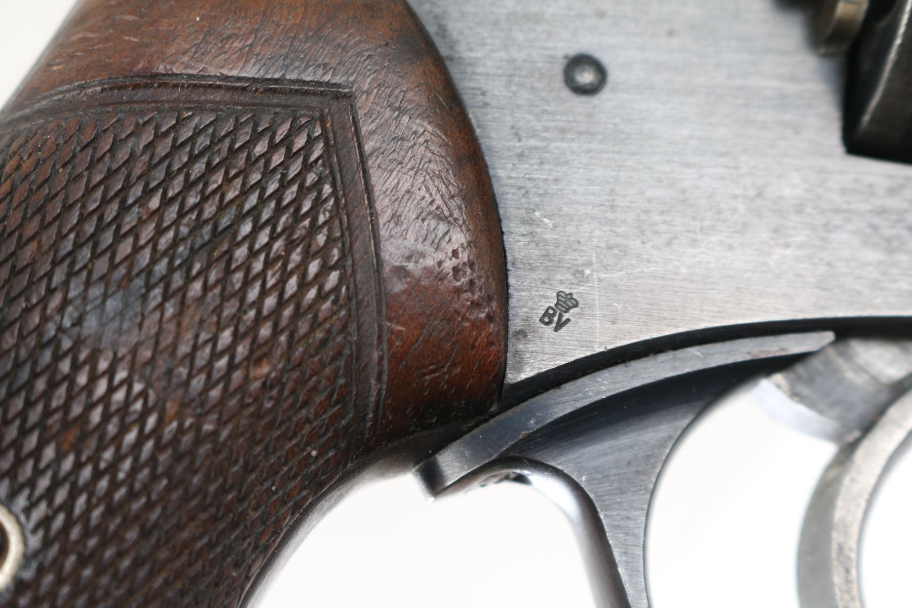'Rigby Marked' British WWI era military break top revolver manufactured between 1905 and 1916. features 6" slab sided barrel, fixed front sight with Partridge type blade, notch rear sight on top latch, 6 shot fluted cylinder, break top style opening for loading and unloading, double/single action operation, square butt grip frame, checkered wood grips, lanyard ring on butt. Bore and charge holes are very good condition. Retains 60% blued finish. fading towards gray overall, much thin brown on bottom left side of frame, with edge losses & handling marks. Grips are good solid condition, scratched & scuffed, no visible chips or cracks. Action operates smoothly, with good lock-up. Markings are generally sharp & readable, include "flying bullet", crown over "BV". Bottom of trigger guard is nicely hand engraved "3953". Top of barrel rib marked "John Rigby & Co. 43 Sackville St London W" (retailer marking). Condition is NRA Very Good. *** C&R Firearm ***