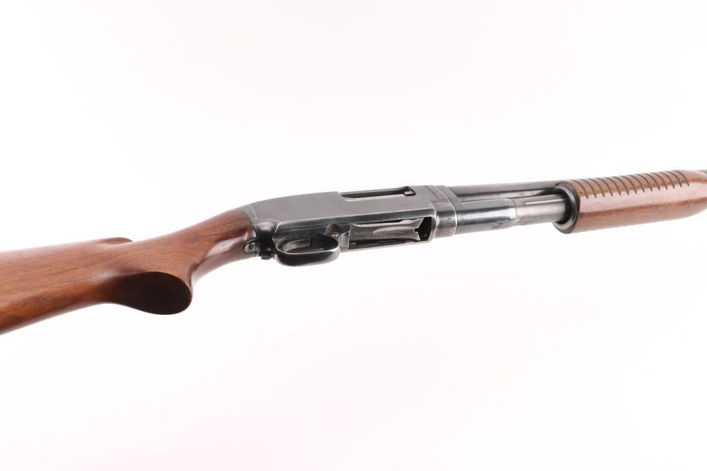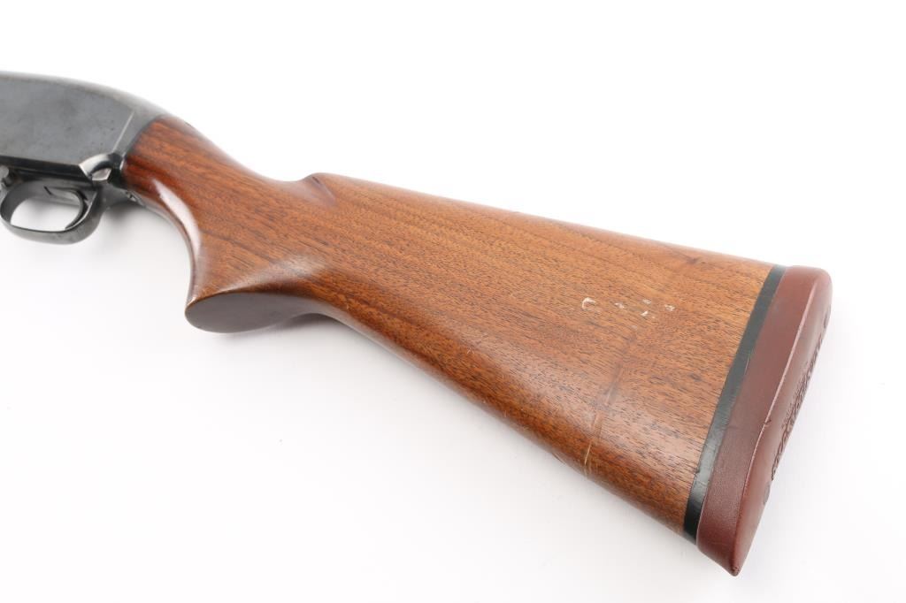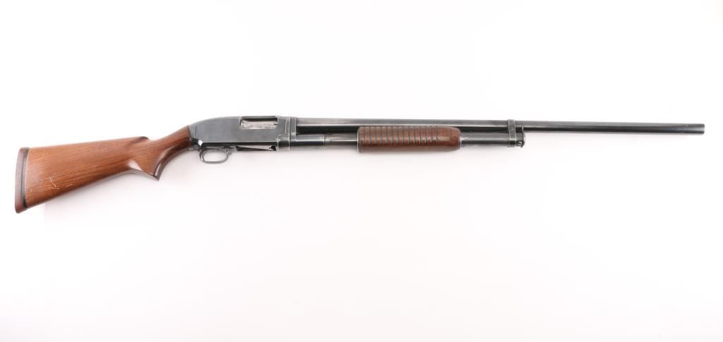 Vintage take down pump action shotgun manufactured circa 1955. Features 30" plain barrel, barrel marked "FULL" choke & "FOR SUPER SPEED & SUPER-X 3 IN", steel front bead, blued finish, smooth walnut semi pistol grip stock & grooved pump handle, red Winchester solid rubber recoil pad. (13 1/2" LOP), push button safety. Bore is very good, bright, needs cleaning. Retains 75% blue with thinning & bare metal from handling, scratches to receiver, small area of patina forming on mag tube. Wood is very good condition with dents and small scrapes. Numbers match on receiver & extension. Markings are crisp. Condition is NRA Very Good *** C&R Firearm ***