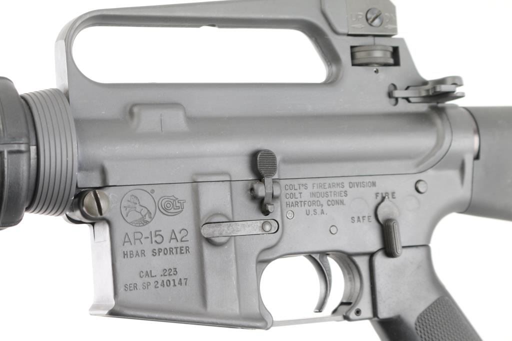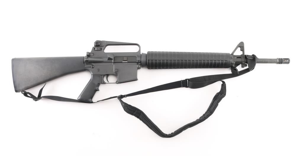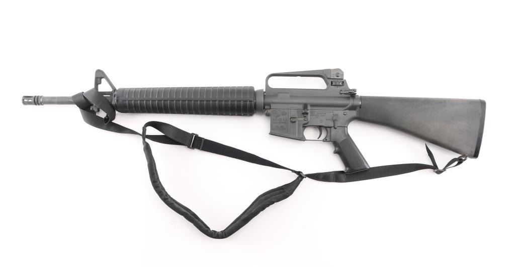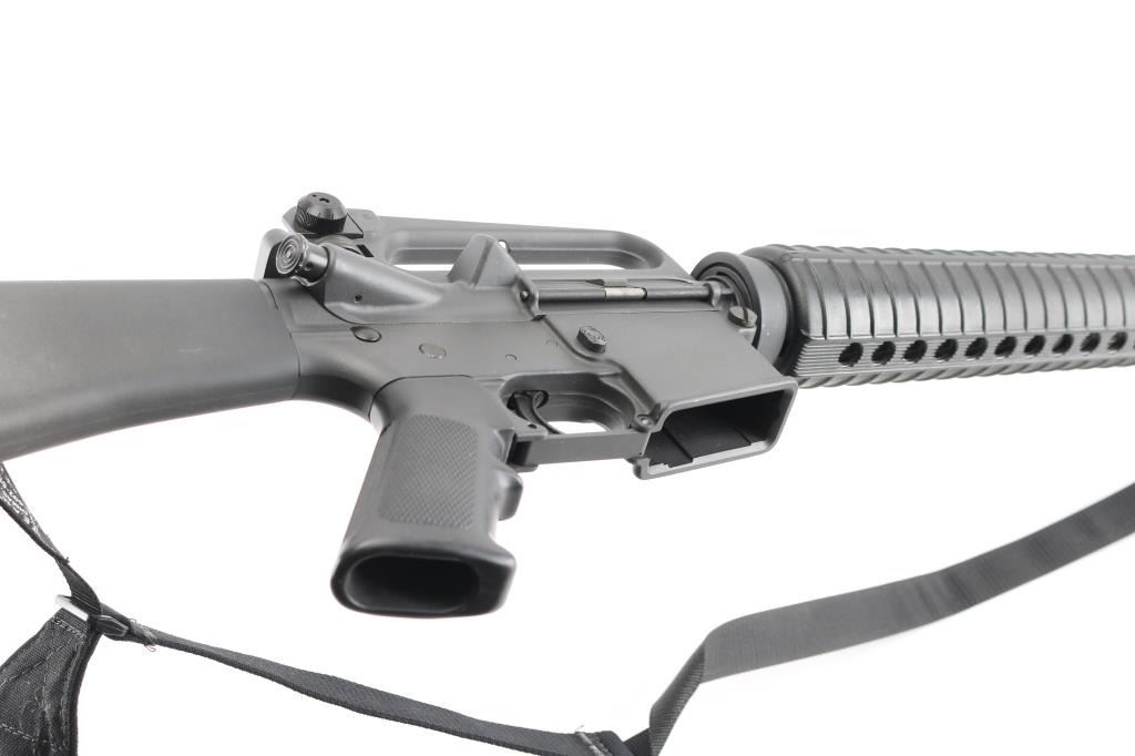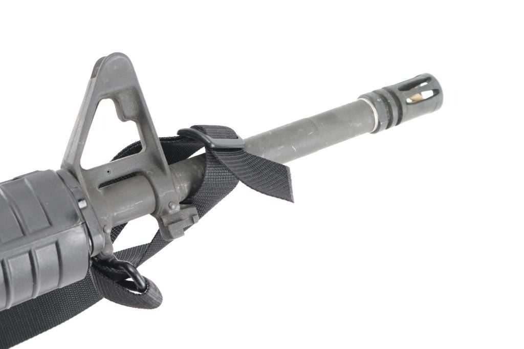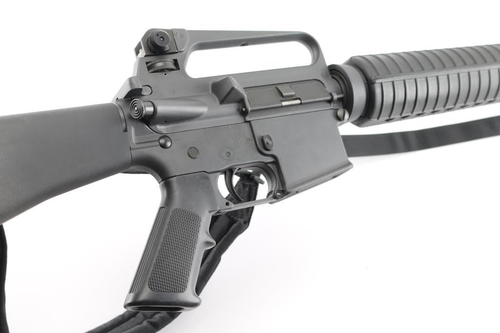 "HBAR Sporter" semiautomatic rifle from the premium original maker. Features parkerized finish, 20" barrel ("C MP 5.56 NATO 1/7 HBAR" marked), 5 flute birdcage flash hider, triangular front sight base with bayonet lug, protected front sight post (square post, 4 position) adjustable for elevation, protected peep rear sight adjustable for windage and elevation selectable for range settings, fixed "carry handle" type upper receiver, push button mag release, manual safety, forward assist button, shell deflector, ejection port cover, fixed buttstock with trap door holding cleaning gear, A2 pistol grip, round handguards with heat shields, sling swivels. M16 type bolt carrier with full circle rear. Has two piece "Chicago Bolt" type pivot pin. Bore is pristine. Overall excellent condition with handling marks, few dings to edge of forward assist button. Black polymer furniture is near excellent with some discoloration. No Magazine. Includes a "T.E.A.M." black nylon sling. Condition is near NRA Excellent *** Modern Firearm ***