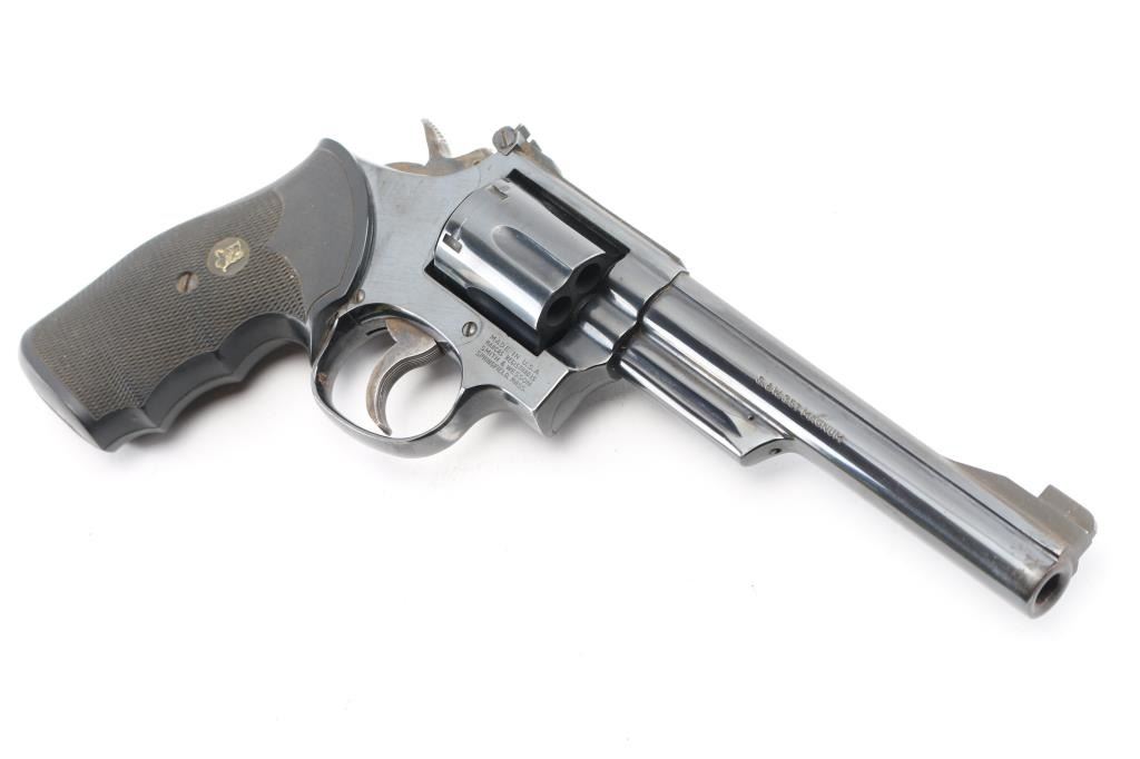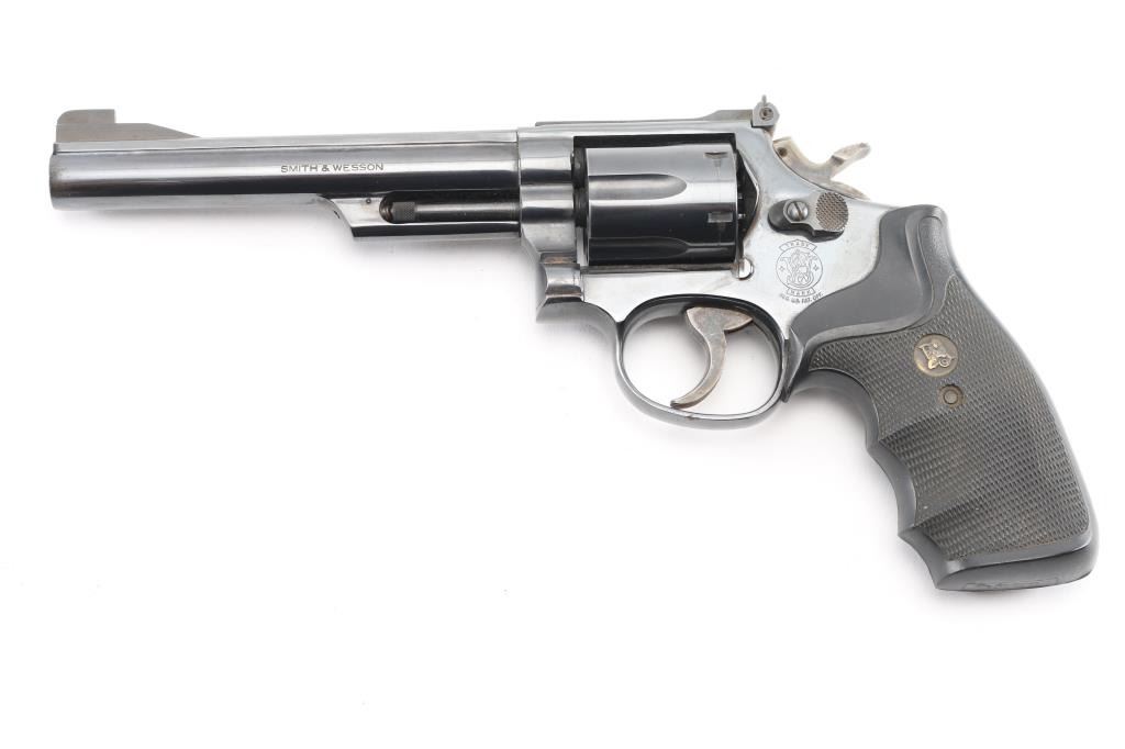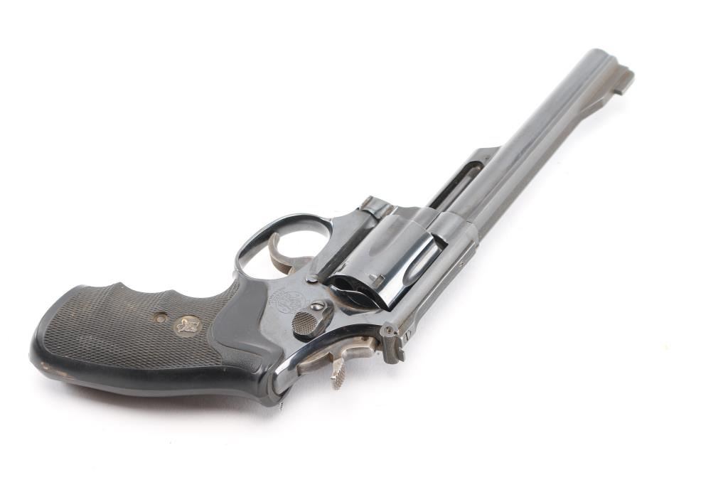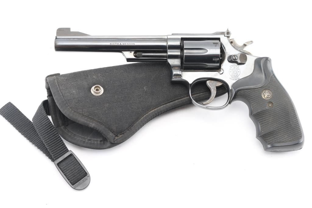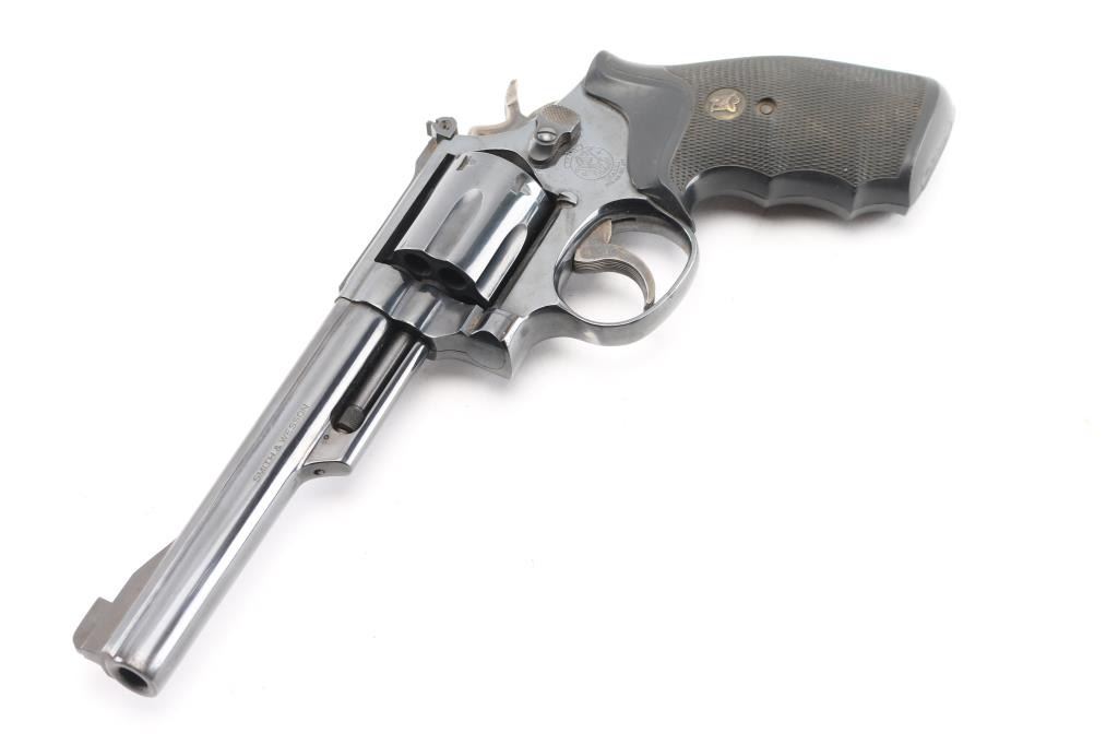 American made 6 shot revolver chambered for .357 magnum ammunition. It features a blued finish over a K target frame, a 6" barrel, black raised blade front sight, adjustable black rear sight, 6 shot fluted cylinder, and color case hardened hammer and trigger. Trigger is serrated, knurled hammer spur. Black rubber Pachmayr "checkered" finger groove grips. Bore and cylinders look great, bright. Metal finish looks great with only a faint drag line on the cylinder, and very minor area of pitting at the muzzle, barely noticeable. Grips are very good. Comes in a black nylon holster. Condition is NRA Very Good. Modern Firearm.