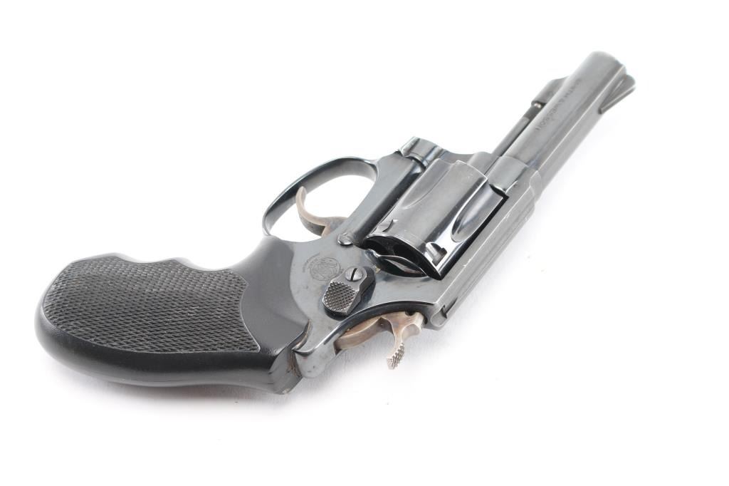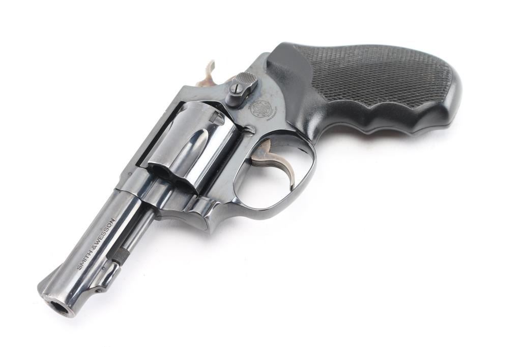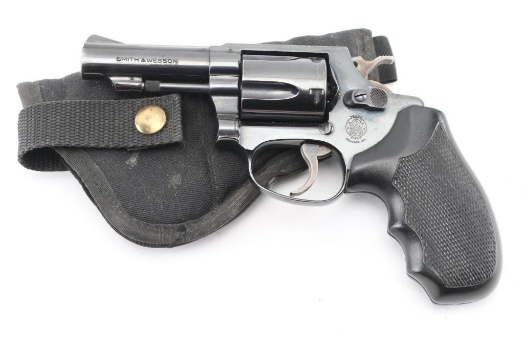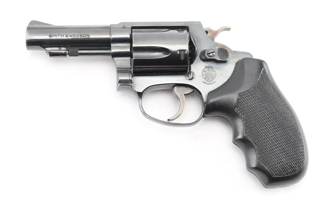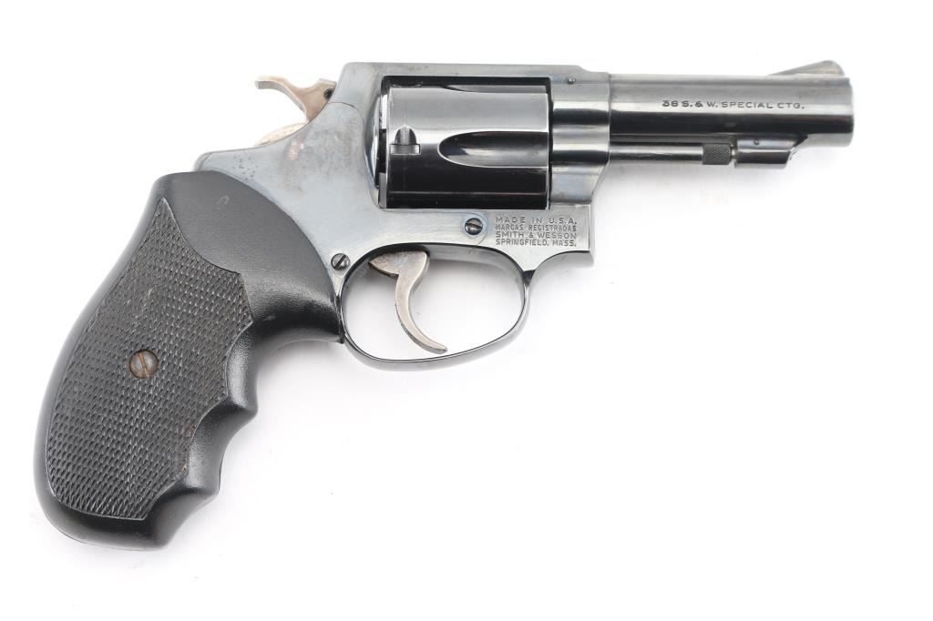 'The .38 Chiefs Special', Pinned Barrel, older all machined construction, Small frame double action revolver. Features a blued finish, Desirable 3" barrel with serrated ramp front sight, square notched rear sight, non-shrouded ejector rod, fluted five-shot cylinder, serrated trigger, service hammer with knurled spur, three screw round butt J frame and two-piece checkered black rubber, finger grooved grips. Bore and charge holes are very good/bright. Retains 90% blue with a couple of minor scratches, minor muzzle/edge wear and a small patch of pin-prick pitting on the left frame. Grips are excellent, Action is smooth with tight lock-up. Comes in black nylon holster. NRA Condition-Good. Modern Firearm.