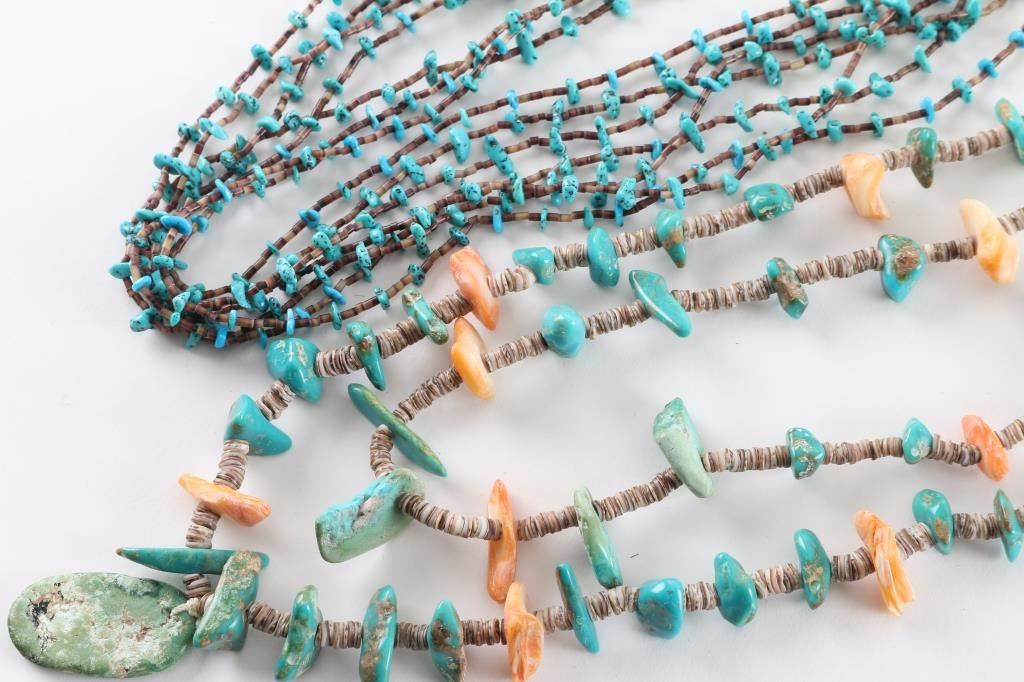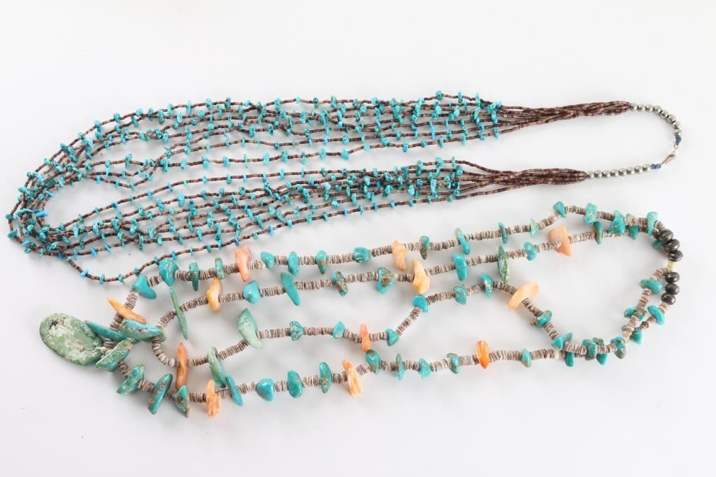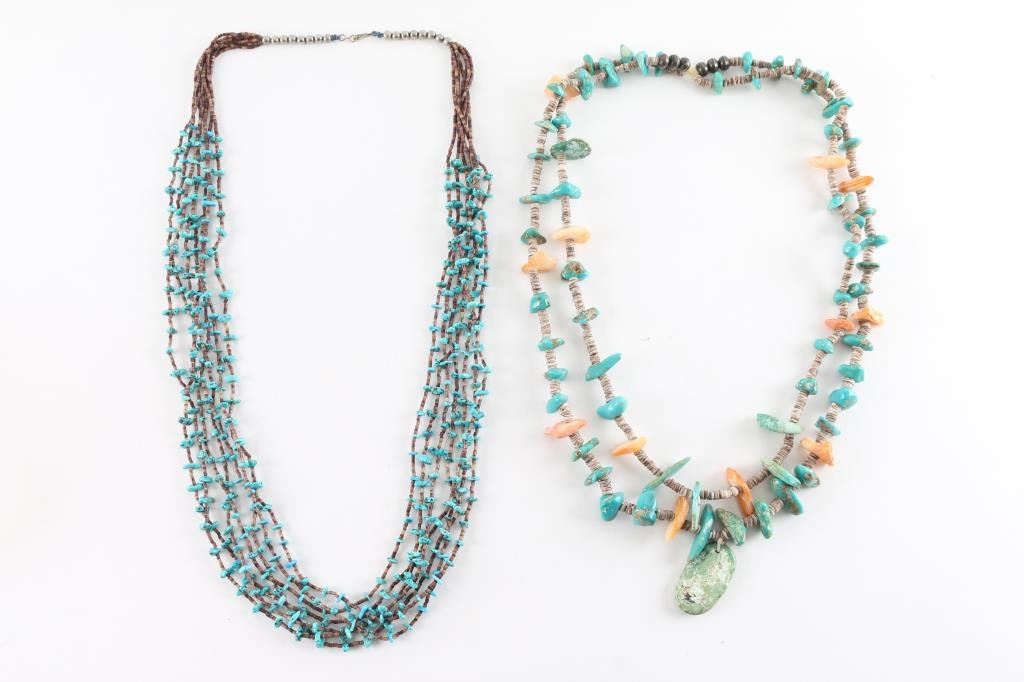 (1) Seven strand small turquoise and heishi necklace. (1) Coral, turquoise and heishi two-strand beaded necklace.