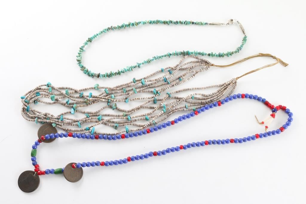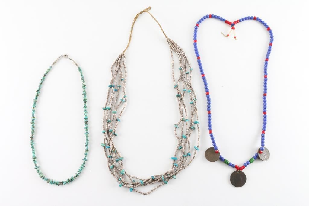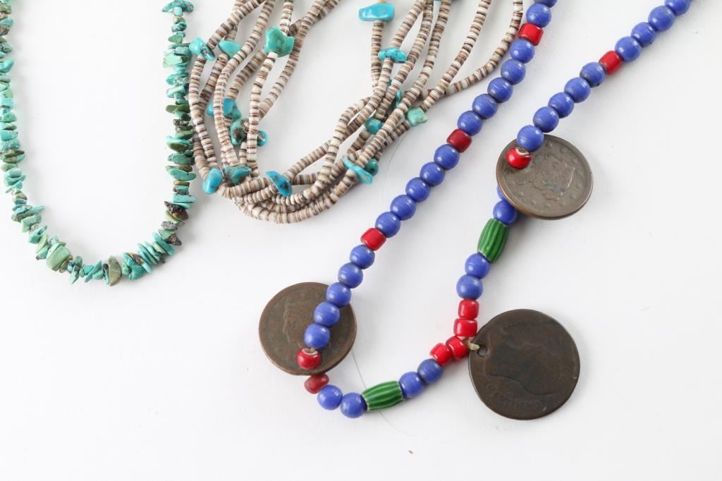 (1) A glass and trade-bead necklace accented with vintage French coins (1) 6-strand turquoise and heishi bead necklace (1) Single strand turquoise necklace