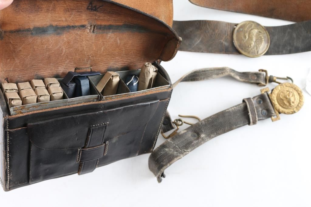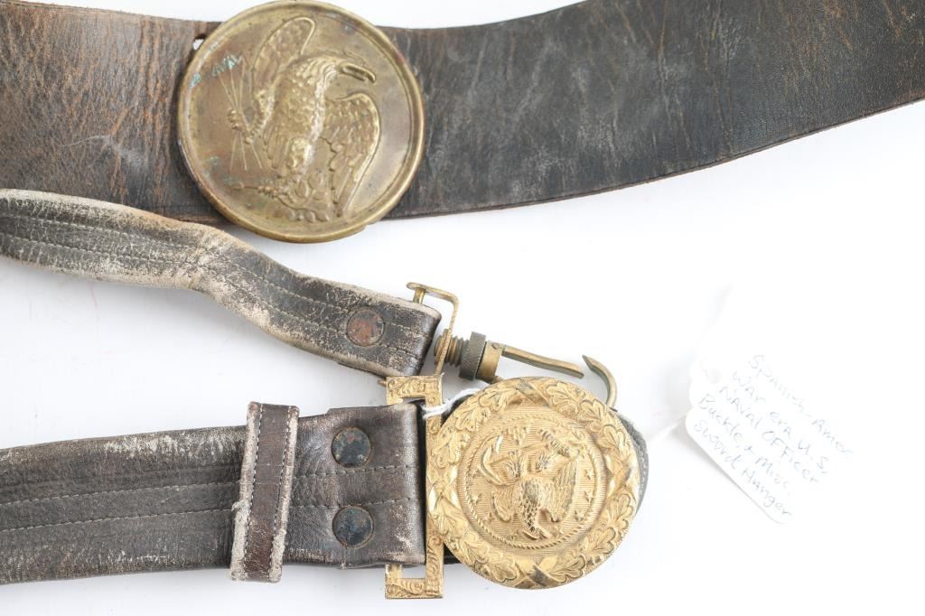 Leather cartridge box with brass US plate and eagle plate on strap also included is Spanish American war era US Naval officer Buckle and sword hanger missing parts.