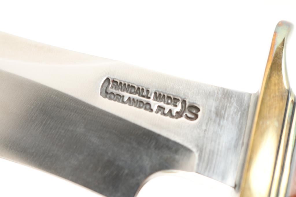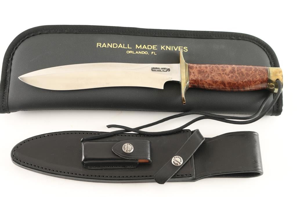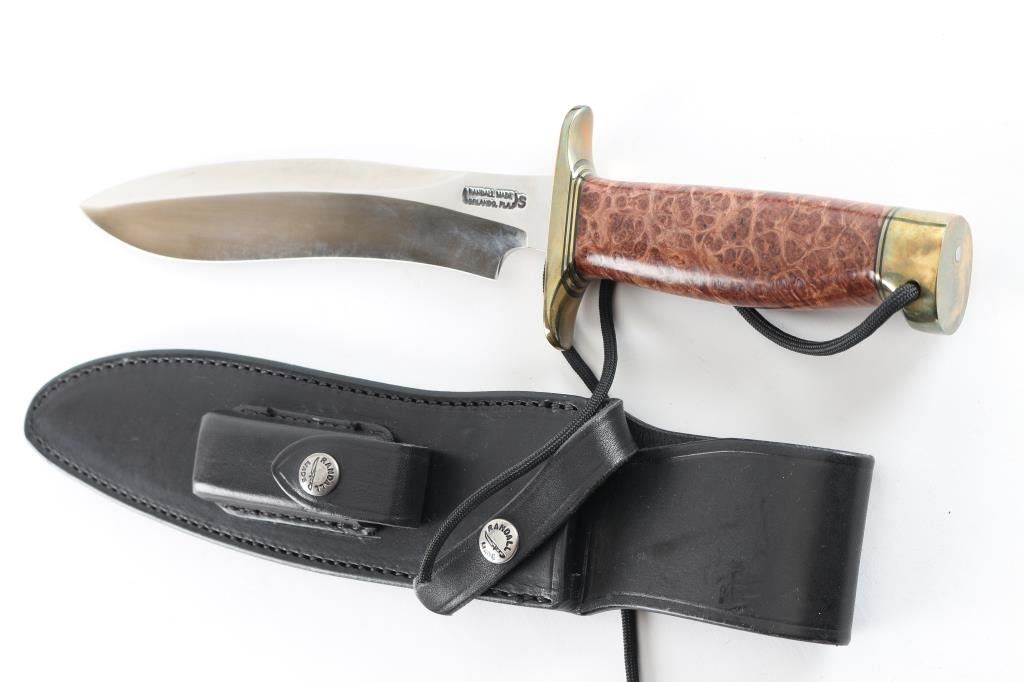 8" blade of 1/4" stock. The top cutting edge sharpened approximately 5 inches. Brass double hilt. Approximately 4 3/4” to 5” Burl wood handle. Scalloped collar butt cap. Comes with black leather sheath and sharpening stone.