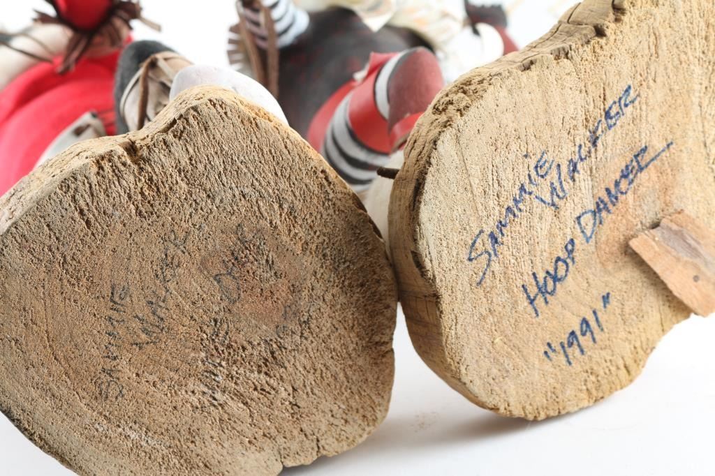 Both are hand-signed by Sammie Walker, master carver of Kachina dolls who grew up in Arizona, the Clown White Ogre (24"x6") and the Hoop Dancer (21"x6")[minor damage to hoops]..