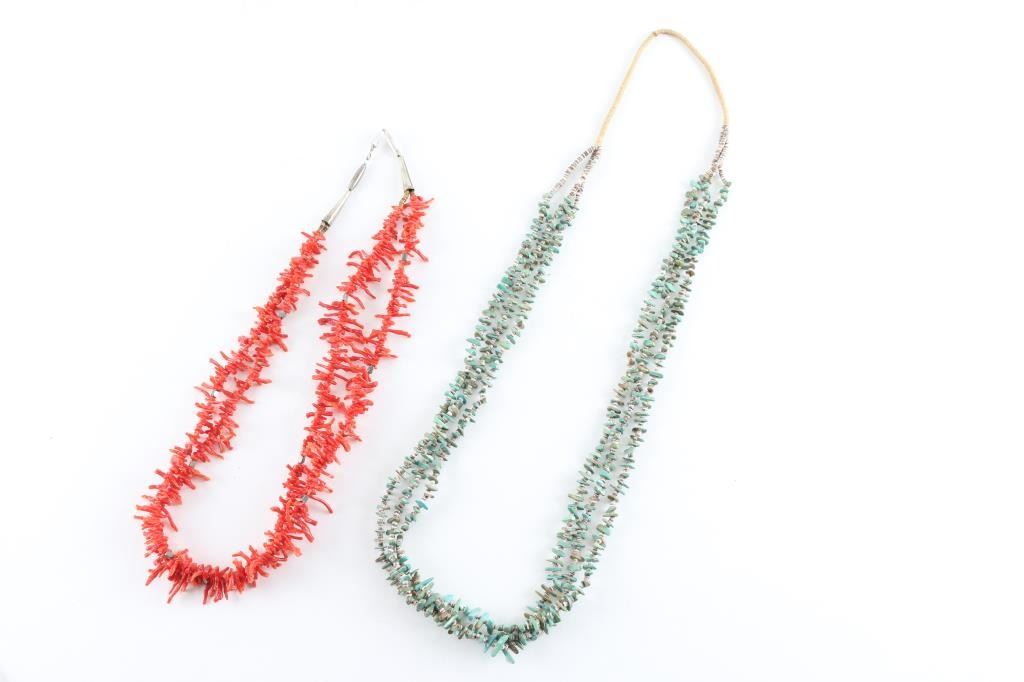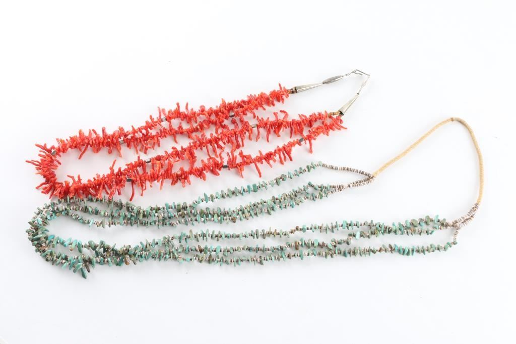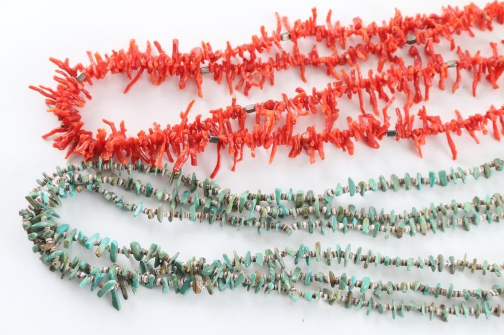 (1) 2-strand branch coral beaded necklace (1) 3-strand Green turquoise & coral beaded necklace