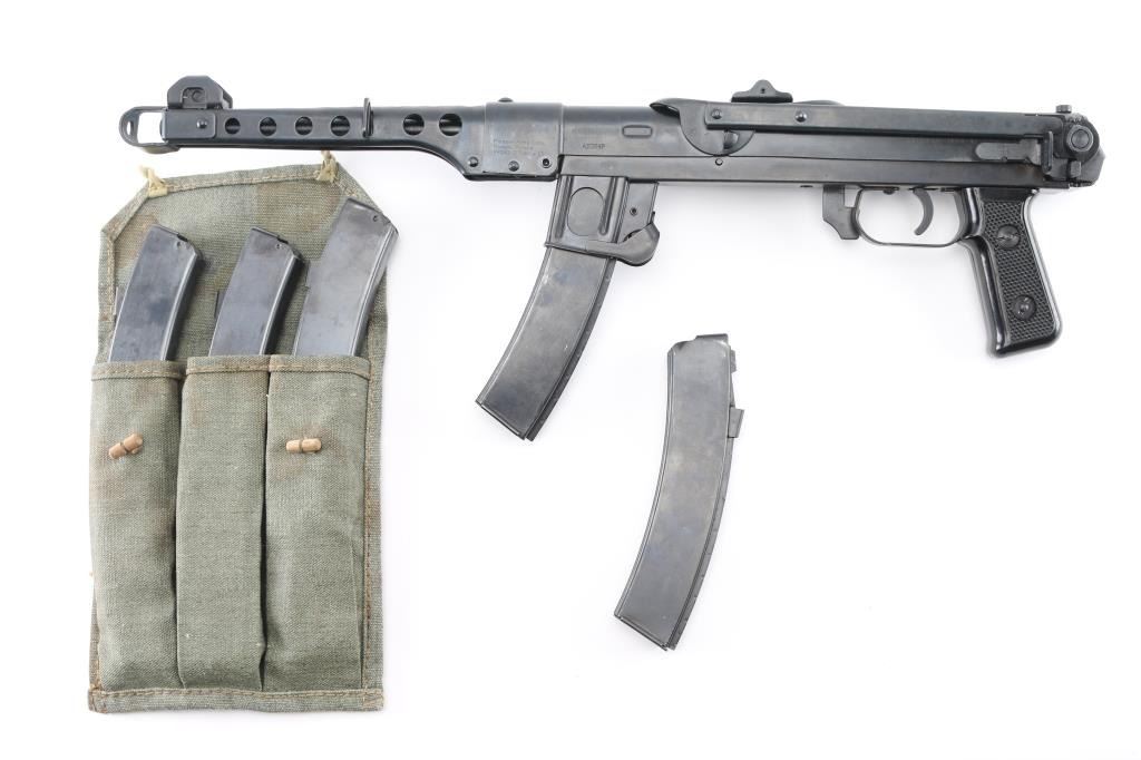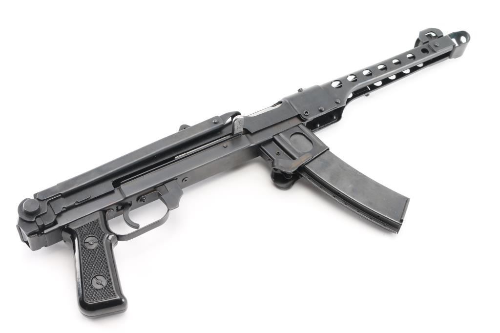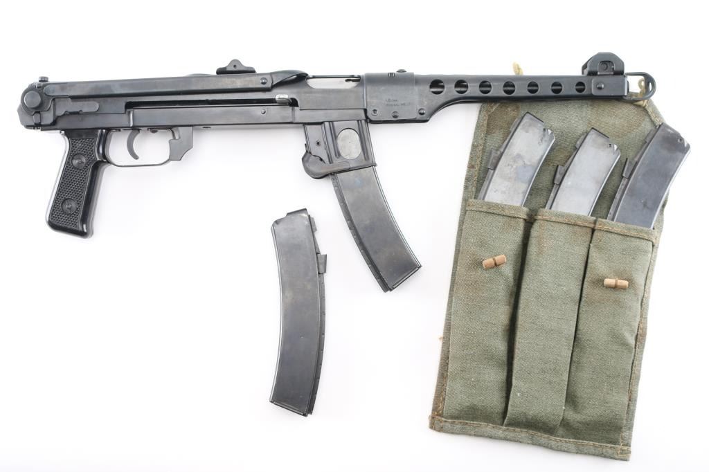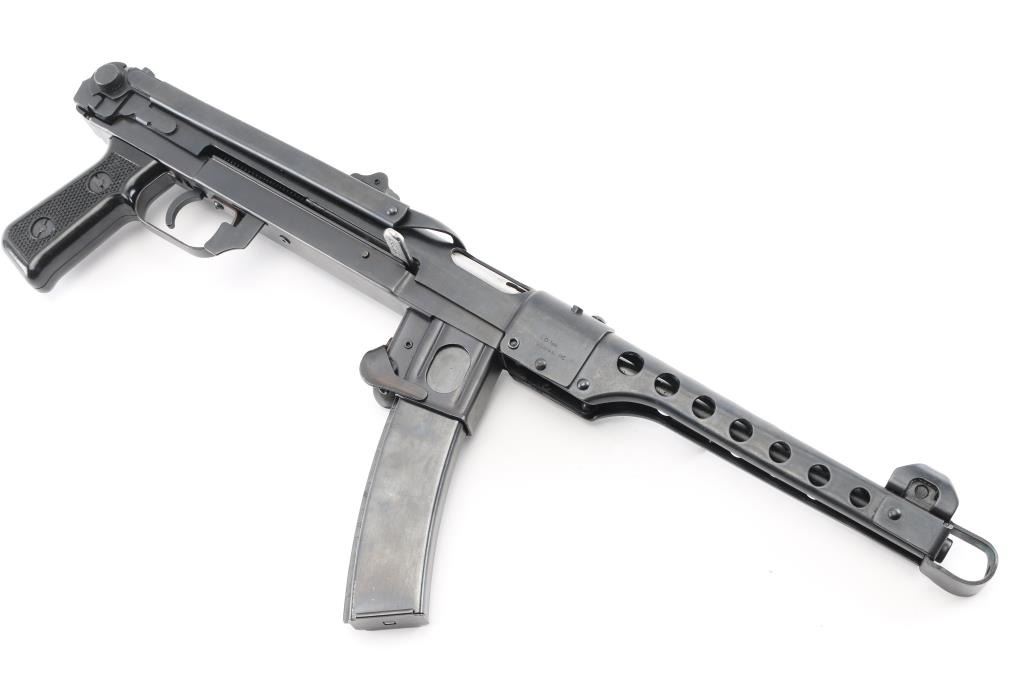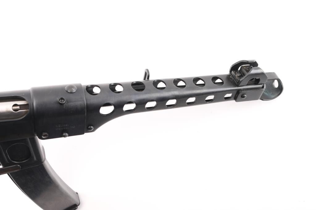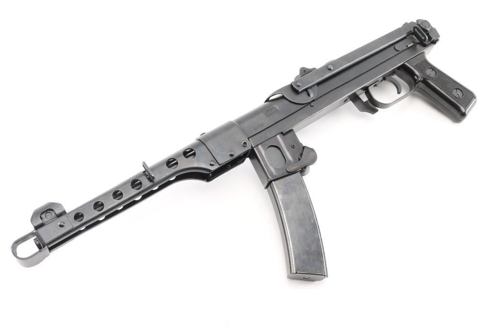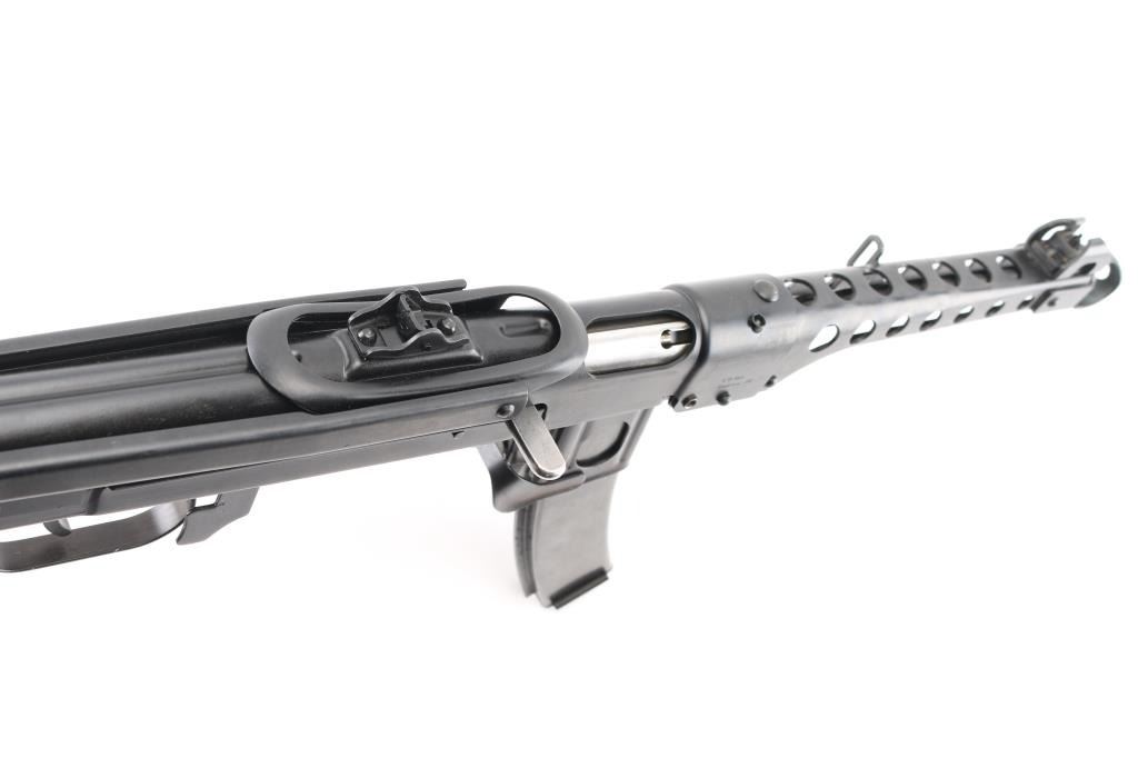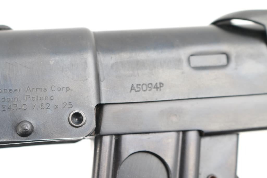 SN: A5094P Semi-automatic pistol. Styled after the Russian PPSH 41 Submachine gun. Built in Radom, Poland. Blued metal finish with a non-working metal folding stock. 9 1/2" round barrel. Ventilated barrel shroud with elevation adjustable front sight blade and notched flip rear sights. Thumb safety inside triggerguard. Importer /maker marked and SN on barrel shroud and under charging handle. Bore is bright/clean. Action is smooth/tight. Blued finish is about 98%, with a couple of minor rub marks on upper receiver. Comes with five magazines, (3) 35-rd in canvas mag pouch and (2) 30-rd magazines. NRA Condition is Excellent. ***Modern Firearm***