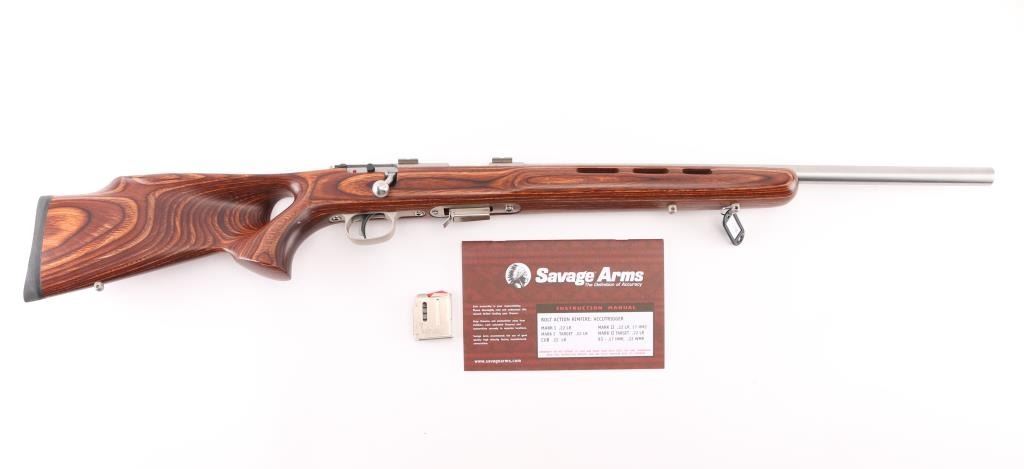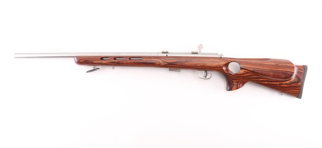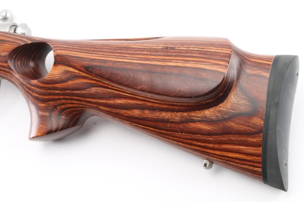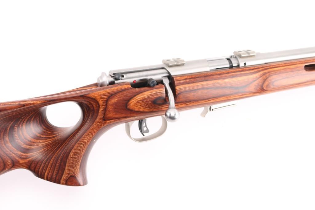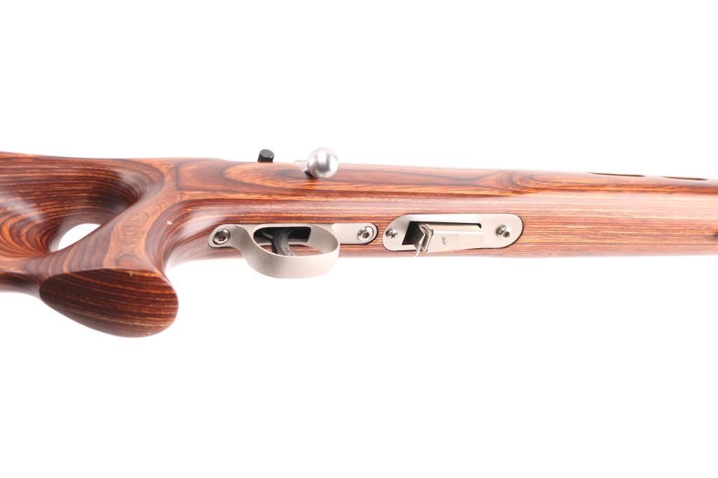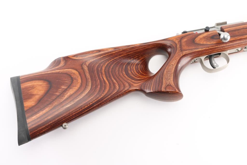 Optics ready bolt action rimfire rifle with 21" stainless steel heavy barrel with recessed crown, brown laminated thumb hole stock with three swivel studs attached, one detachable magazine, Accu-trigger, no provision for sights, two scope bases attached to receiver, and a black rubber recoil pad. Metal finish looks great. Laminated stock is excellent. Bore is pristine. LOP is 13.50". Comes with manual and extra magazine, (2) total. Condition is NRA Excellent. Modern Firearm.