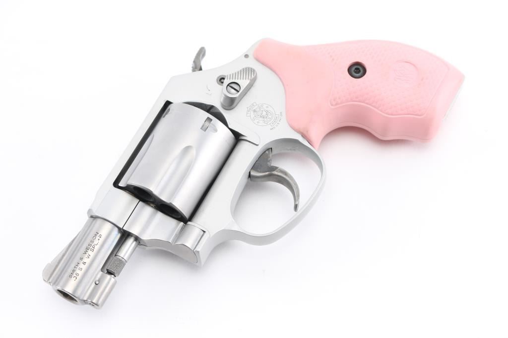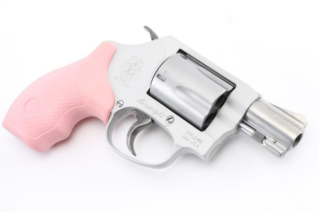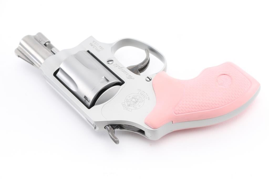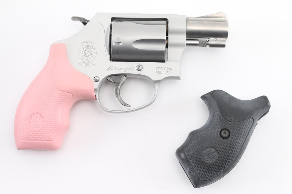 'Airweight' Double action revolver features 1.875" barrel with fixed sights, 5 shot swing out cylinder, internal lock system, "Airweight" frame, pink rubber compact grip. Finish is stainless, with matching color on alloy frame. Bore and chambers are very good condition. Overall condition is excellent, with handling marks, drag line. Includes original factory plastic box with paperwork, two keys for internal locking system, spare set of (black) grips. Condition is NRA Excellent *** Modern Firearm ***