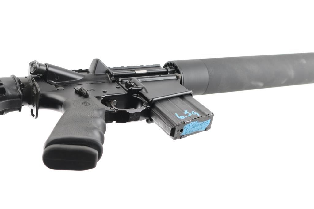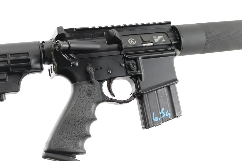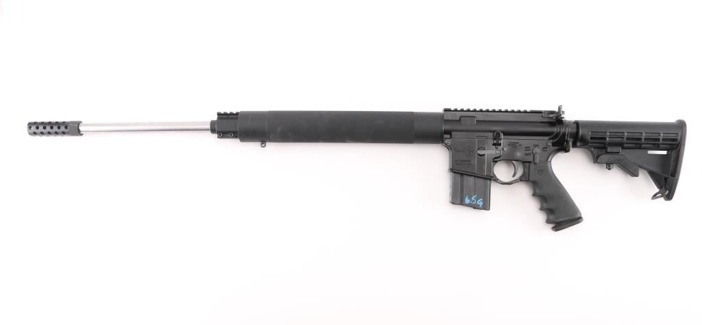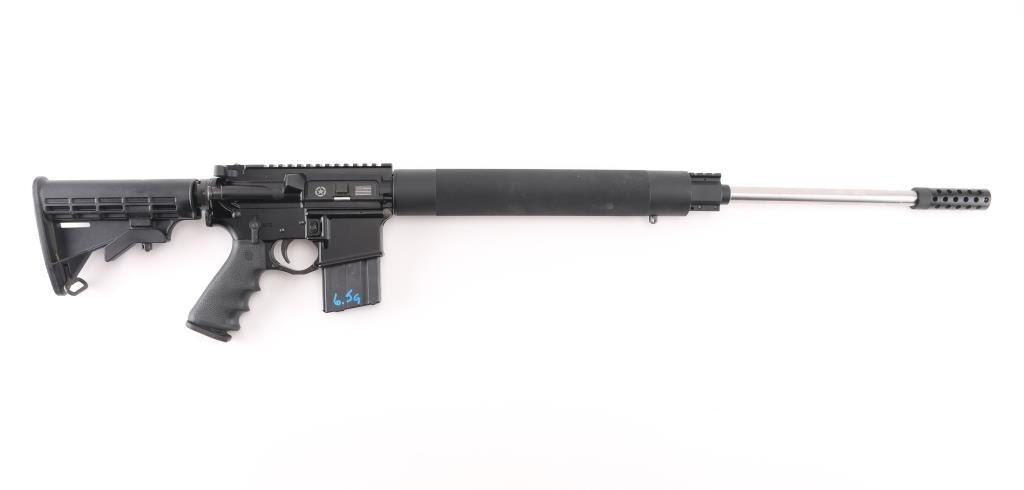SN: 0002492. SI-F lower from SI Defense, a Montana-based gun maker. This rifle is chambered in 6.5 Grendel and has a mid-length gas system. Shell deflector, forward assist Dust cover has the American Flag, Arizona flag, etc. Features include a 5 position adjustable stock, 12.5" round steel handguard, Hogue pistol grip, 3.50 lb pull cassette trigger, and a charging handle with extended large charging latch. 24" stainless steel barrel with a WCI 6.5mm ported muzzle break. Upper is Cerro forged with keyhole mark, integral picatinney style rail. This rifle is in very good condition. Bore is excellent/bright, metal finish is near excellent with a few very minor scratches, comes with one 20-round magazine. NRA Condition-Excellent. Modern Firearm.