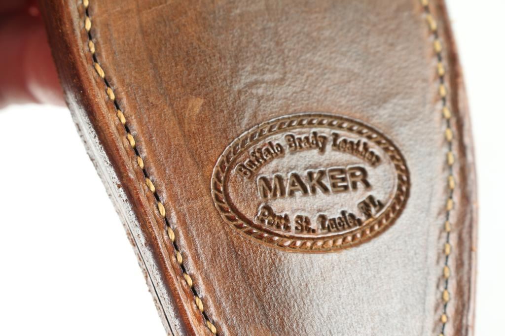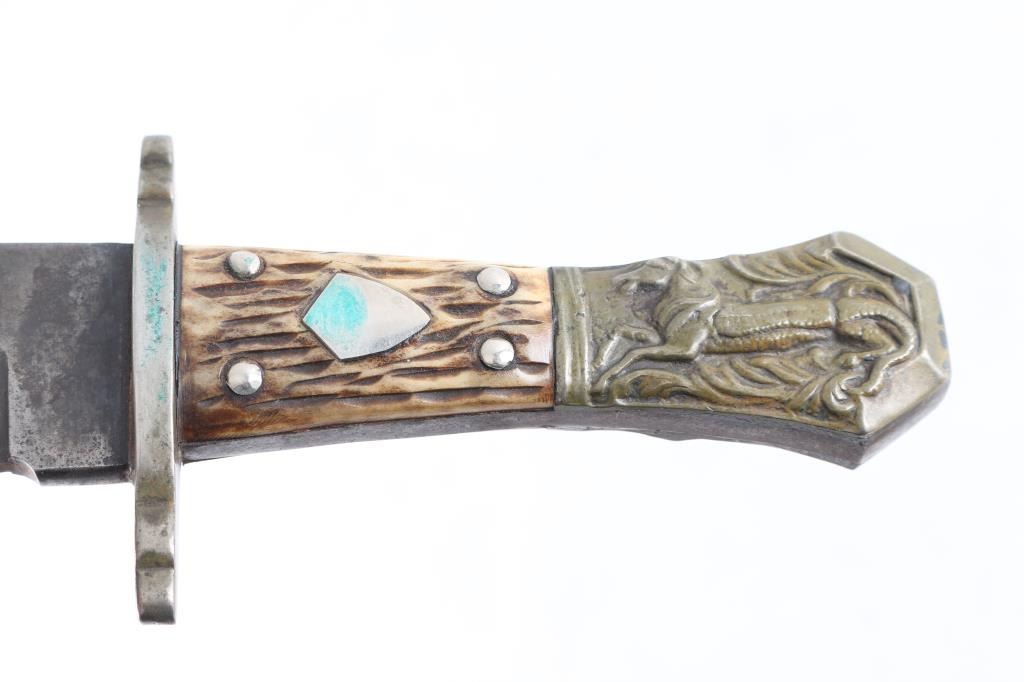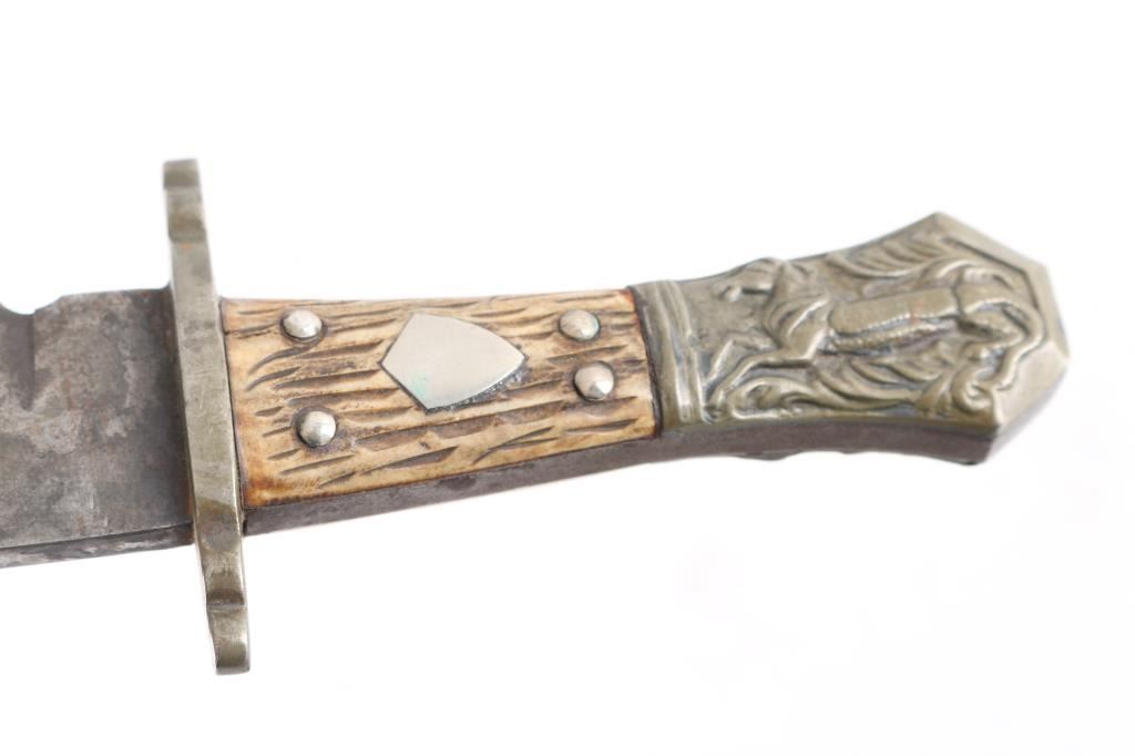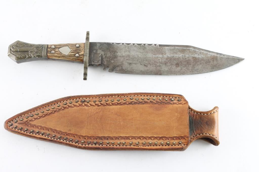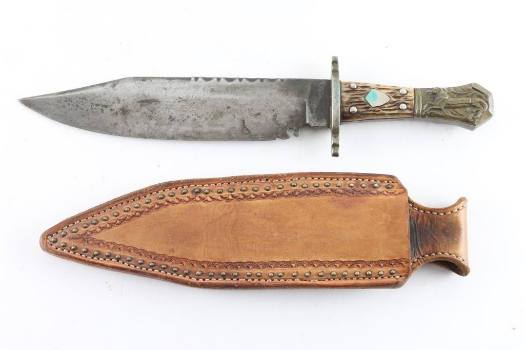 in very good condition, unmarked, with "Half Horse - Half Alligator" motif on pommel, per a quote attributed to Mike Fink, by Davy Crockett in his almanac, that Fink stated "I am half horse, half alligator,. and I can whip any man on the Mississippi, by God!". Heavy notch-back blade is 9.25" long, 2" wide, 3/10" thick, 13-7/8" overall, clip point, Spanish notch, German silver (or actual silver) finished brass fittings, stag scales with inset shields. Blade shows grayish color throughout, with fading of plated fittings. With a "Buffalo Brady Leather" studded leather belt sheath.
