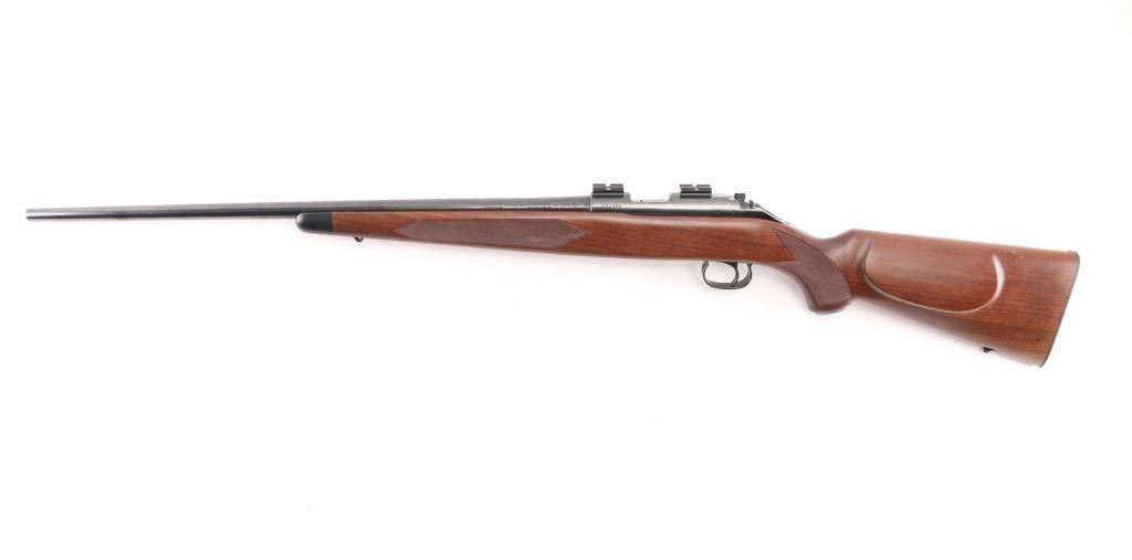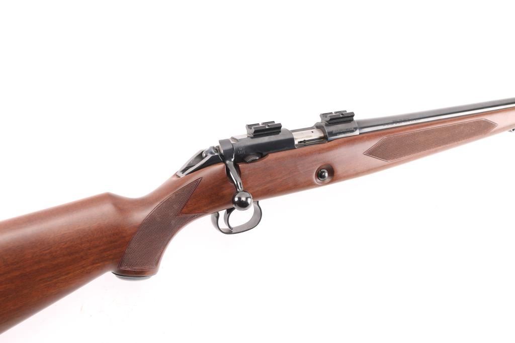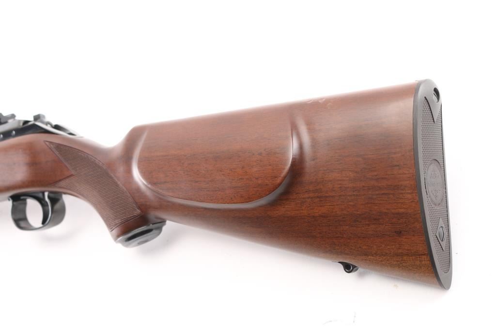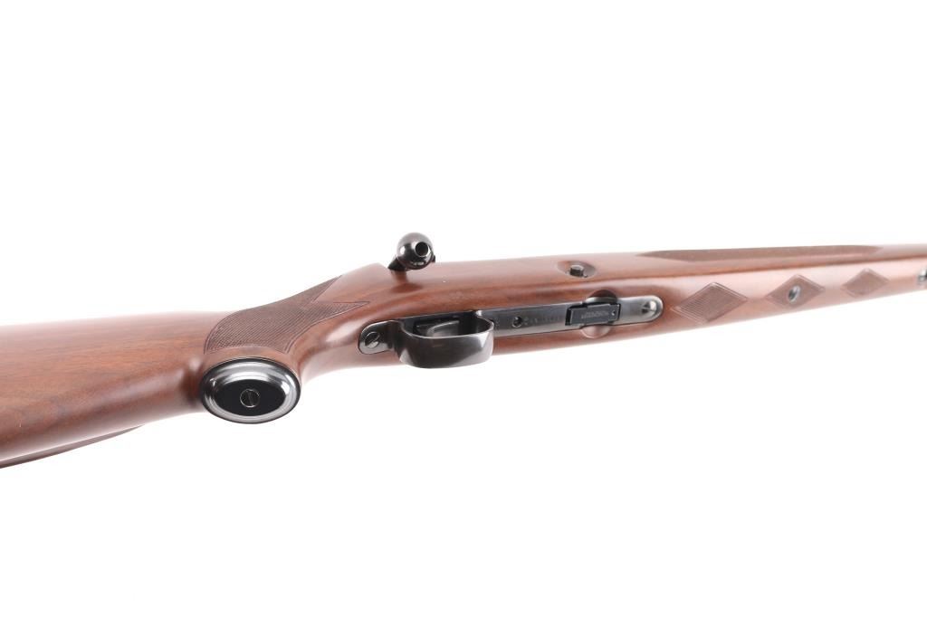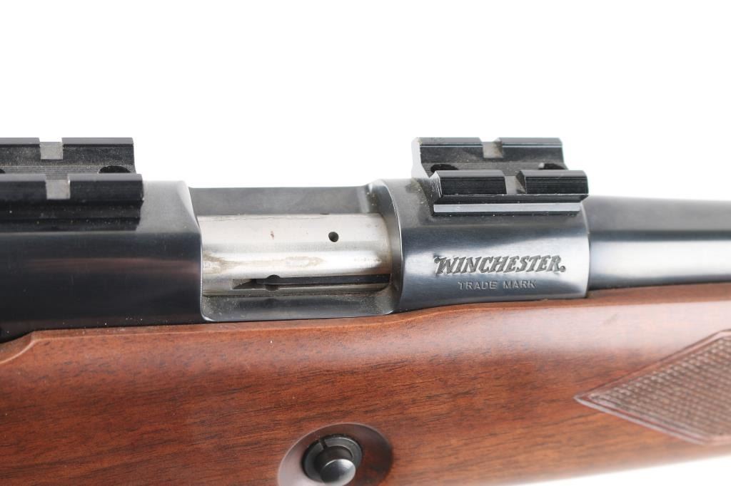 Bolt action rifle made in Japan for Winchester. Features blued finish, checkered walnut stock, right hand cheekpiece, checkered steel buttplate, 24" tapered barrel, no sights, receiver drilled & tapped with two piece Weaver rail sections attached, manual safety, push button release on right side of stock for detachable magazine, European style inlet oval base sling studs. Bore is very good condition. Retains 95% blued finish with few handling marks. Wood is very good condition with several dents, some discoloration and minor shrinkage at toe. Includes (1) magazine. Condition is near NRA Excellent *** Modern Firearm ***