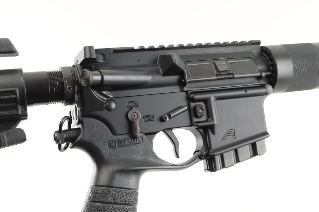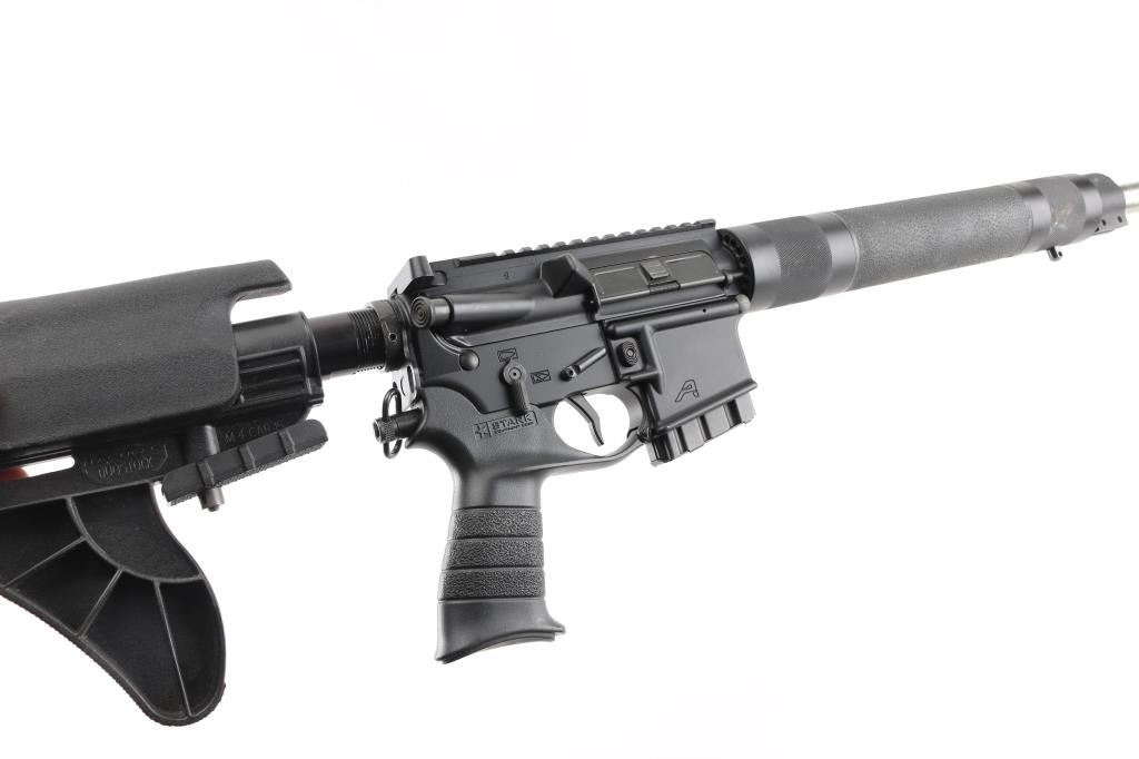 Semiautomatic AR15 style rifle with many premium components. Features matte black finish, 24" heavy stainless steel Stag Arms 1/8 barrel, keyhole marked (Cerro Forge) upper receiver with Picatinny rail top, 12.5" Round steel Hogue handguard, collapsing Tactical Duostock, 3.50 lb pull cassette trigger, Stark pistol grip. Ambidextrous safety, shell deflector, forward assist Overall excellent condition, bore is pristine. Comes with one 10 rd magazine. NRA Condition-Excellent. Modern Firearm.