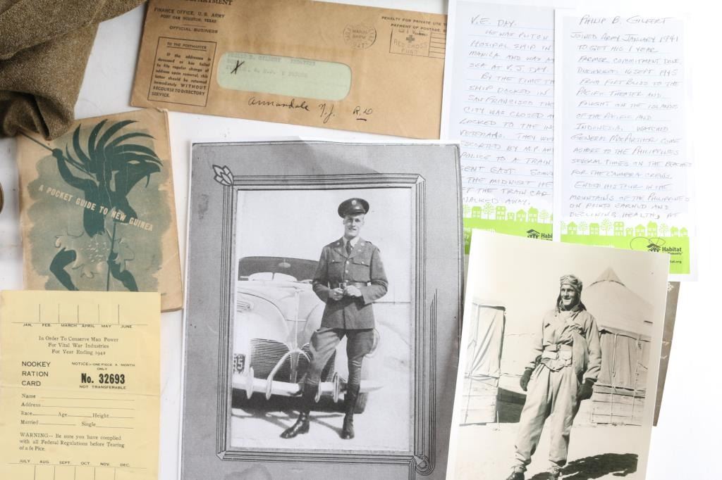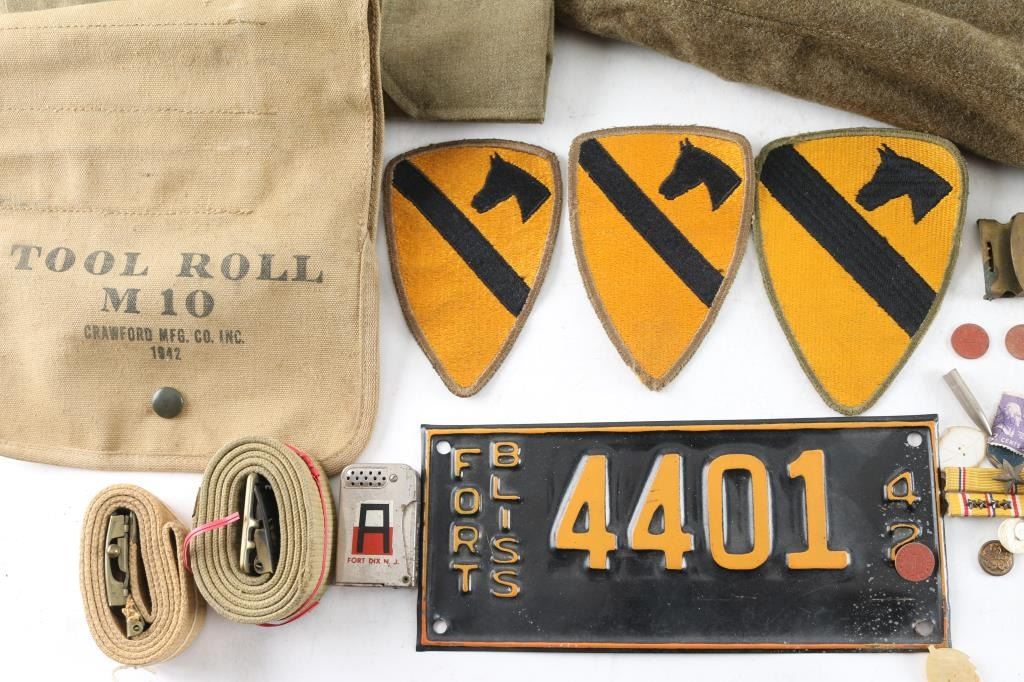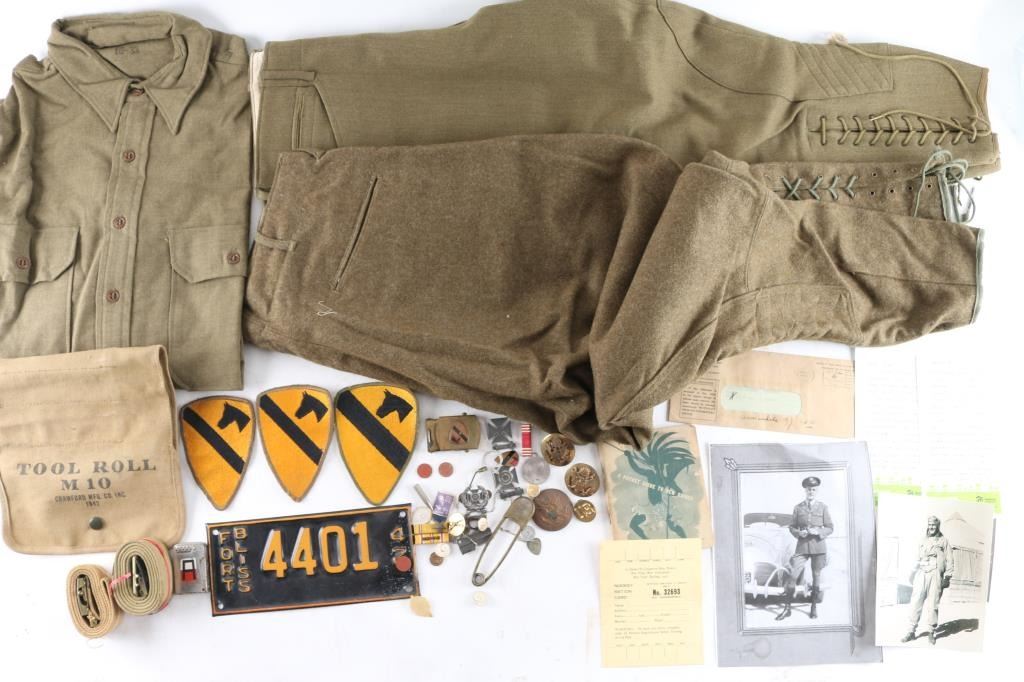 Great lot of WW2 1st Cavalry Division soldier who fought in New Guinea, the Admiralty Islands, Leyte, and Luzon, Phillipine islands.. Corporal Phillip B. Gilbert who was a mortar man serving in the 8th cavalry regiment.. He enlisted pre-war in January, 1941 and was discharged on 16th September, 1945. A brief history of his service, including witnessing MacArthur wading ashore, etc, written by his nephew is provided. Lot includes his uniform shirt, two pairs of Cavalry M1908"Jodhpur" riding pants, three WW2 1st Cavalry Division patches, rare 1942 dated army issued :Fort Bliss" license plate, pre-WW2 round dog tag with his name and service number, two eagle cap badges with his US, and crossed swords collar devices, Nookey ration card, copy of his discharge, two photos of him in uniform, one copy, one original, 42 dated M10 tool roll, pre-war rare "Team Super" Austria cigarette lighter "Fort Dix N.J." with 1st army insignia, brass army belt buckle and pin with 1st cavalry insignia with red horses head and star on black stripe, believe pre-war, Expert badge with mortar bar, Sharpshooter badge rifle bar, and Marksman badge with Pistol-D bar, good conduct ribbon, American defense ribbon, pacific campaign ribbon with 4 battle stars, 3 IJA brass buttons, two navy, one army, Japanese 6.5mm bullet, pulled brass grenade pin. and other misc. pieces, ration tokens, etc., Japanese 36x26 silk good luck flag, blood stained, signed by numerous men of his unit, with their home towns, good condition, intact. His nephew states his Uncle obtained this flag in the Phillipine Islands, the 1st cavalry was the first to enter Manila. A great 1st Cav, grouping.