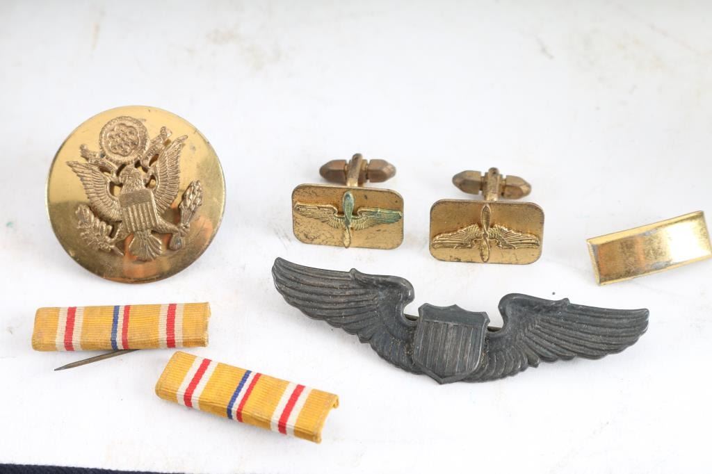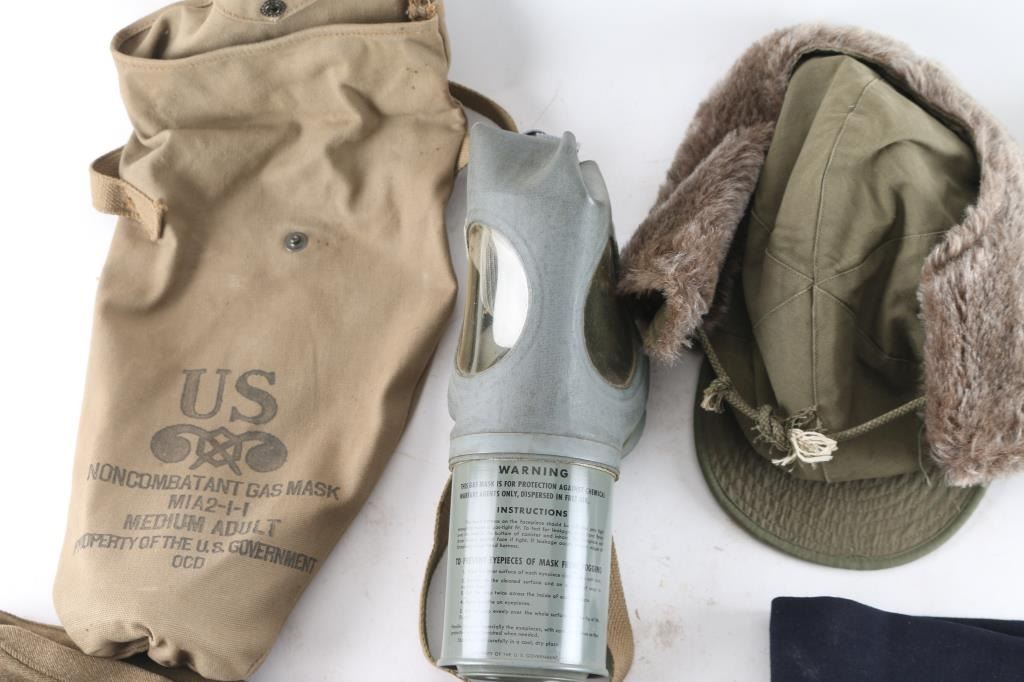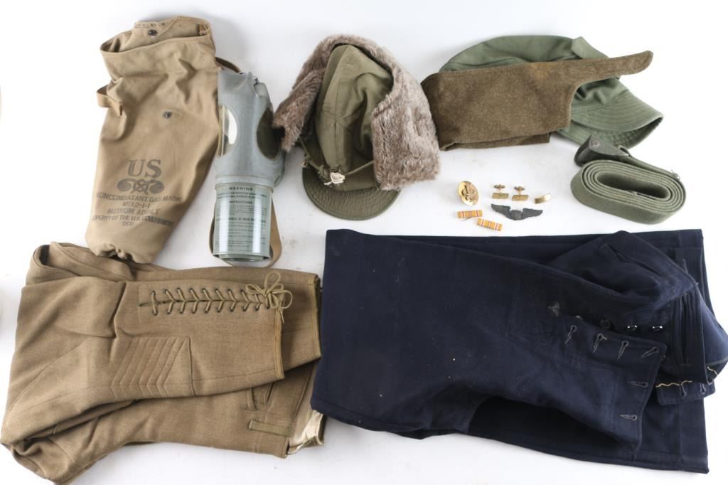Lot includes Navy blue wool dress "Cracker Jack" pant, US M1A2 11 noncombatant gas mask with pouch, Union Cap Co. M19097 Army cold weather cap, dated 1941, size 7 1/2". new, unissued condition, pair of Army cavalry Jodpur M1908 riding pants, OD pile cold weather cap with fur lined flaps, can be worn under helmet, sterling USAAF pilots wings, enlisted cap badge, USAAF cuff links, 2 Pacific campaign ribbons, single 2nd Lt's bar. These items are accompanied with several historical artifacts, including a 1942 Pocket Guide to Australia from the War and Navy Departments, a newspaper clipping from the Guinea Gold, 'In the Field' edition of March 25, 1944, "The First Was First" by Capt. Harold D. Steward, "The Story of the First Cavalry Division" printed at Santo Tomas Universityh Press, Manila, Philippine Islands, March 1945, a paper from the El Paso Herald-Post, dated June 7, 1944 with the headlines, "Eisenhower Reports 'Progress' INVADERS ADVANCE; MORE AIR TROOPS POUR INTO FRANCE", El Paso Times showing "Yankee Road Sign In Tokyo - 1st Cavalry Division", a newspaper called YANK, published from 'Down Under' on December 3, 1943 and more.