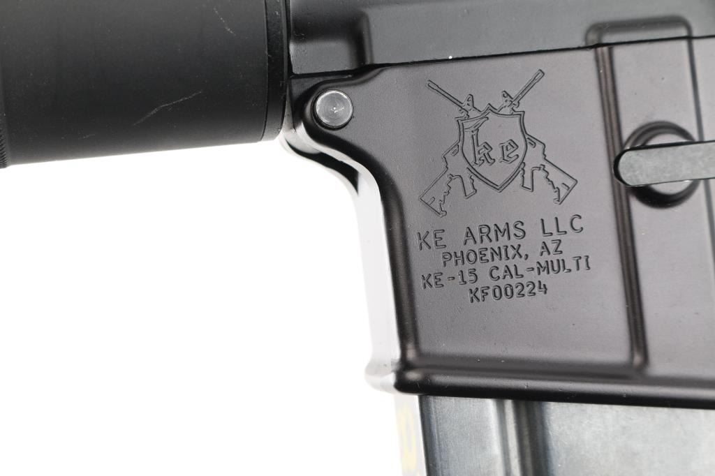 Semiautomatic AR15 style rifle. Features matte black finish, 22" stainless steel barrel with A2 style flash hider, keyhole marked (Cerro Forge) upper receiver with Picatinny rail top, 12.5" Round fluted steel handguard, collapsing KE Arms Tactical stock, 3.50 lb pull cassette trigger, Magpul pistol grip. Charging handle with extended large charging lever. Ambidextrous safety, shell deflector, forward assist Dust cover marked with caliber, right magazine well marked friends of the NRA. Overall excellent condition, there is a small area of finish loss under the dust cover, bore is pristine. Comes with one 20-Rd magazine. NRA Condition-Excellent. Modern Firearm.