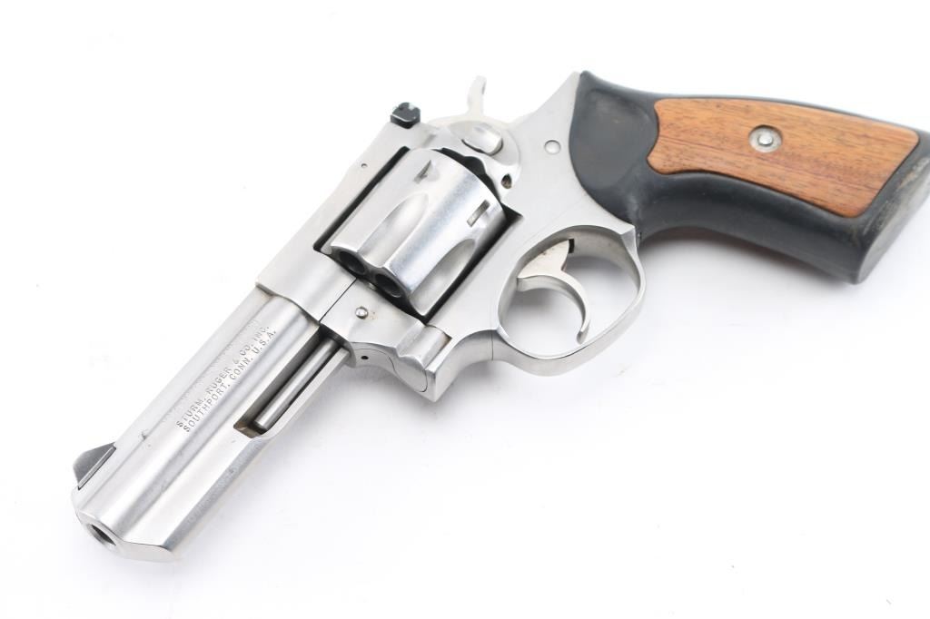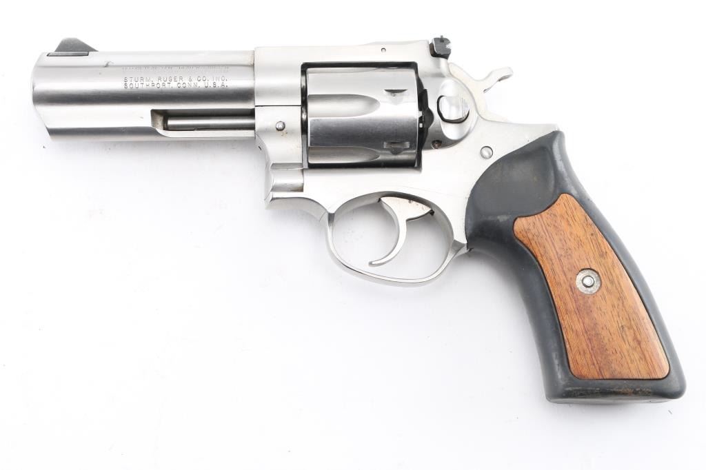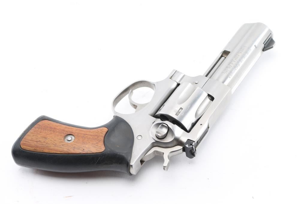 American made stainless steel double action revolver chambered in .357 Magnum, manufactured circa 2006. Features a brushed finish, 4" full lug barrel, with dovetailed blade front sight, adjustable rear sight, smooth trigger, knurled hammer spur, fluted six-shot cylinder, and black rubber grips with smooth wood inserts. Bore is very good/bright.. Metal shows few handling marks, minor scratches. Grips are excellent condition. Action is smooth with tight lock-up. Condition is NRA Very Good. Modern Firearm